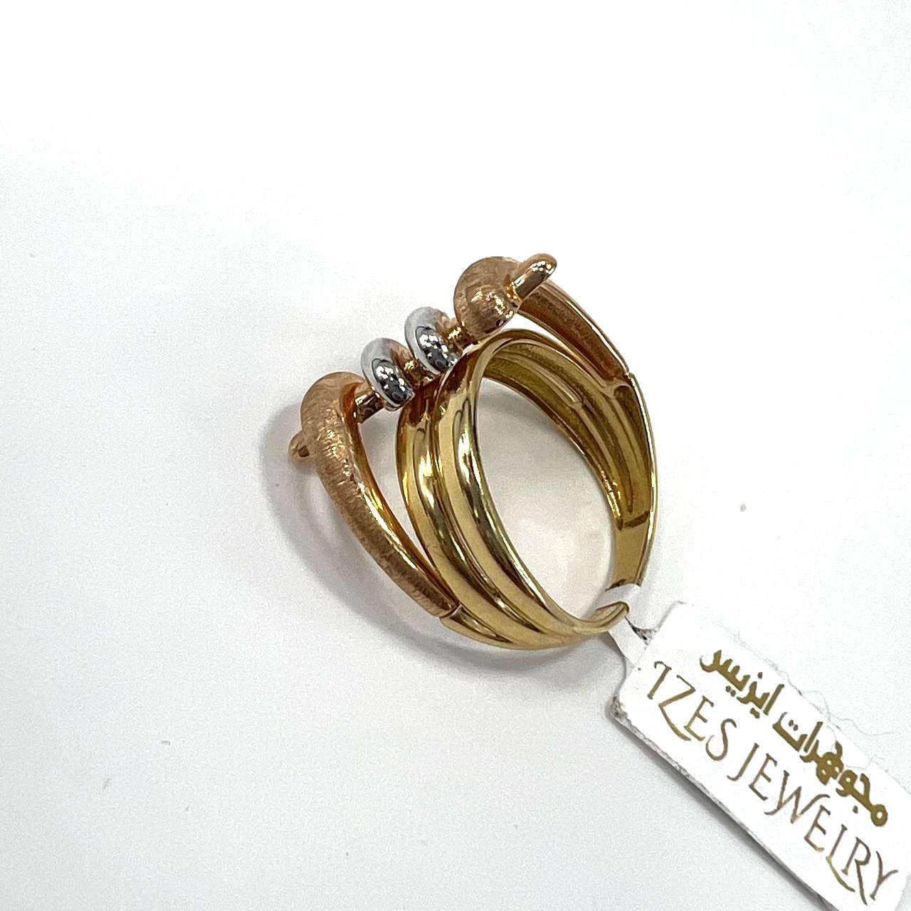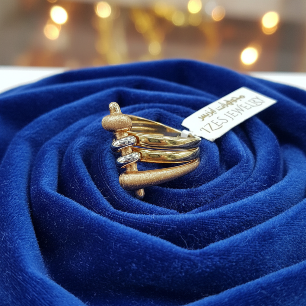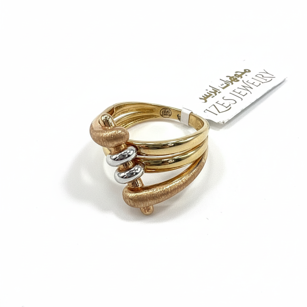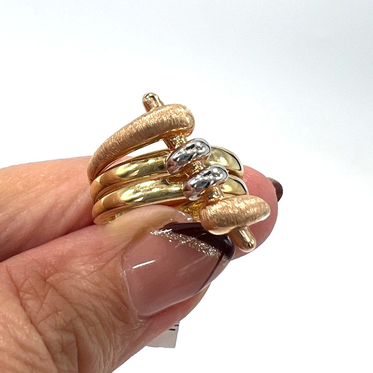Discover the beauty of this 14K Gold Multi-Band Ring, crafted from a captivating blend of yellow and white rose gold with exceptional craftsmanship and refined design. This elegant piece features a unique stacked ring structure with contrasting textures—smooth polished bands alongside brushed matte finishes—creating a luxurious balance between contemporary style and timeless sophistication. The central white-gold accents add a striking shimmer, while the bold end-caps give the ring a sculptural, high-fashion look. Lightweight yet visually impactful, this statement piece elevates any outfit with its artistic, architectural charm, making it perfect for everyday wear or special occasions. A distinctive masterpiece crafted for women who dare to stand out.