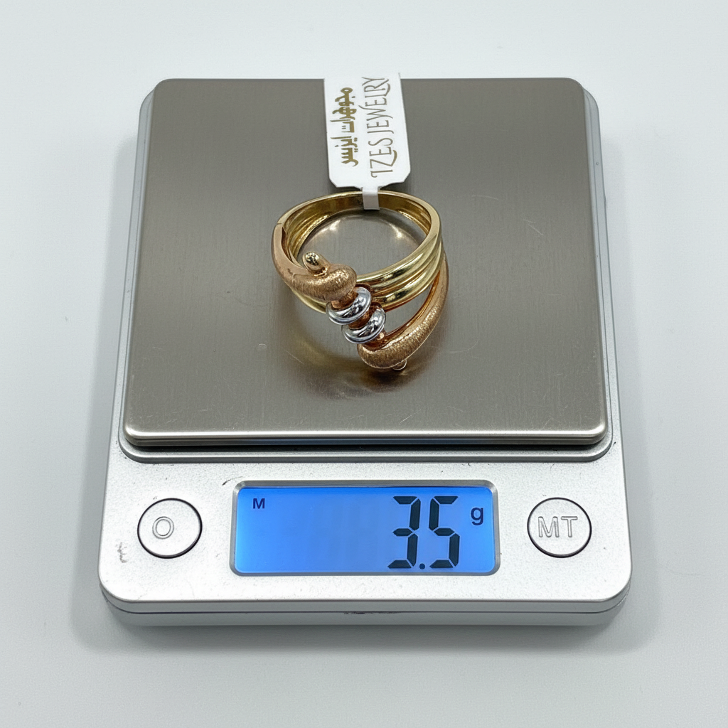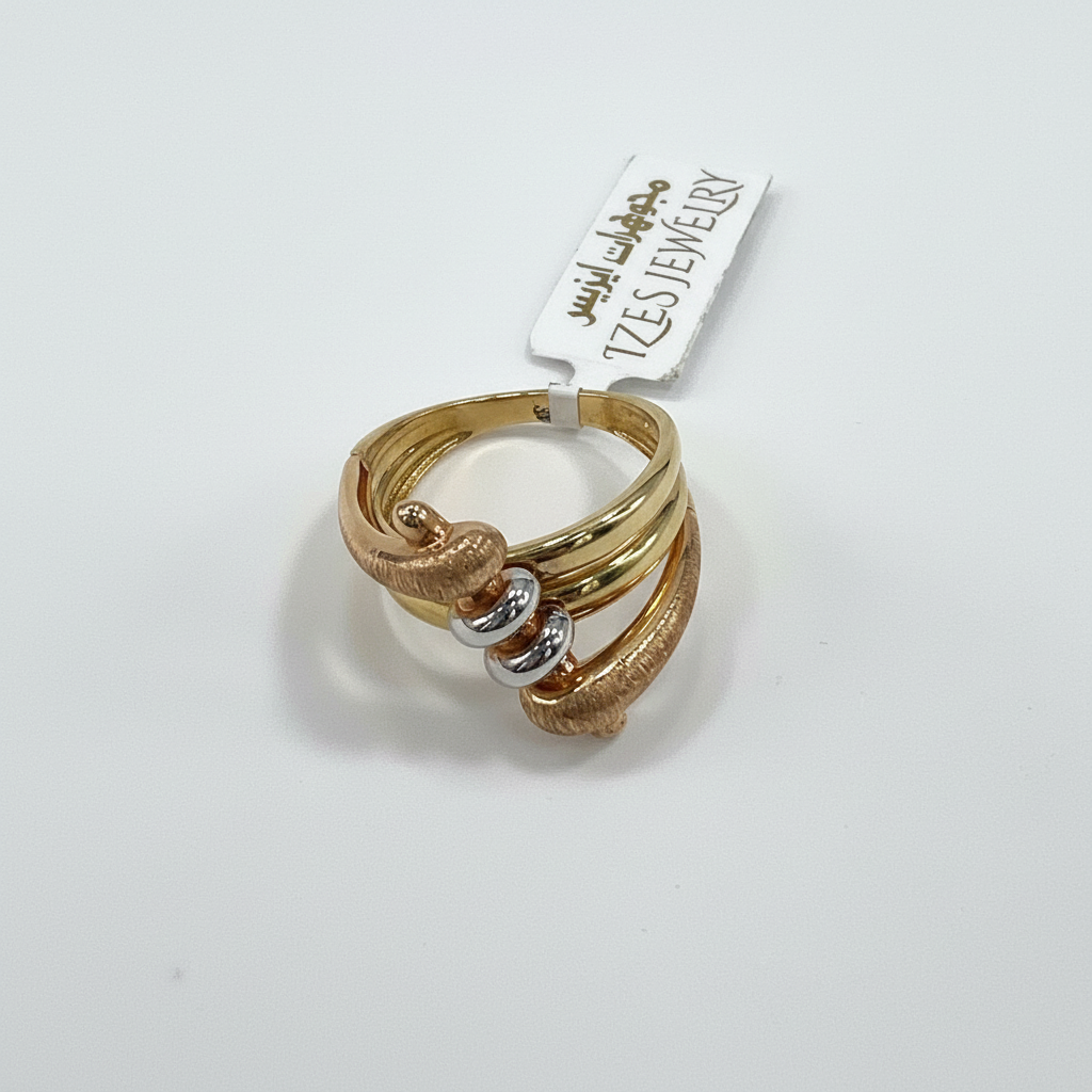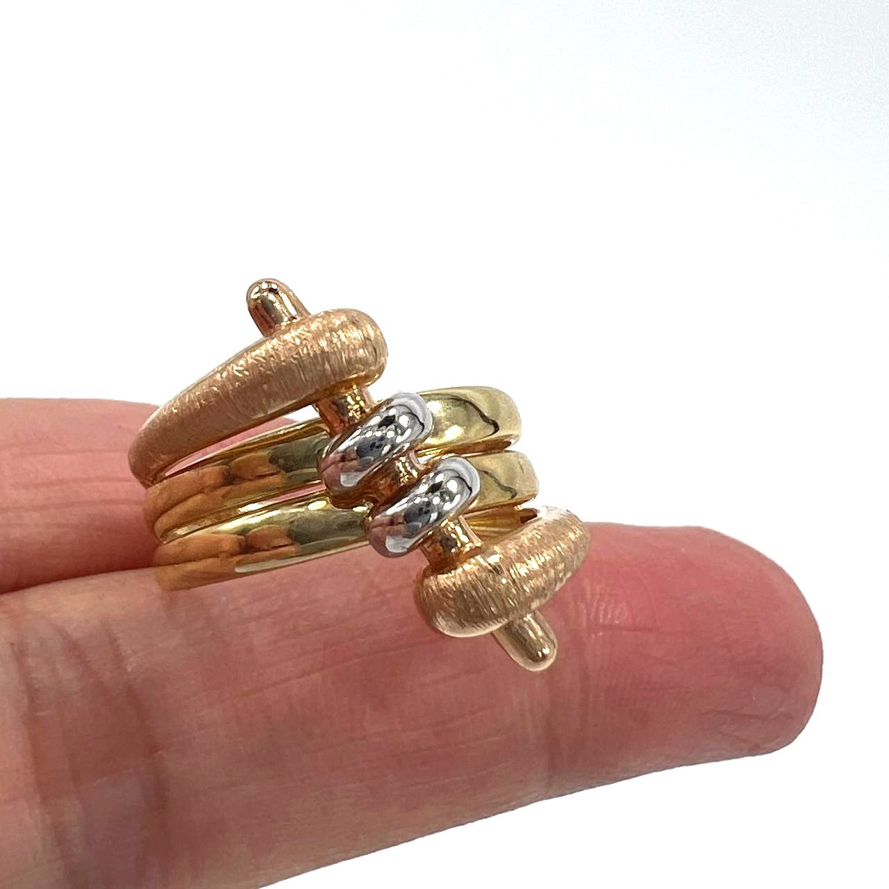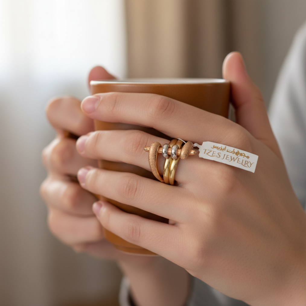 Discover the beauty of this 14K Gold Multi-Band Ring, crafted from a captivating blend of yellow and white rose gold with exceptional craftsmanship and refined design. This elegant piece features a unique stacked ring structure with contrasting textures—smooth polished bands alongside brushed matte finishes—creating a luxurious balance between contemporary style and timeless sophistication. The central white-gold accents add a striking shimmer, while the bold end-caps give the ring a sculptural, high-fashion look. Lightweight yet visually impactful, this statement piece elevates any outfit with its artistic, architectural charm, making it perfect for everyday wear or special occasions. A distinctive masterpiece crafted for women who dare to stand out.
