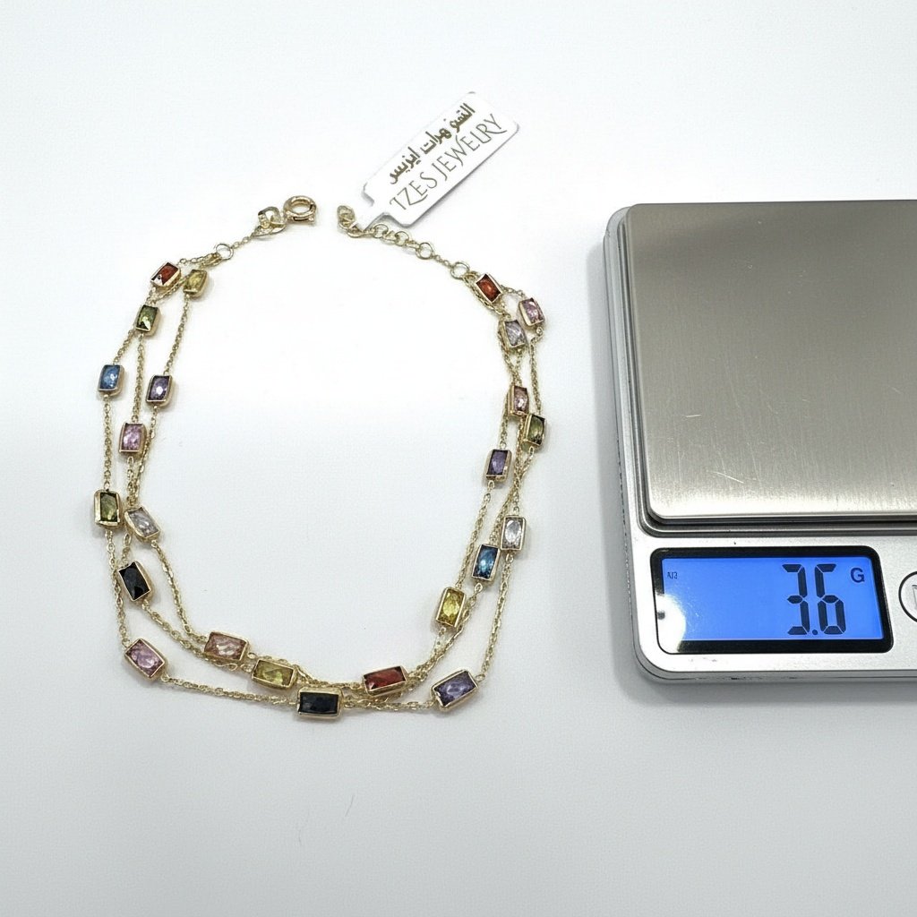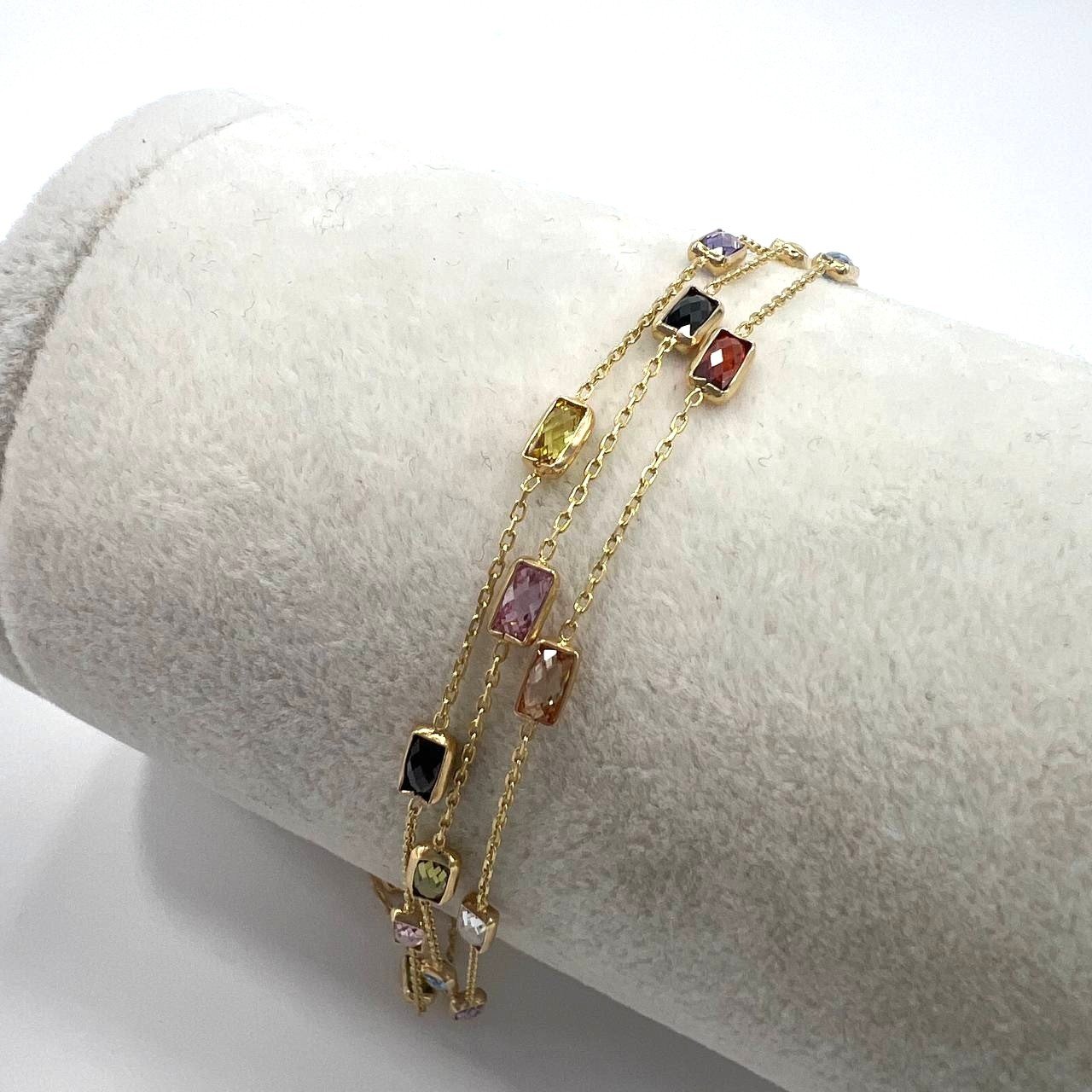 - Features an elegant triple-layer chain design adorned with vibrant, rectangular multicolor Premium Zircon gemstones.