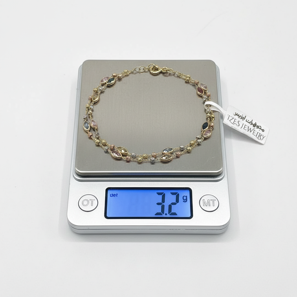 Discover the beauty of this exquisite 14K Solid Gold Multi-Tone Bracelet, crafted with exceptional craftsmanship and a refined design. This elegant piece features a unique double-strand chain adorned with delicate **beads** in yellow, rose, and white gold tones, beautifully complemented by alternating **colorful marquise-cut gemstones**.
