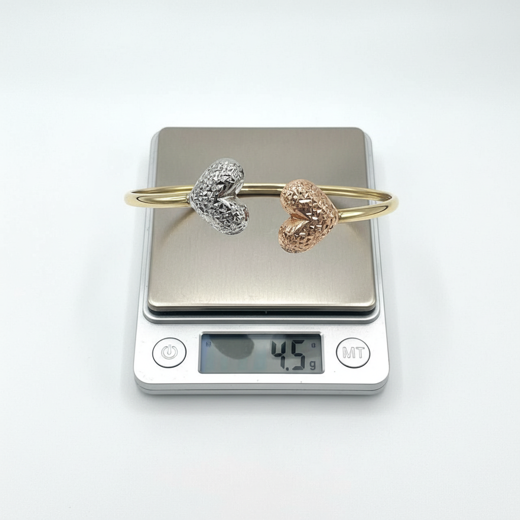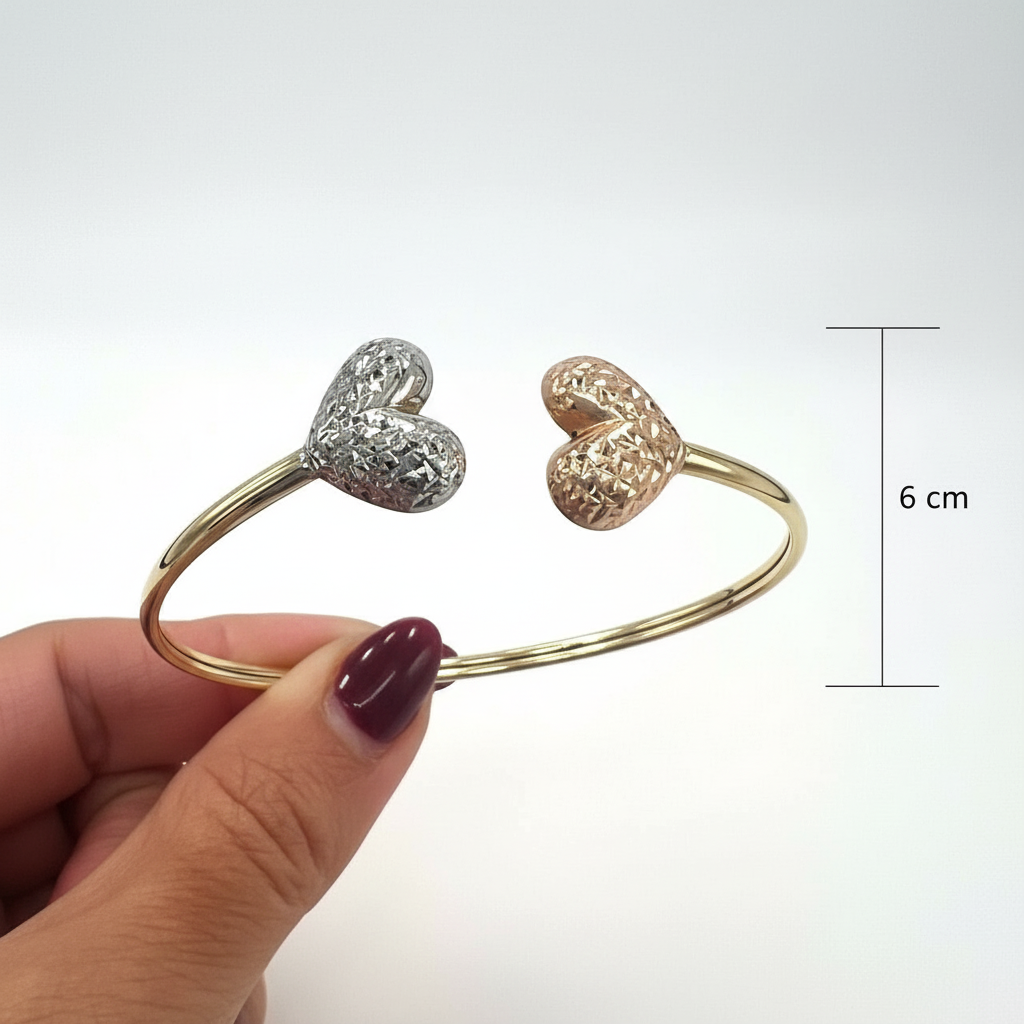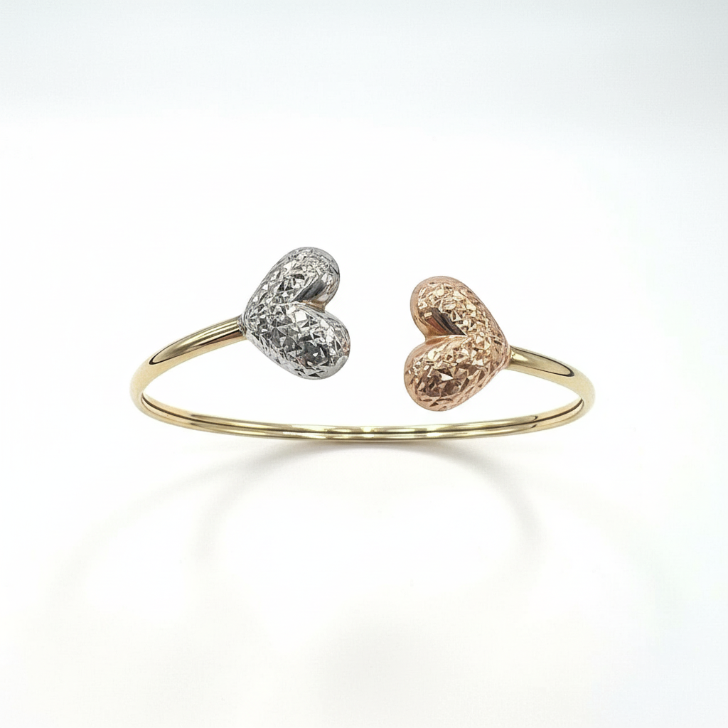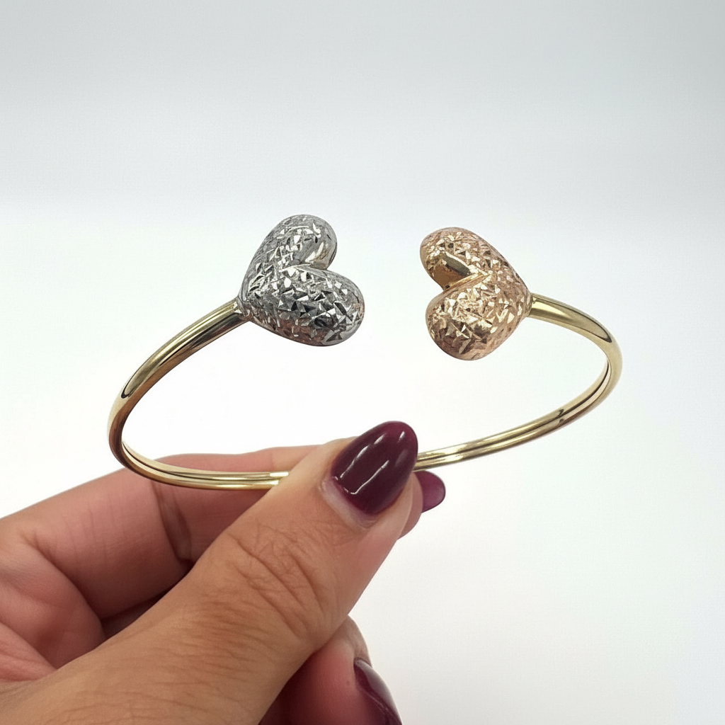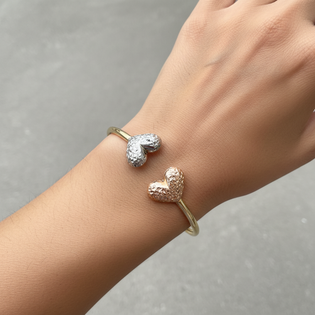 Discover the beauty of this 14K Solid Gold Tri-Color Heart Open Cuff Bracelet, crafted with exceptional craftsmanship and refined design. This elegant piece features two exquisitely textured heart ends – one in warm rose gold and the other in radiant white gold – beautifully balanced on a sleek yellow gold band. The sophisticated contrast of colors and the shimmering diamond-cut finish create a unique sparkle that catches the light from every angle, making it perfect for stacking or wearing solo as a statement of refined charm. Combining timeless charm with modern elegance, it adds a sophisticated touch to any look.