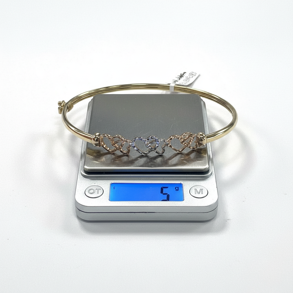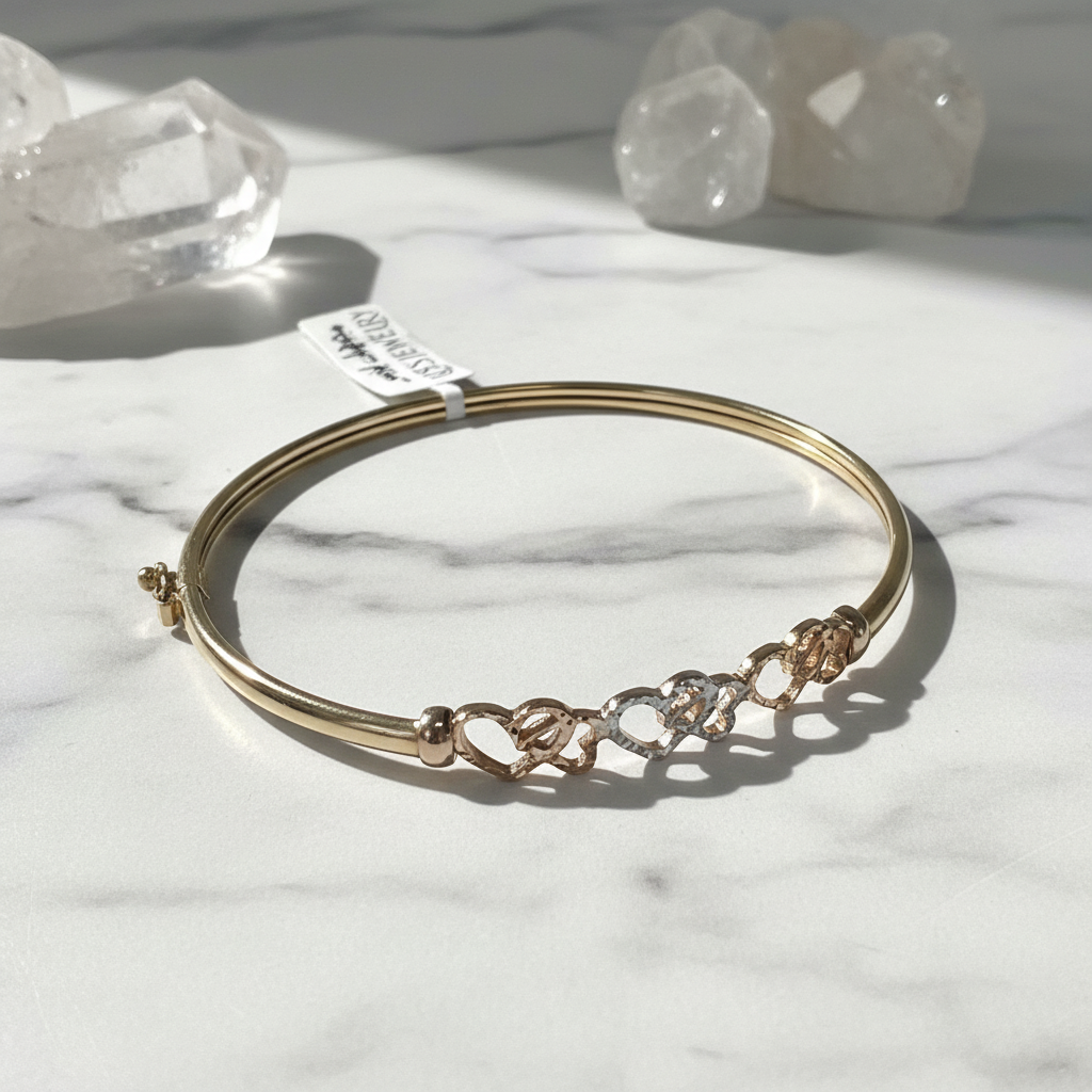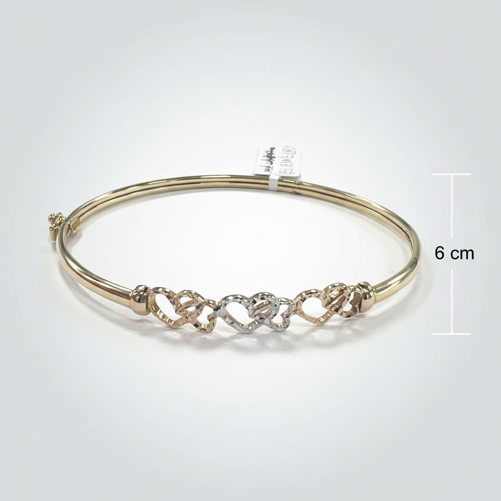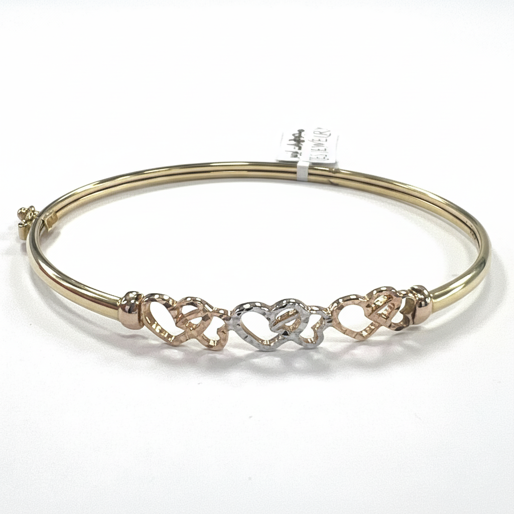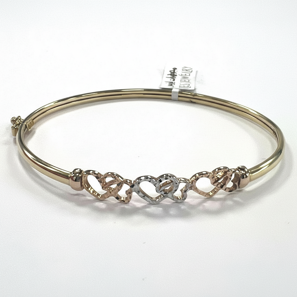 Bangle Bracelet in 14K Solid Gold — Tri-Color Interlocking Hearts Diamond Cut | New