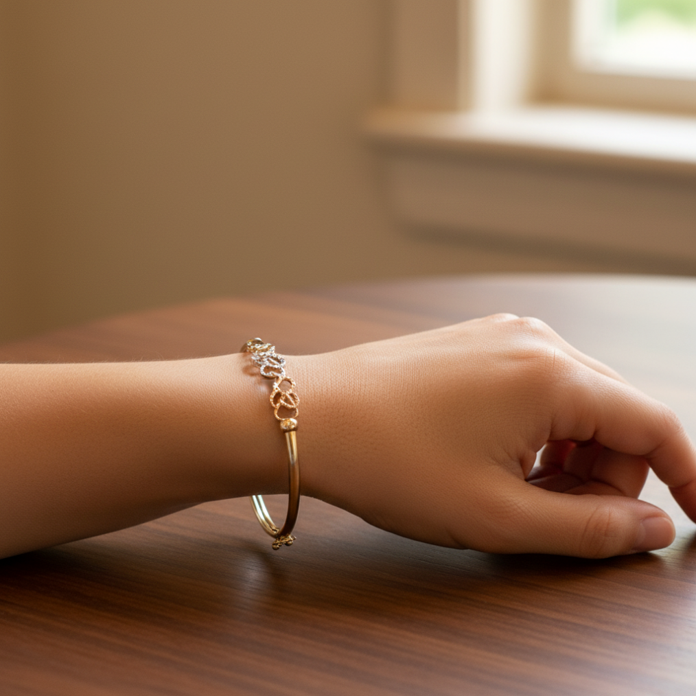 Discover the beauty of this 14K Solid Gold Tri-Color Interlocking Hearts Bangle Bracelet, crafted from 14K Solid Gold with exceptional craftsmanship and refined design.