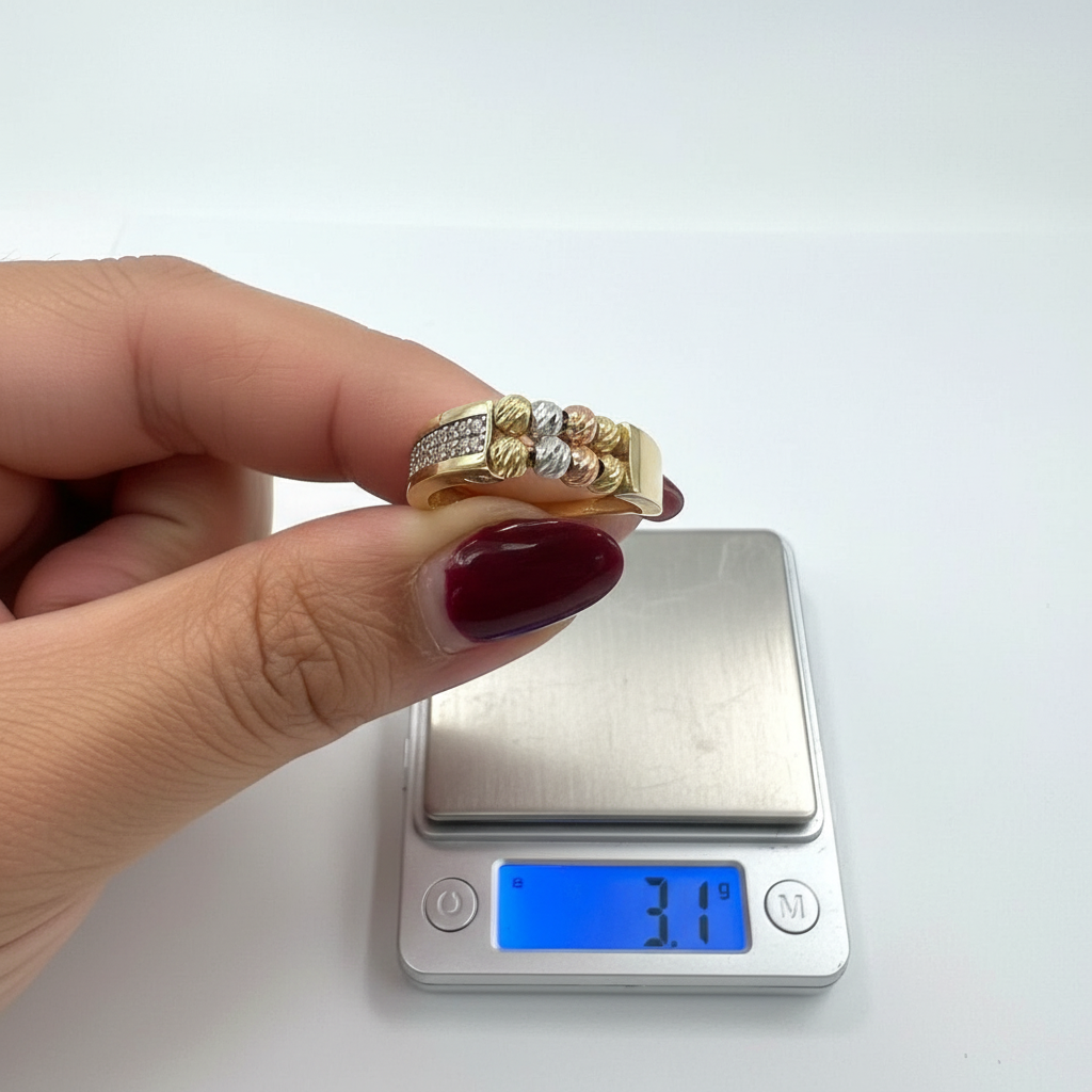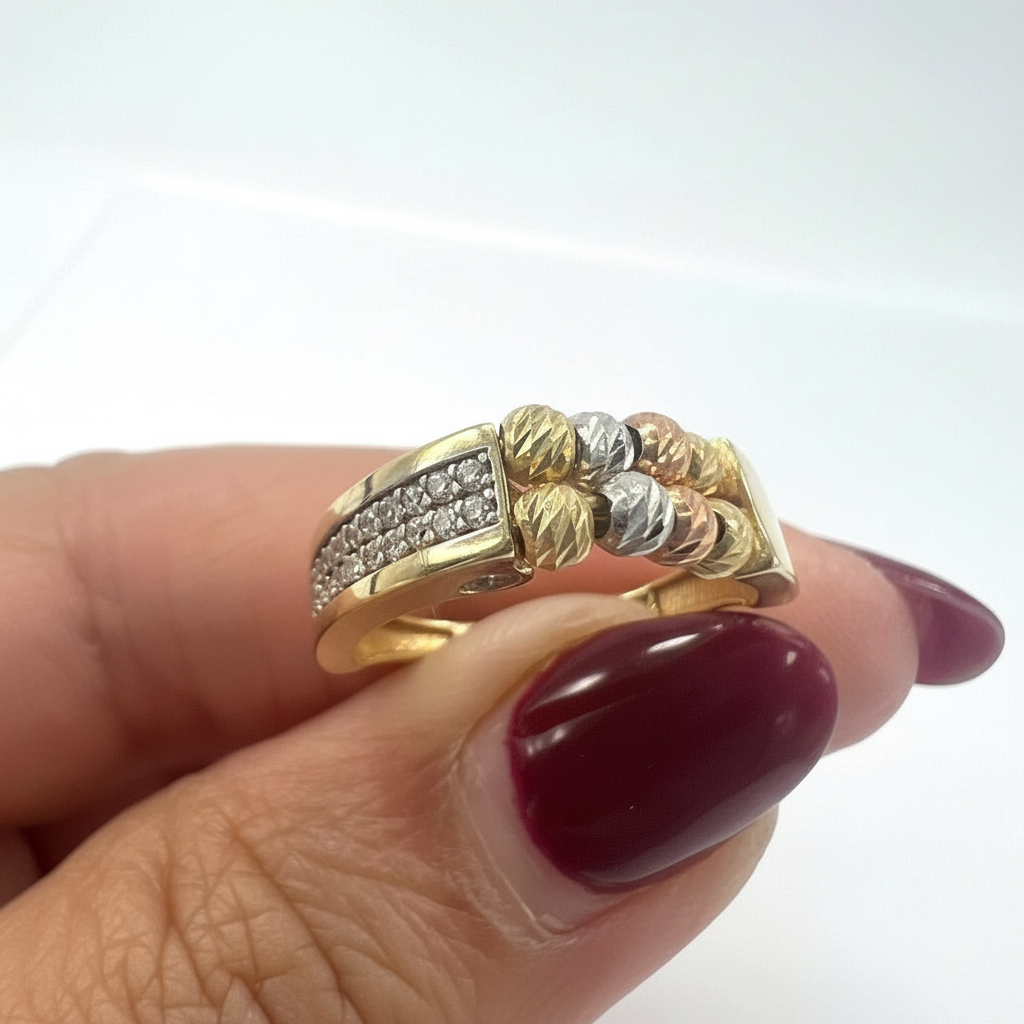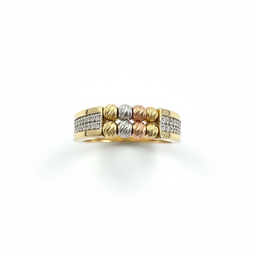 This elegant piece features a luxurious three-tone beaded centerpiece in Yellow, White, and Rose Gold, adding depth, movement, and character. The sides are exquisitely set with sparkling high-quality white zircon stones in a refined pavé pattern, enhancing its brilliance and elegance.
