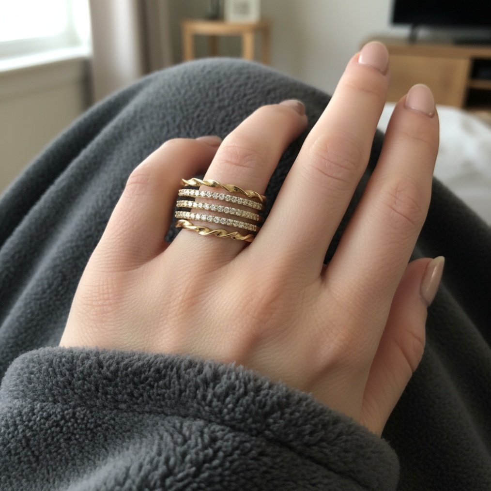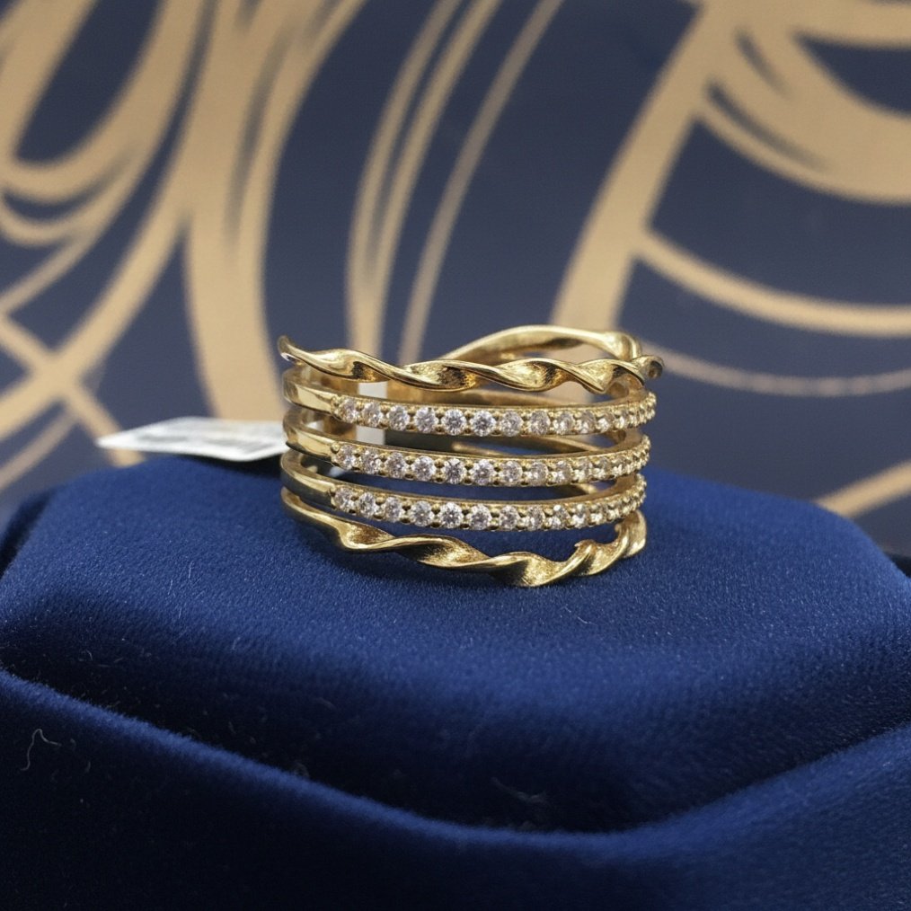 - Design: Multi-band layered ring with twisted gold accents and open band structure