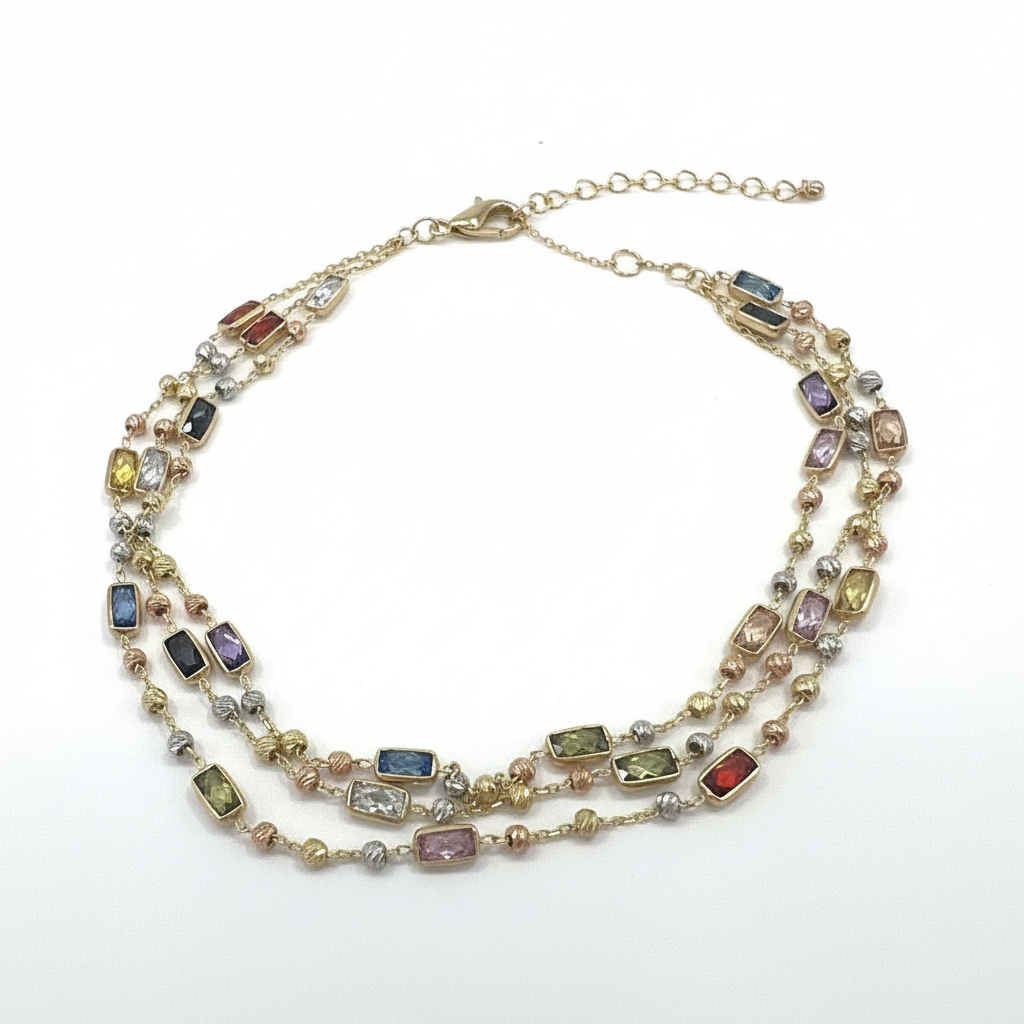 - Exquisite triple-layer chain design adorned with rectangular multicolor zircon gemstones.