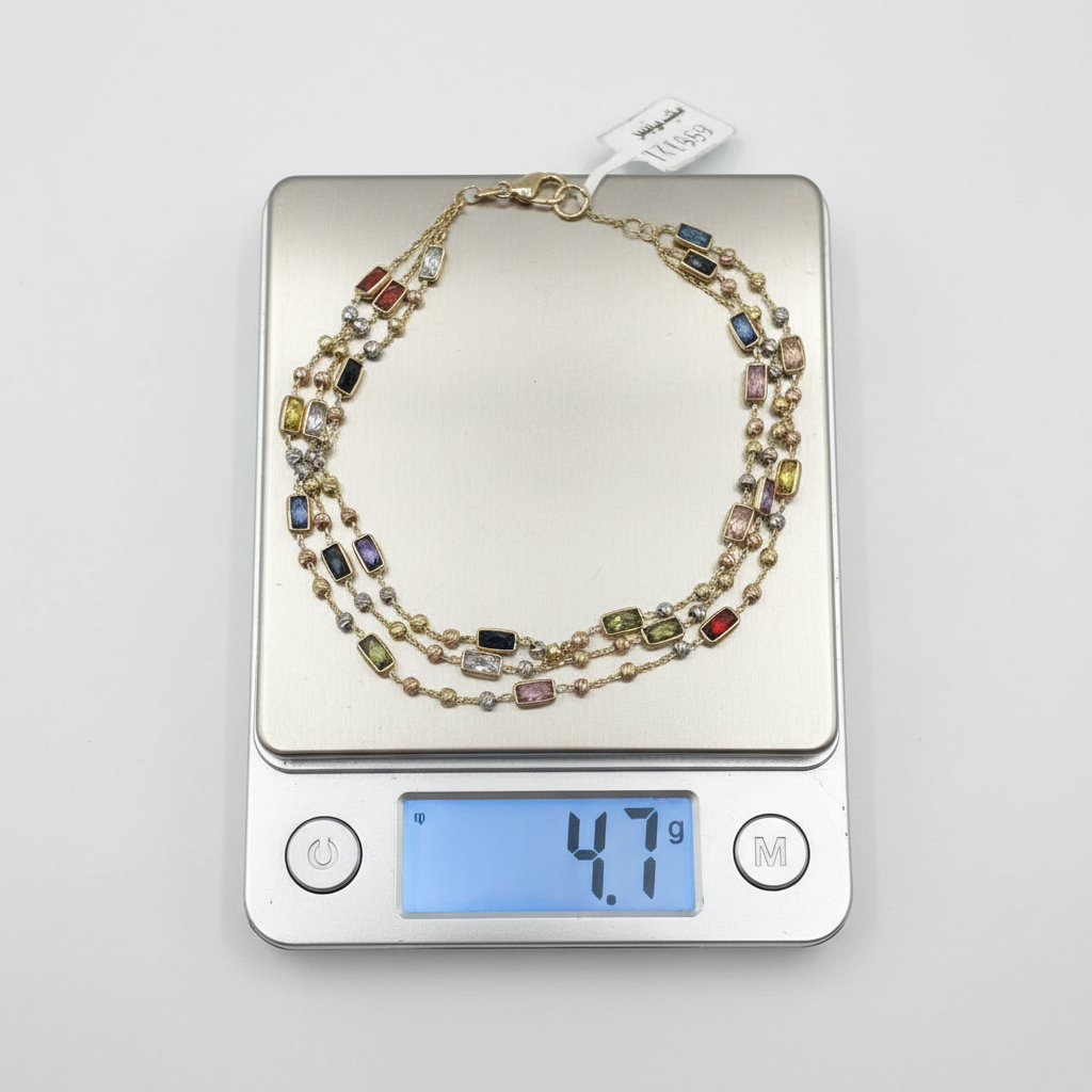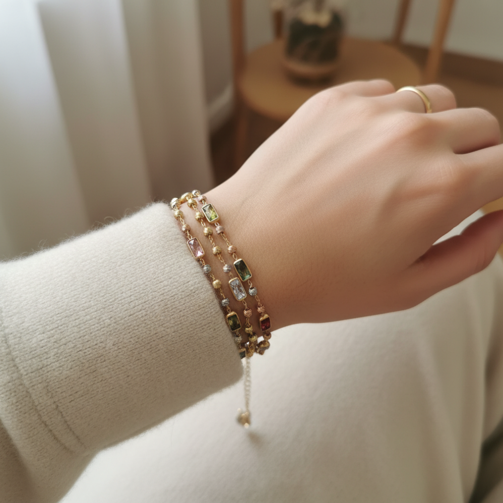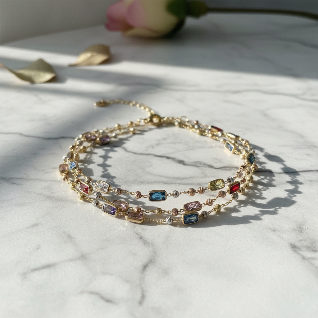 Discover the exquisite beauty of this 14K Tricolor Gold Layered Bracelet, a luxurious creation meticulously crafted with exceptional craftsmanship and refined design. This elegant piece features three sophisticated layers adorned with rectangular-cut multicolor zircon gemstones. Each premium zircon stone is expertly set in a golden bezel, radiating a stunning spectrum of colors — from deep blue and red to soft lilac and champagne hues. The delicate mix of yellow, white, and rose gold tones adds warmth and sophistication, creating a piece that embodies both modern luxury and timeless beauty. Perfect for elevating any outfit, from casual chic to evening elegance, this bracelet makes it ideal for special occasions or as a meaningful gift. Combining timeless charm with modern elegance, it adds a sophisticated touch to any look.