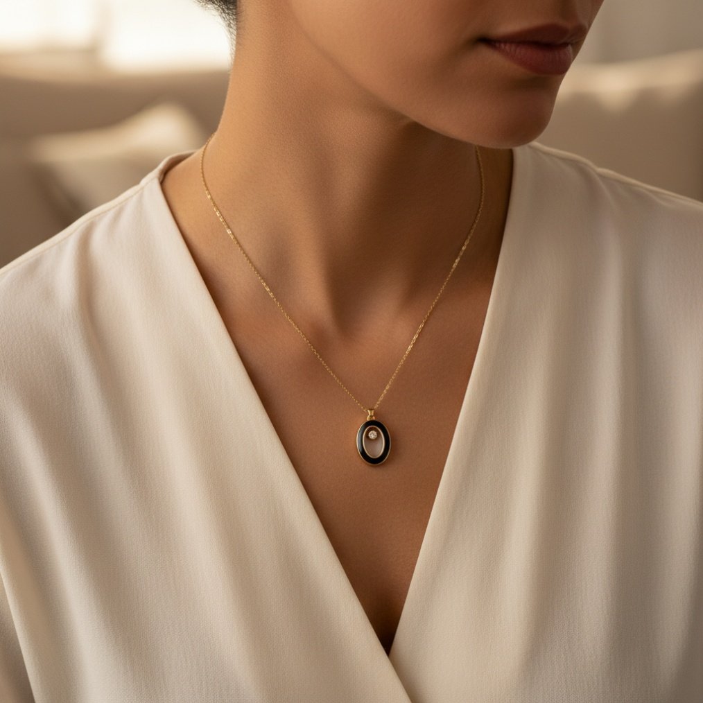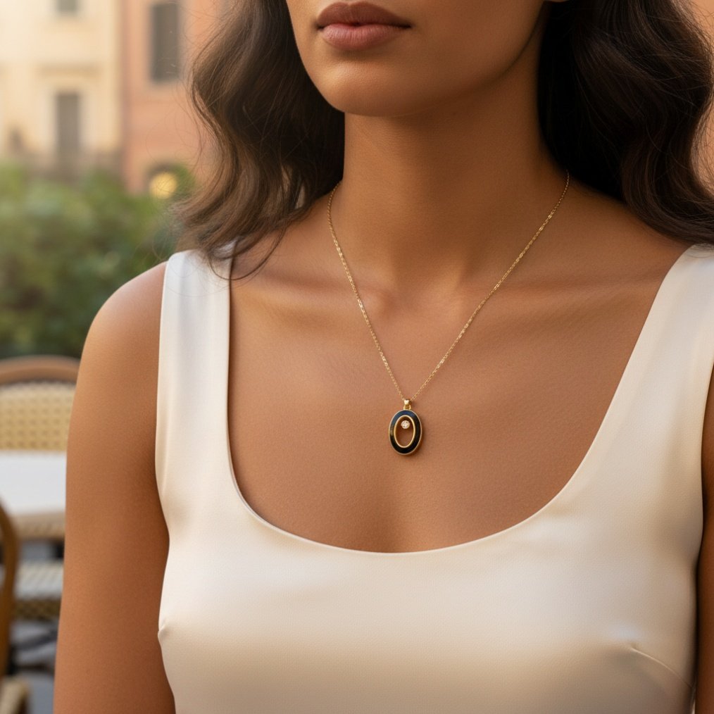 This elegant piece features a bold black oval pendant with a sparkling central stone, making it perfect for daily wear or evening occasions.