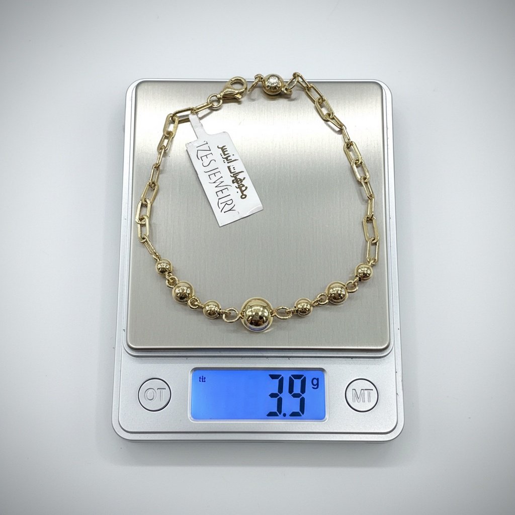 Discover the beauty of this exquisite 14K Yellow Gold Bracelet from IZES JEWELRY, crafted with exceptional craftsmanship and refined design. This elegant piece features a captivating sequence of polished golden beads interspersed with delicate chain links, radiating warmth and sophistication. Its minimalist yet luxurious design makes it an essential piece for any jewelry lover. Combining timeless charm with modern elegance, it adds a sophisticated touch to any look, perfect for everyday wear or special occasions.