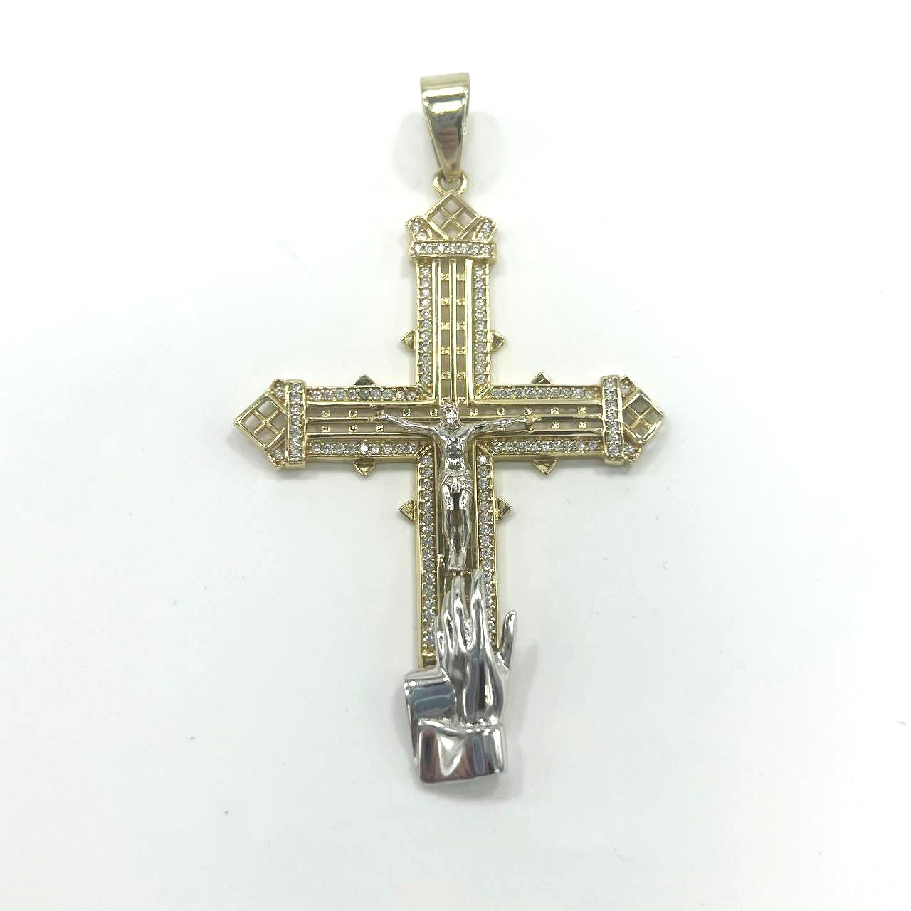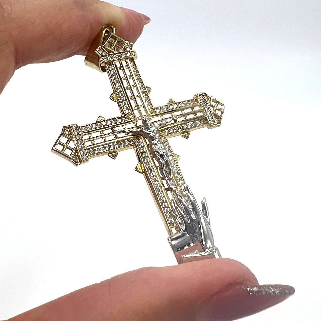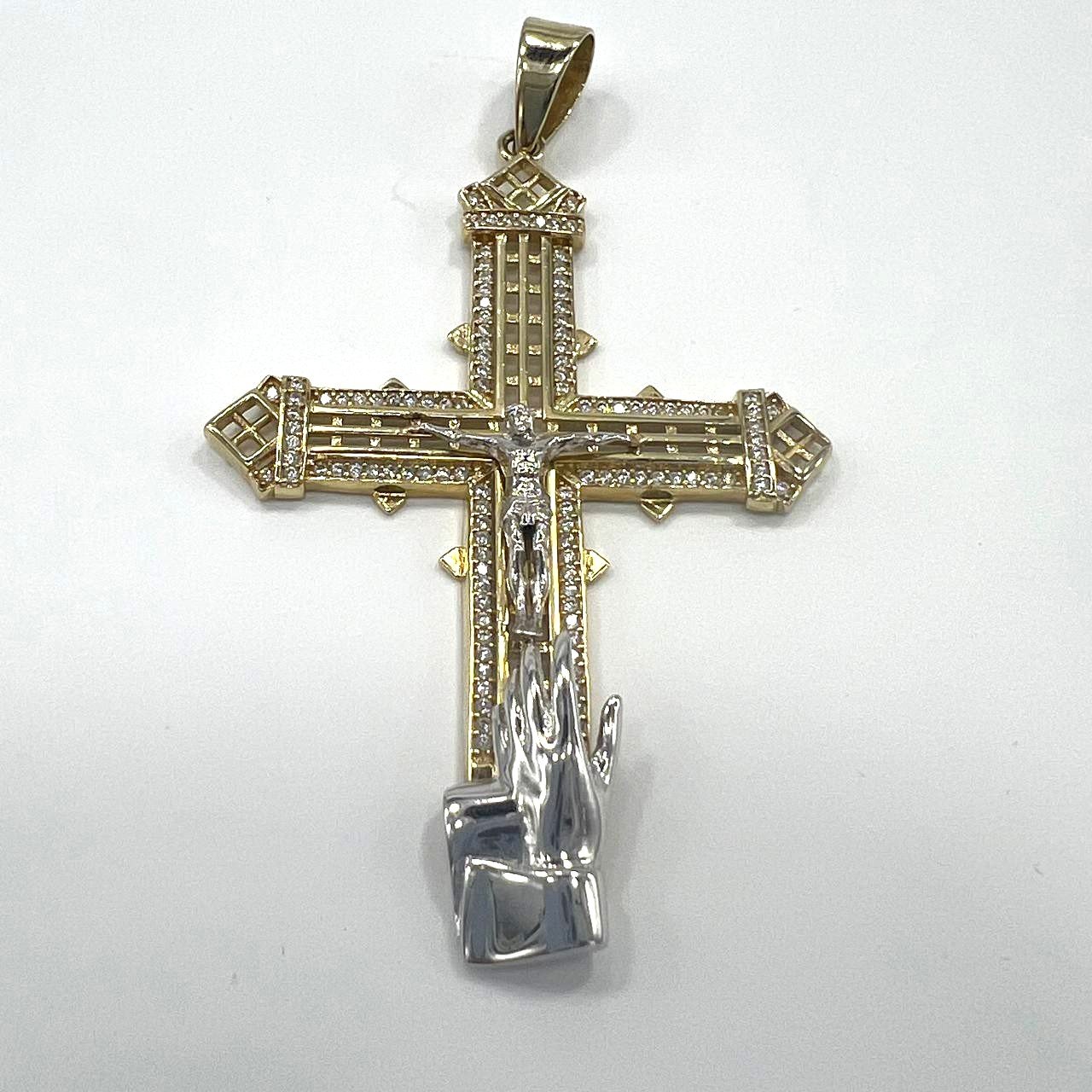 This remarkable 14K yellow and white gold pendant showcases a bold cross design embraced by a hand cuff that appears to be holding the cross, symbolizing strength, protection, and faith. The intricate craftsmanship blends elegance with powerful meaning, making it far more than just an accessory—it is a statement of devotion and style. Perfect for those seeking a distinctive piece with depth and symbolism, this pendant is a timeless treasure that embodies both beauty and significance