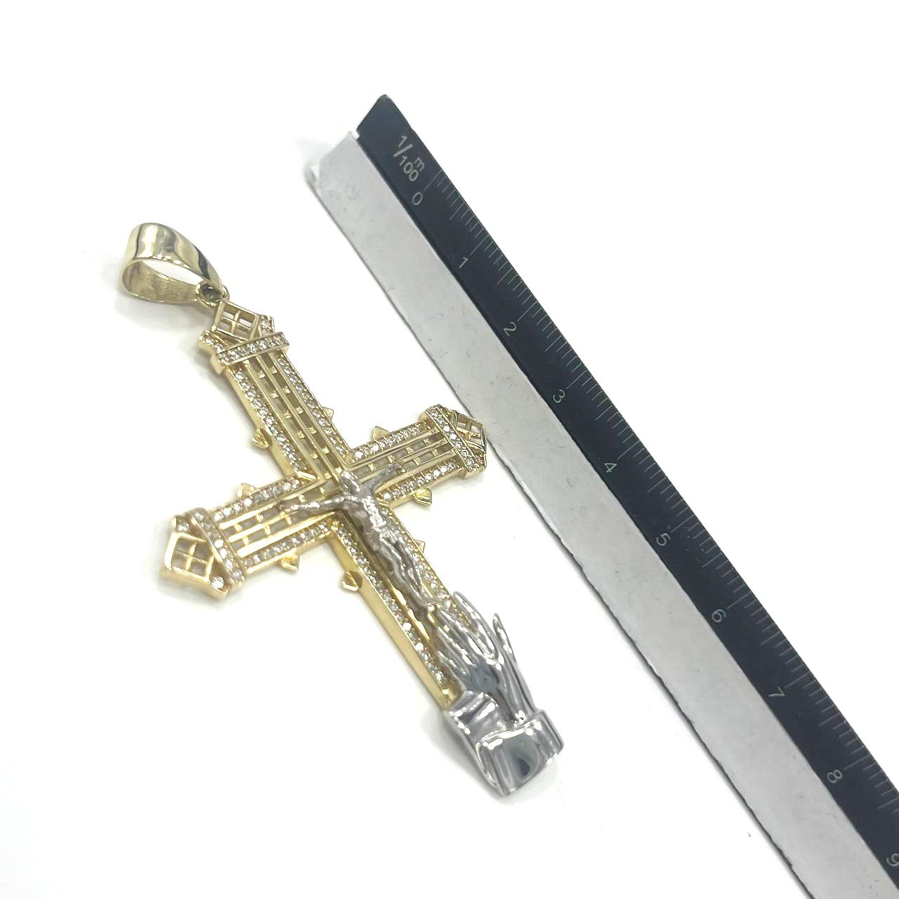 14K yellow gold cross pendant with bold design and hand cuff detail.