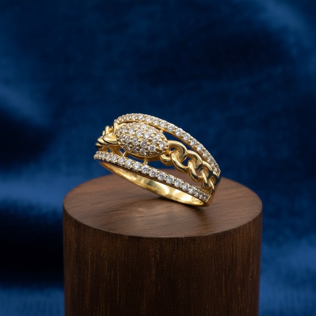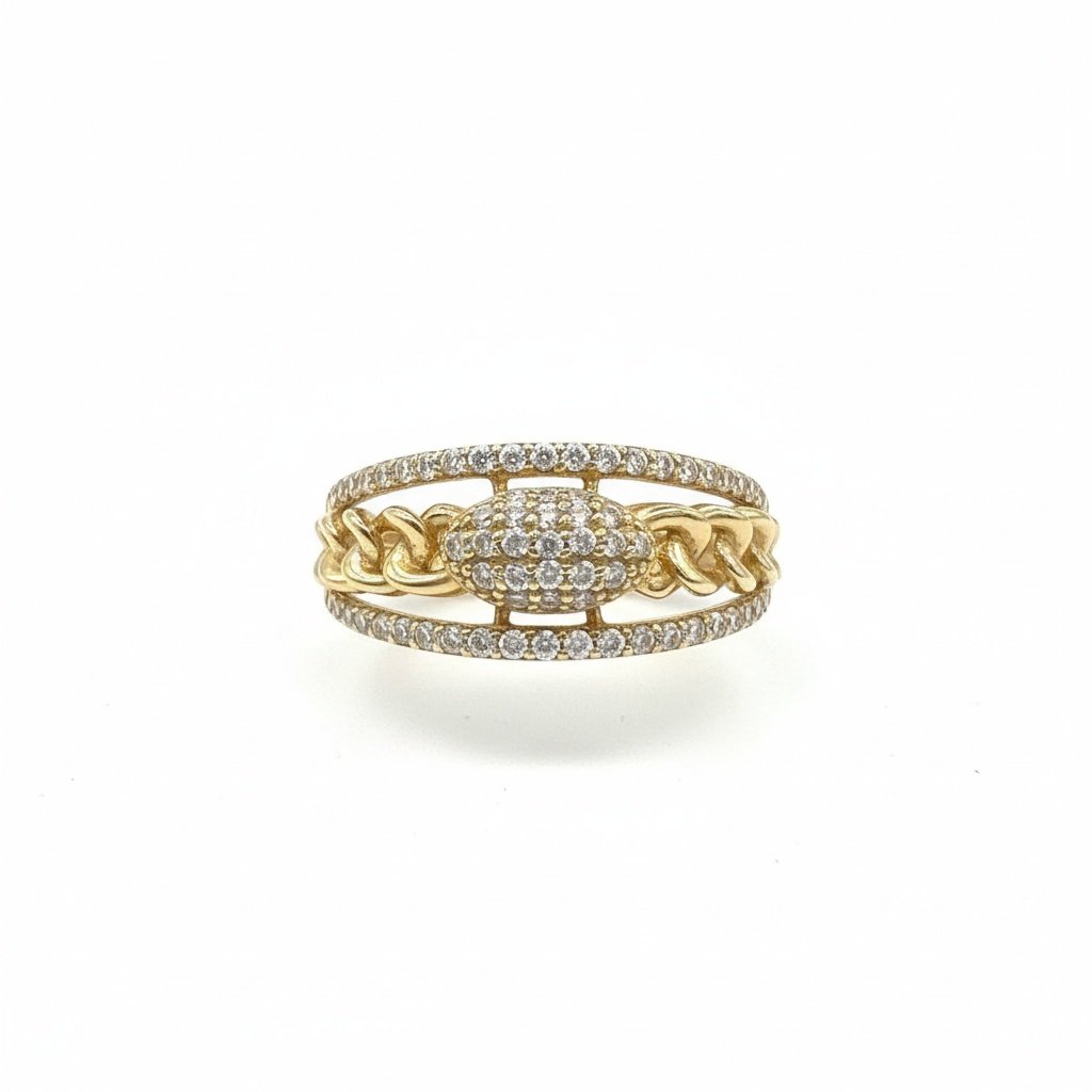 Discover the beauty of this 14K Yellow Gold CZ Chain Link Double Band Ring, crafted from 14K yellow gold with exceptional craftsmanship and refined design. This elegant piece features a double band lined with sparkling cubic zirconia stones, connected by a delicate chain-style link, and an oval centerpiece encrusted with shimmering crystals, making it perfect for both daily wear and elegant occasions. Combining timeless charm with modern elegance, it adds a sophisticated touch to any look and makes a statement of confidence and luxury.