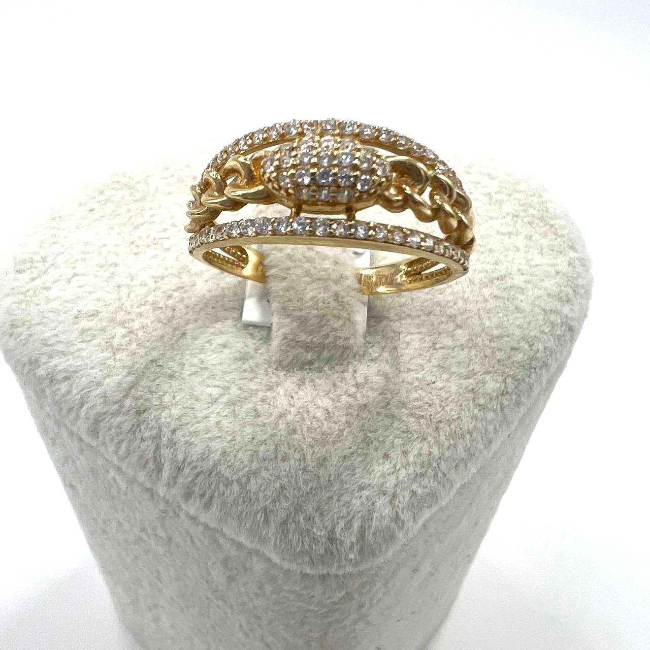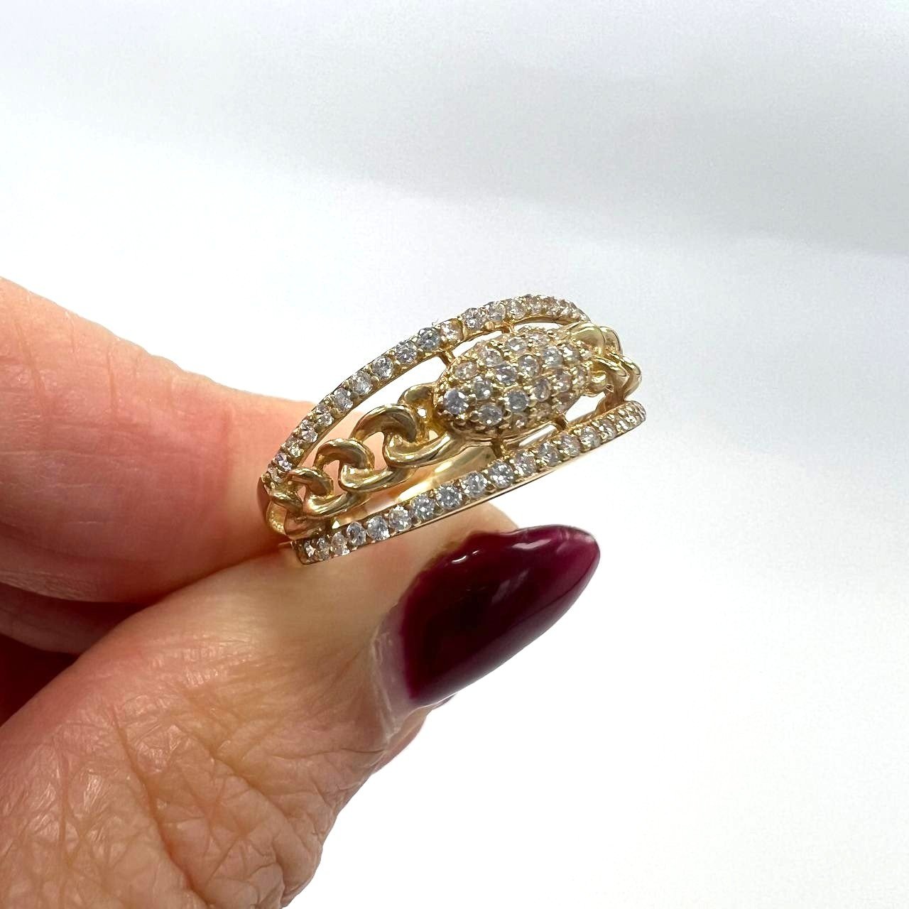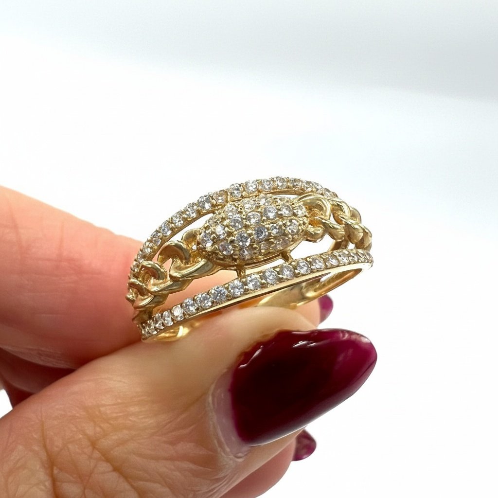 14K Yellow Gold CZ Ring — Chain Link Double Band Pave Oval Design | Size 8