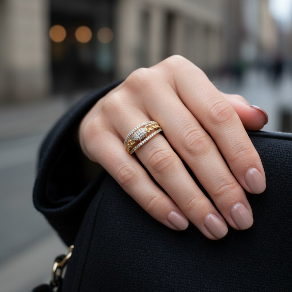 - Features a unique double band design with sparkling Cubic Zirconia stones and a chic chain-link accent.
