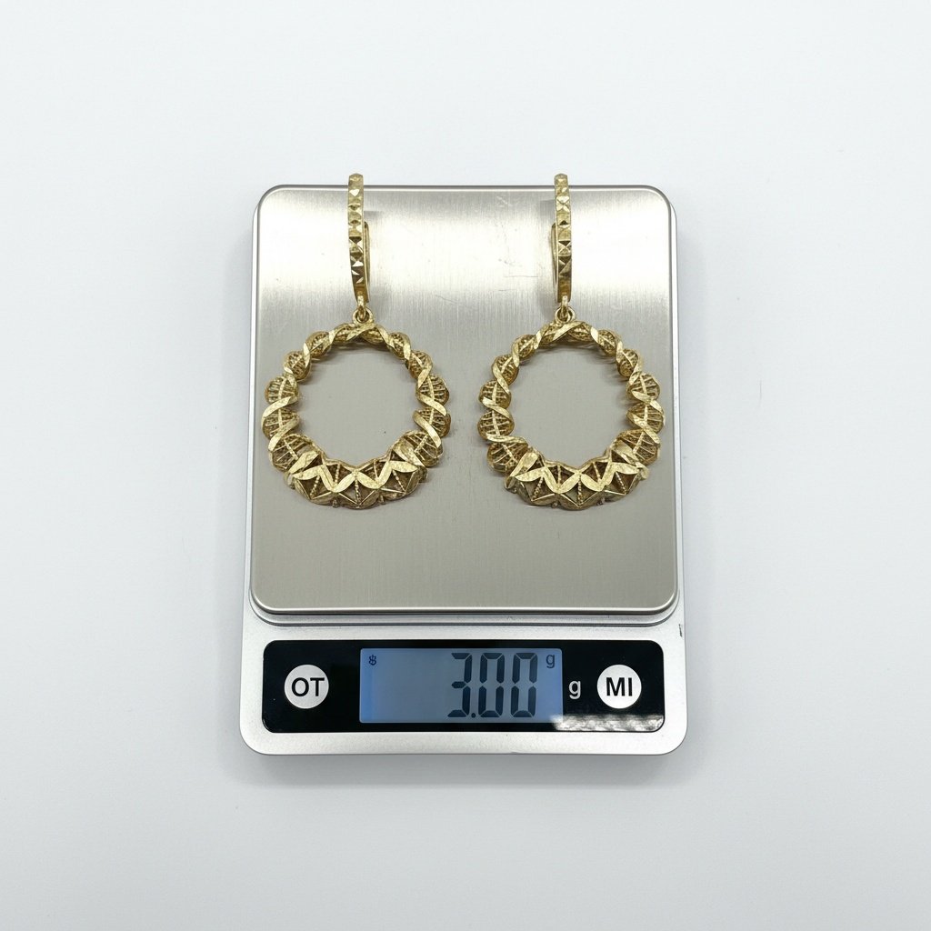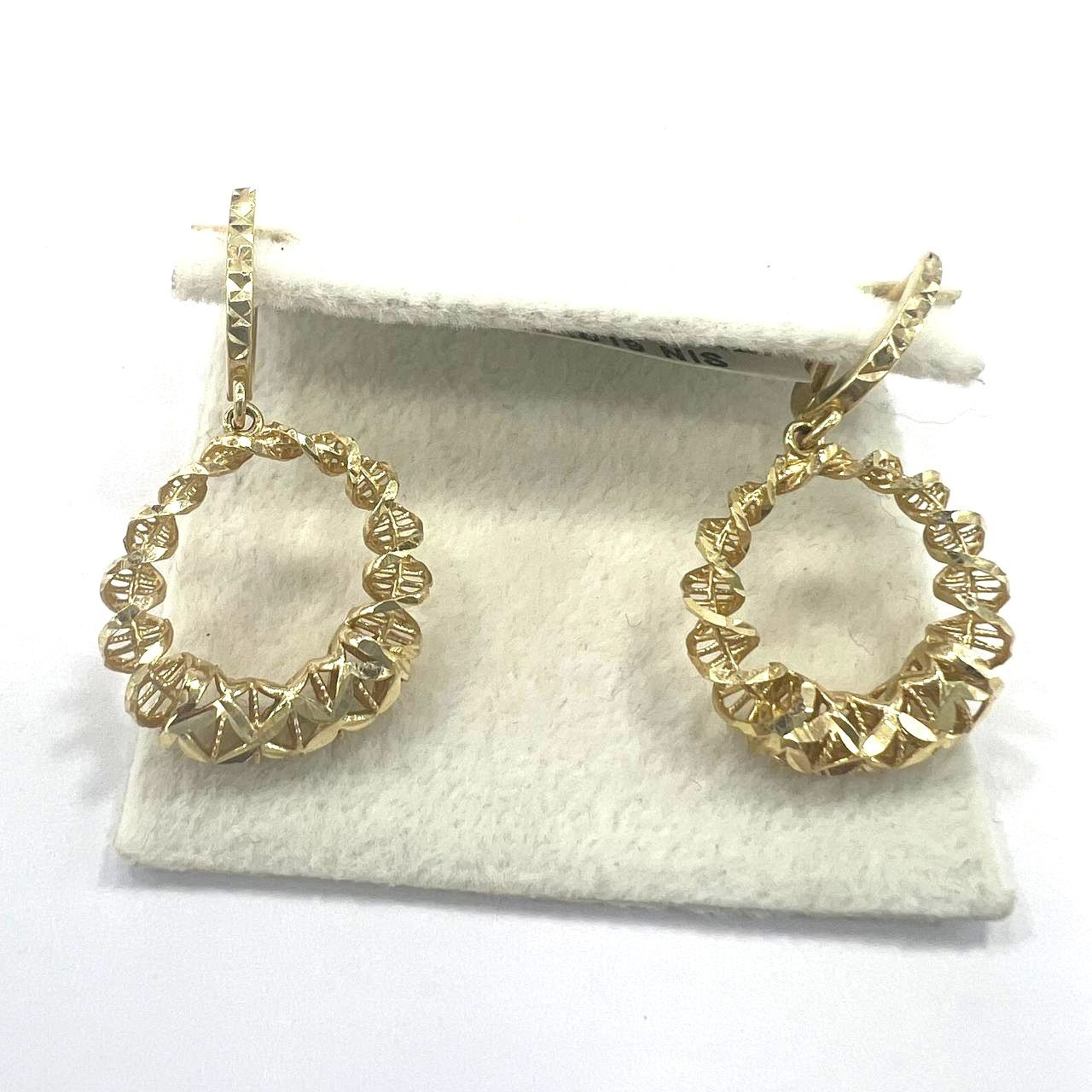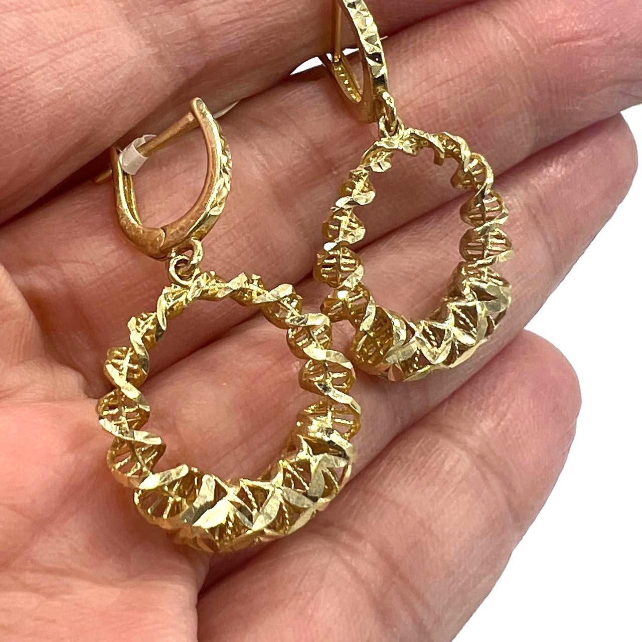 14K Yellow Gold Diamond Cut Textured Drop Hoop Earrings Women’s Fine Jewelry