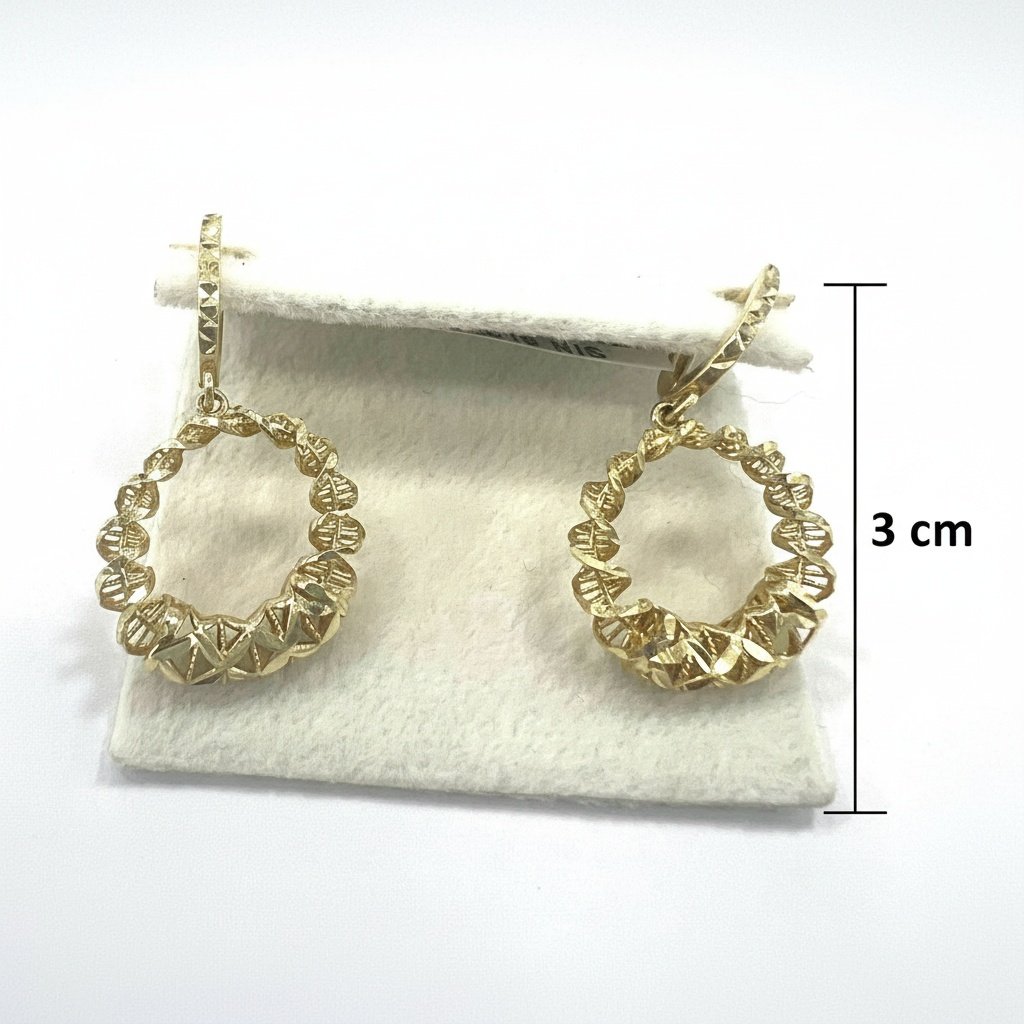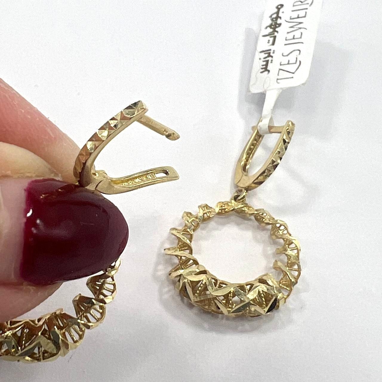 Discover the beauty of these 14K yellow gold drop earrings, exclusively from Izes Jewelry. Crafted with exceptional craftsmanship and refined design, these earrings make a bold yet elegant statement. Their stunning textured, diamond-cut finish reflects light from every angle, creating a rich, luxurious glow that turns every moment into something special. With a sculpted circular shape and intricate detailing, these lightweight and eye-catching pieces are perfect for women who love jewelry that stands out with sophistication and artistic craftsmanship.
