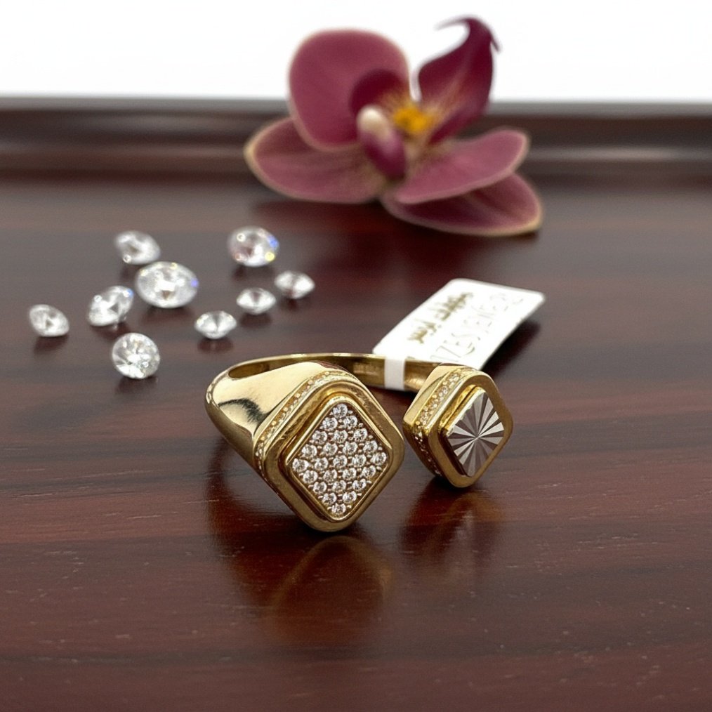 Discover the beauty of this 14K Yellow Gold Dual-Square Open Ring, crafted from 14K solid yellow gold (585 hallmark) with exceptional craftsmanship and refined design. This elegant piece features a sparkling CZ pavé square on one side and a radiant sunburst engraved square on the other, making it perfect for everyday wear or special occasions and a truly meaningful gift. Combining timeless charm with modern elegance, it adds a sophisticated and distinctive touch to any look.