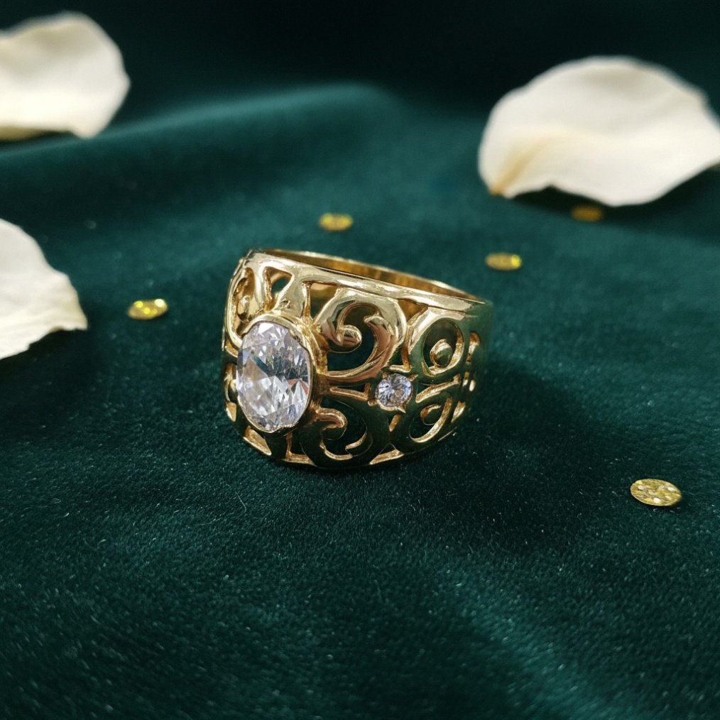 This elegant piece features a brilliant oval-cut high-quality cubic zirconia stone at the center, complemented by smaller accent stones delicately set along the sides, making it perfect for special occasions or adding a touch of luxurious sparkle to your everyday wear. Combining timeless charm with modern elegance, its intricate openwork filigree pattern adds a sophisticated and vintage-inspired touch to any look, making it a truly standout piece for women who adore classic beauty.