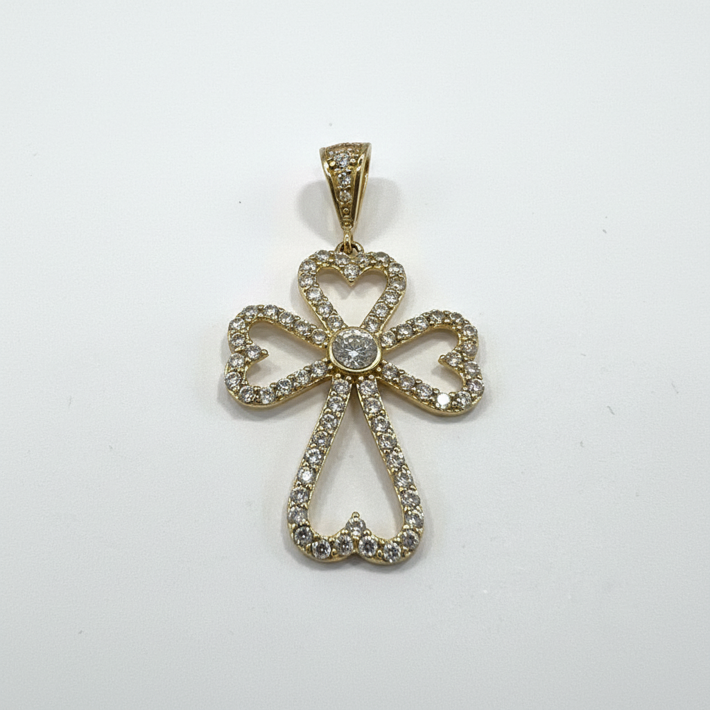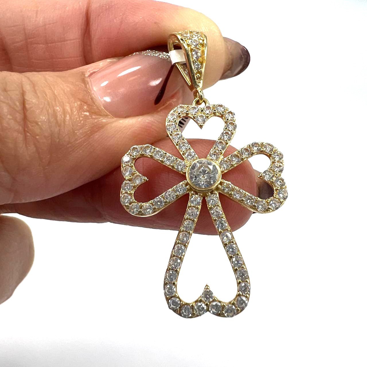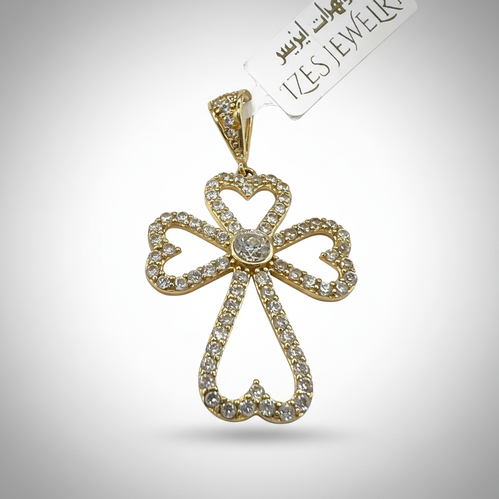 Cross Pendant in 14K Yellow Gold — Heart-Shaped Design with Sparkling Stones | New
