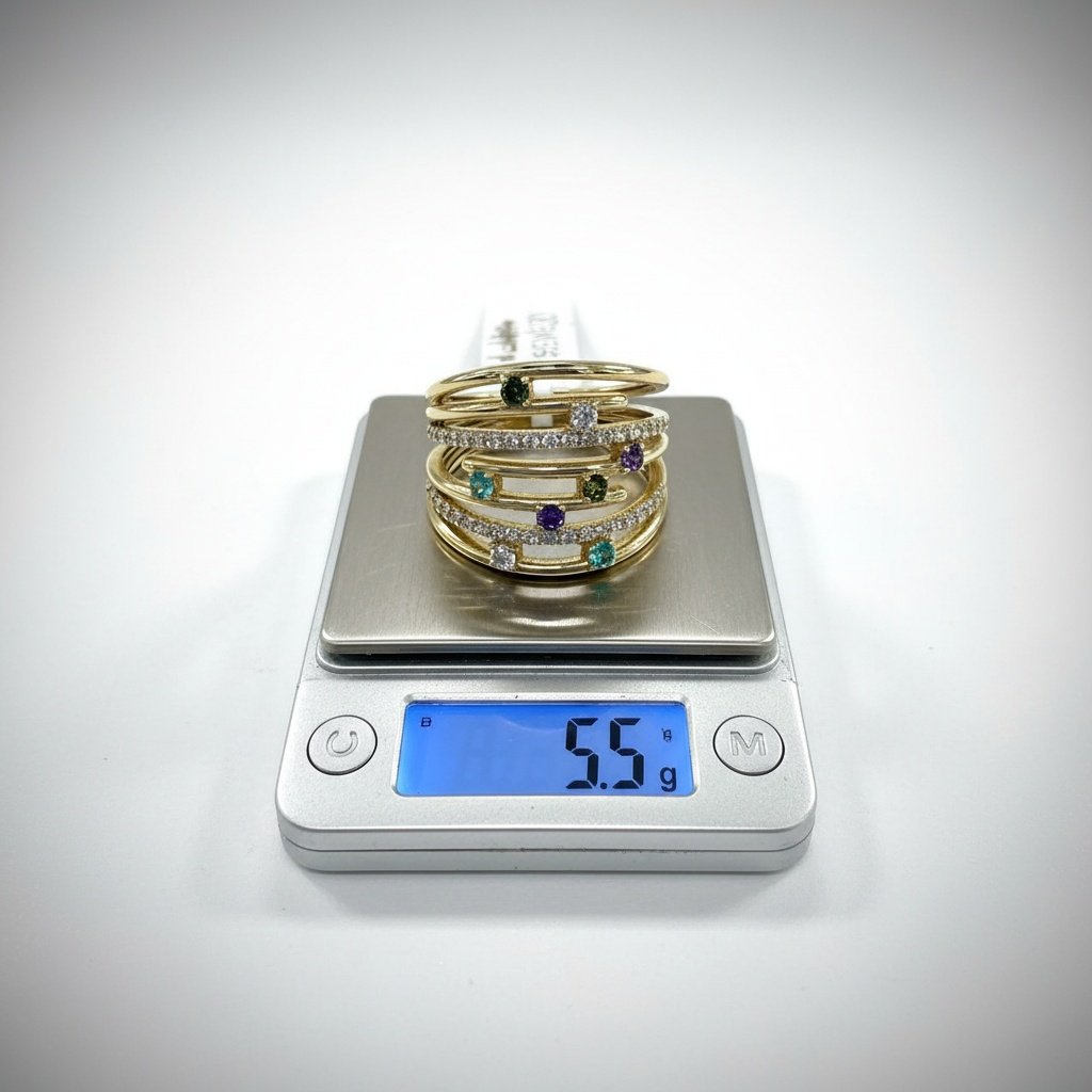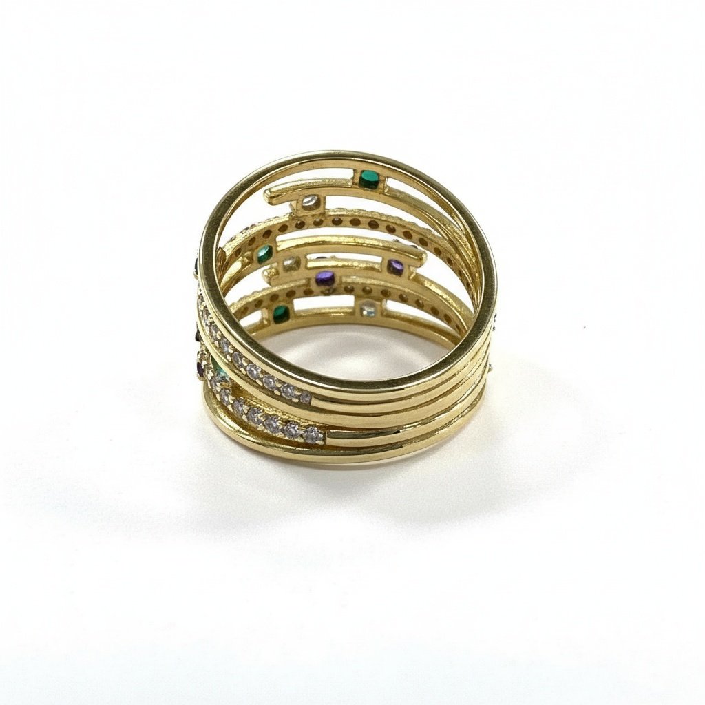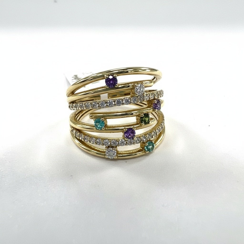 Discover the beauty of this captivating Multi-Band Ring, crafted from 14K Yellow Gold with exceptional craftsmanship and refined design. This elegant piece features a graceful layered silhouette that wraps beautifully around the finger. Each band is adorned with high-quality Cubic Zirconia stones and accented with vibrant colored gems in purple, emerald green, light blue, and classic white, adding a refined touch of brilliance and personality. Combining timeless charm with modern elegance, it adds a sophisticated touch to any look, making it perfect for everyday wear, special occasions, or as a meaningful gift. It’s a statement piece that stands out effortlessly, offering a playful, luxurious sparkle.