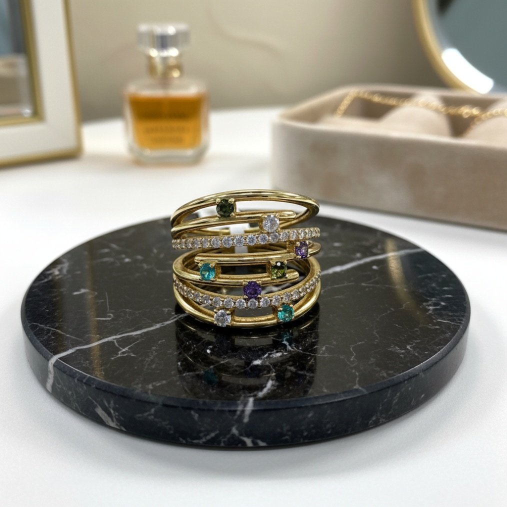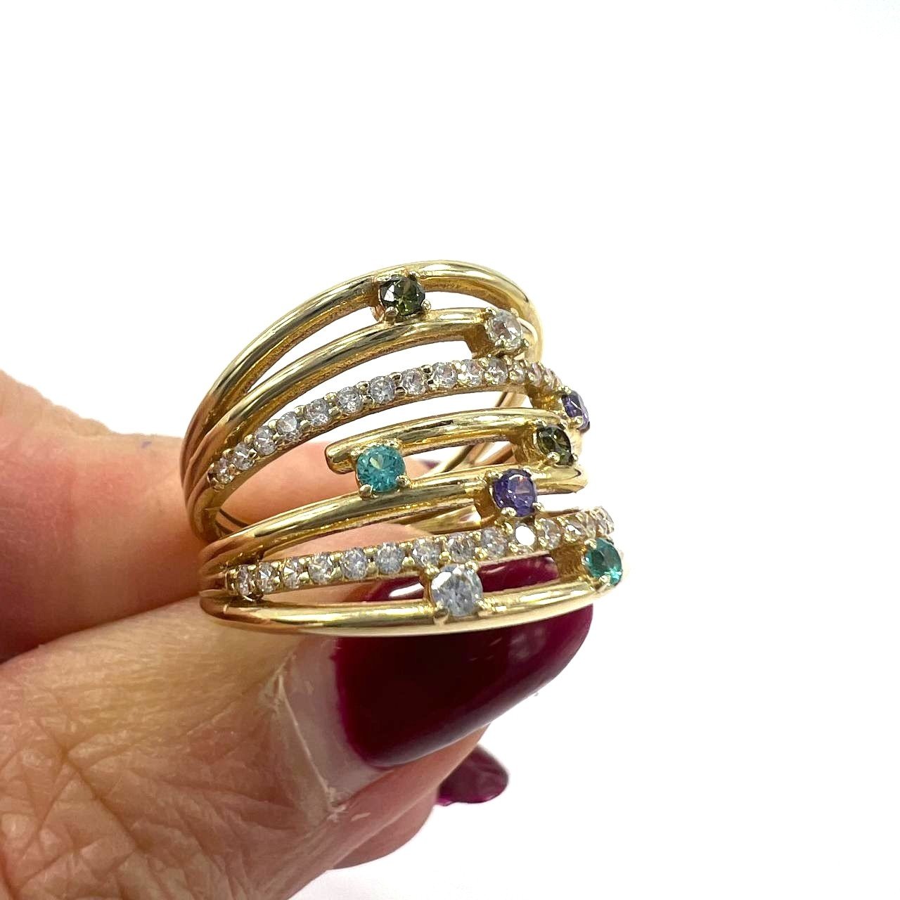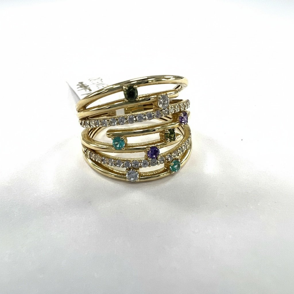 Discover the beauty of this captivating Multi-Band Ring, crafted from 14K Yellow Gold with exceptional craftsmanship and refined design. This elegant piece features a graceful layered silhouette that wraps beautifully around the finger. Each band is adorned with high-quality Cubic Zirconia stones and accented with vibrant colored gems in purple, emerald green, light blue, and classic white, adding a refined touch of brilliance and personality. Combining timeless charm with modern elegance, it adds a sophisticated touch to any look, making it perfect for everyday wear, special occasions, or as a meaningful gift. It’s a statement piece that stands out effortlessly, offering a playful, luxurious sparkle.