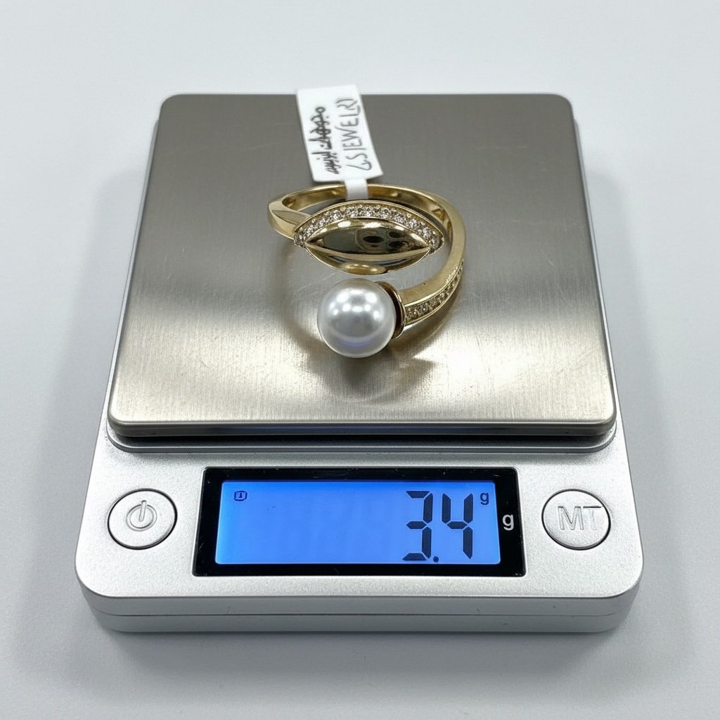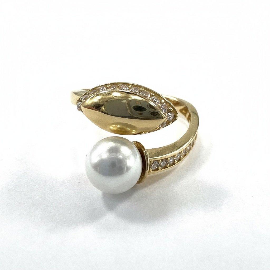 14K Yellow Gold Pearl & CZ Open Ring — Elegant Modern Design size 7