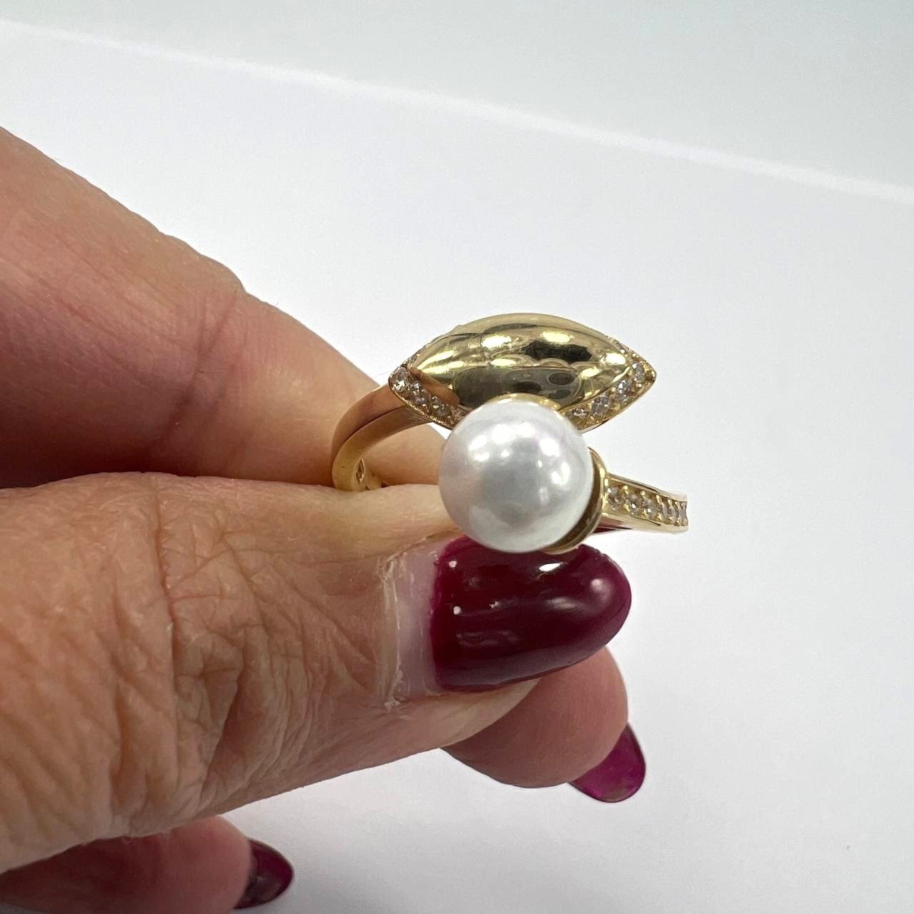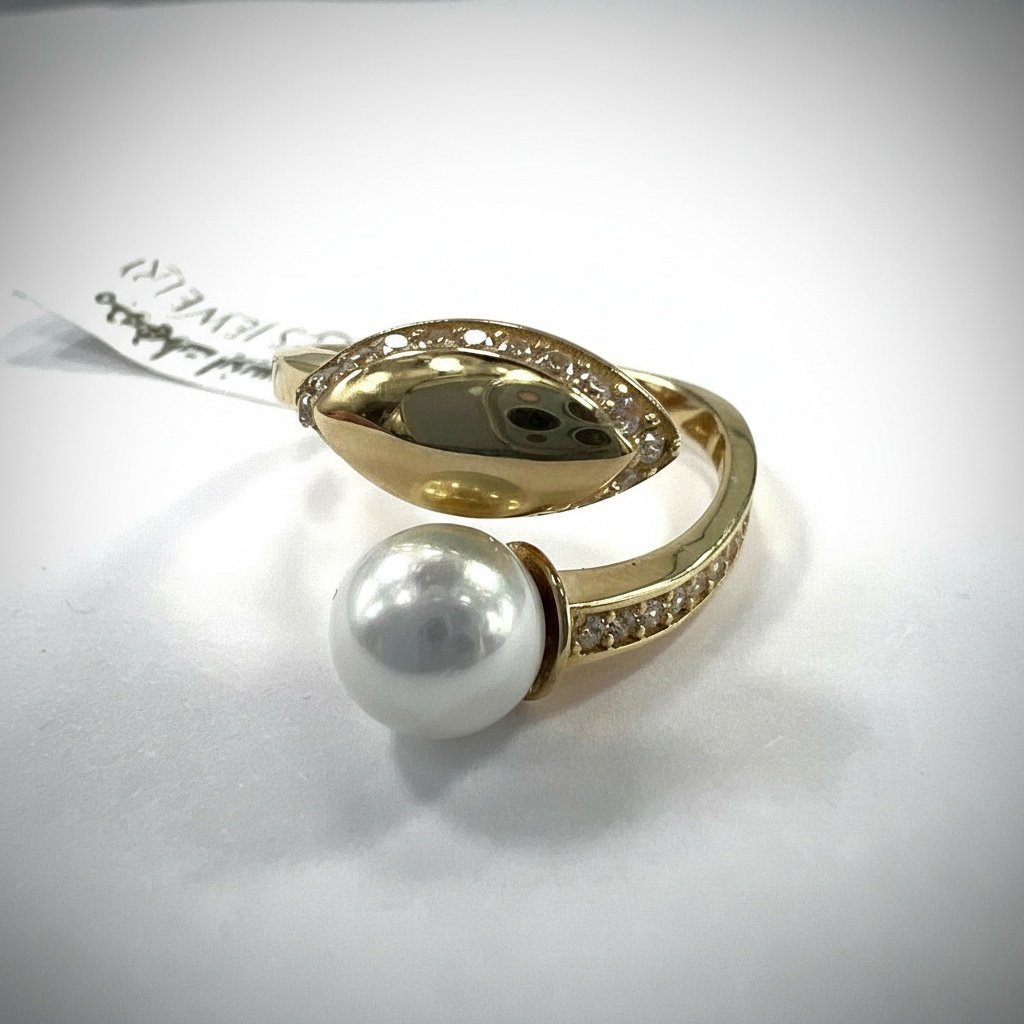 Discover the beauty of this elegant open-style ring, crafted in 14K yellow gold with exceptional craftsmanship and refined design. This stunning piece features a harmonious balance of modern design and timeless charm. One side is gracefully set with a high-luster pearl, symbolizing purity and elegance, while the opposite side showcases a polished gold leaf element accented with sparkling cubic zirconia. This exquisite ring offers a graceful, feminine look with a luxurious finish — ideal for special occasions or elevating everyday style. A delicate statement ring that draws attention effortlessly, perfect for those who appreciate sophisticated jewelry.