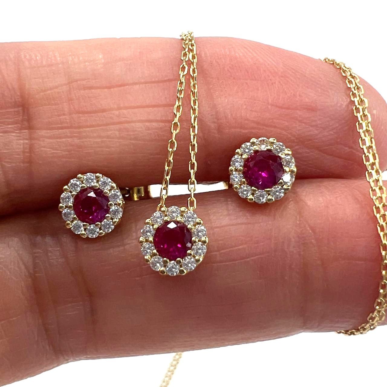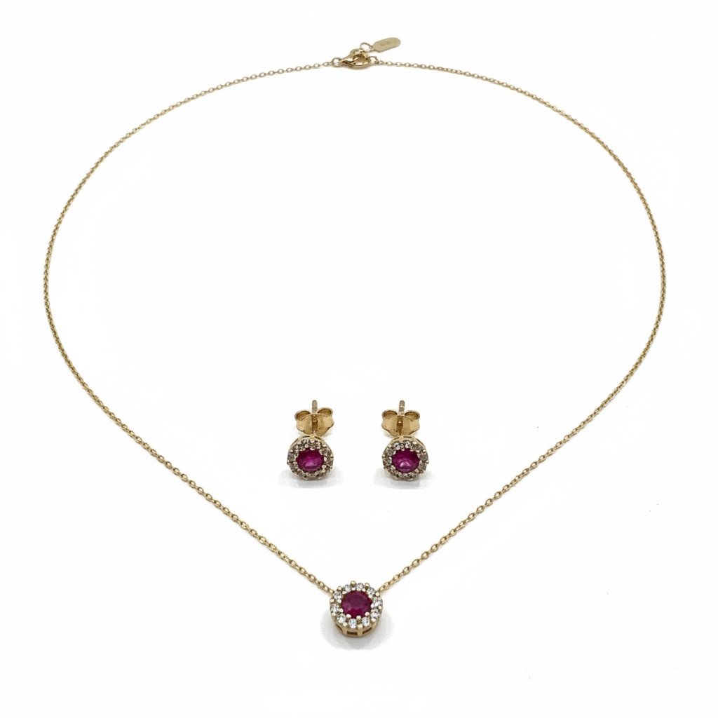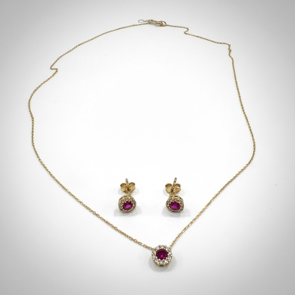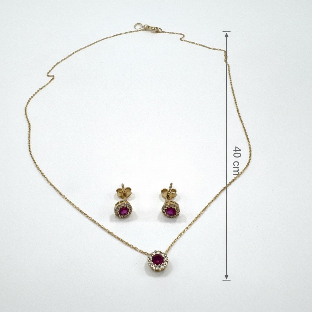 This elegant ensemble features a radiant ruby-red stone beautifully surrounded by sparkling white zircons, creating a captivating halo effect that evokes a timeless, royal look. The 42 cm fine gold chain perfectly showcases the brilliant round pendant, harmoniously paired with matching stud earrings for a complete and sophisticated style.
