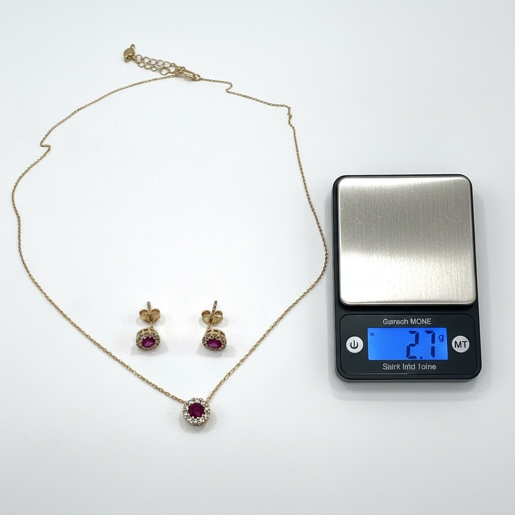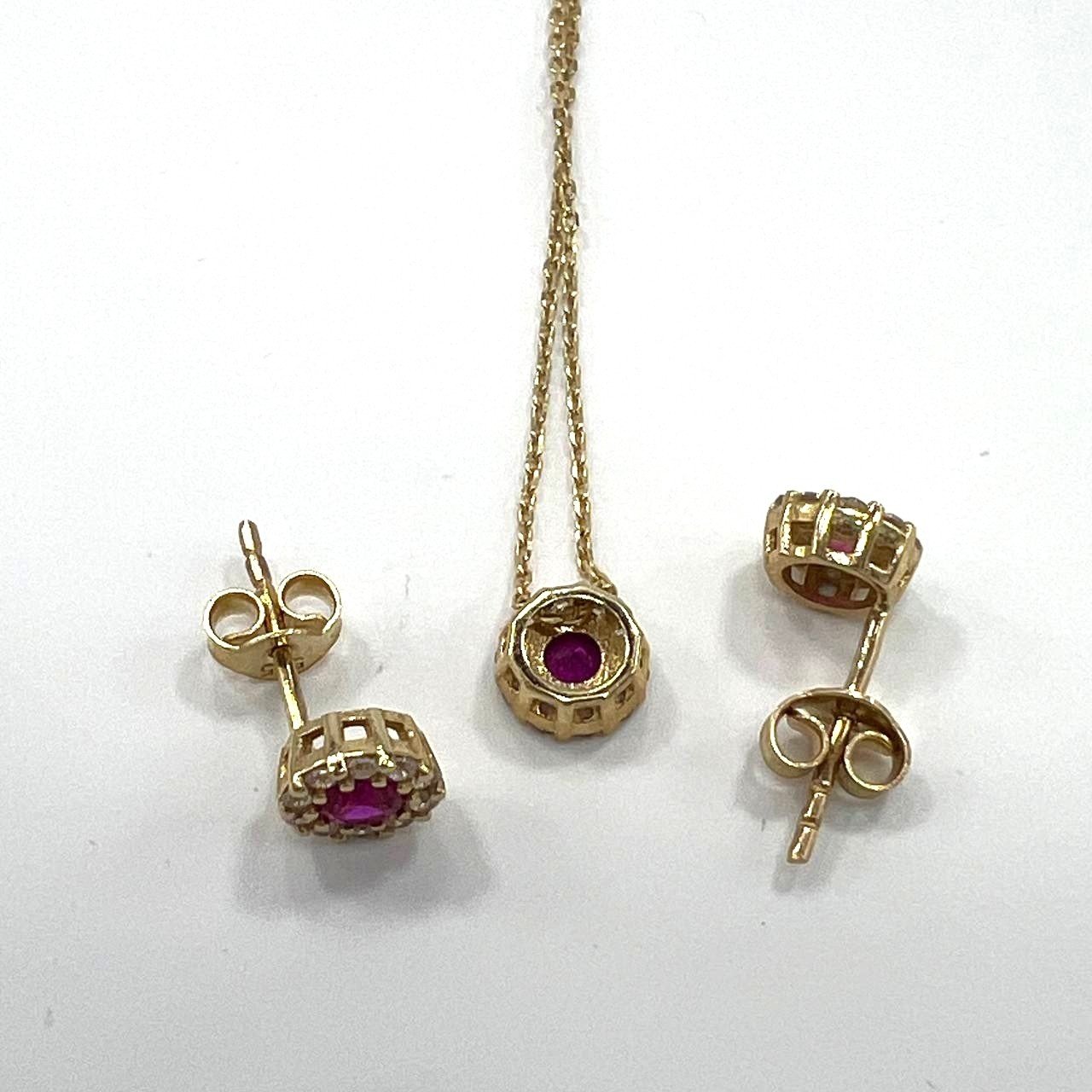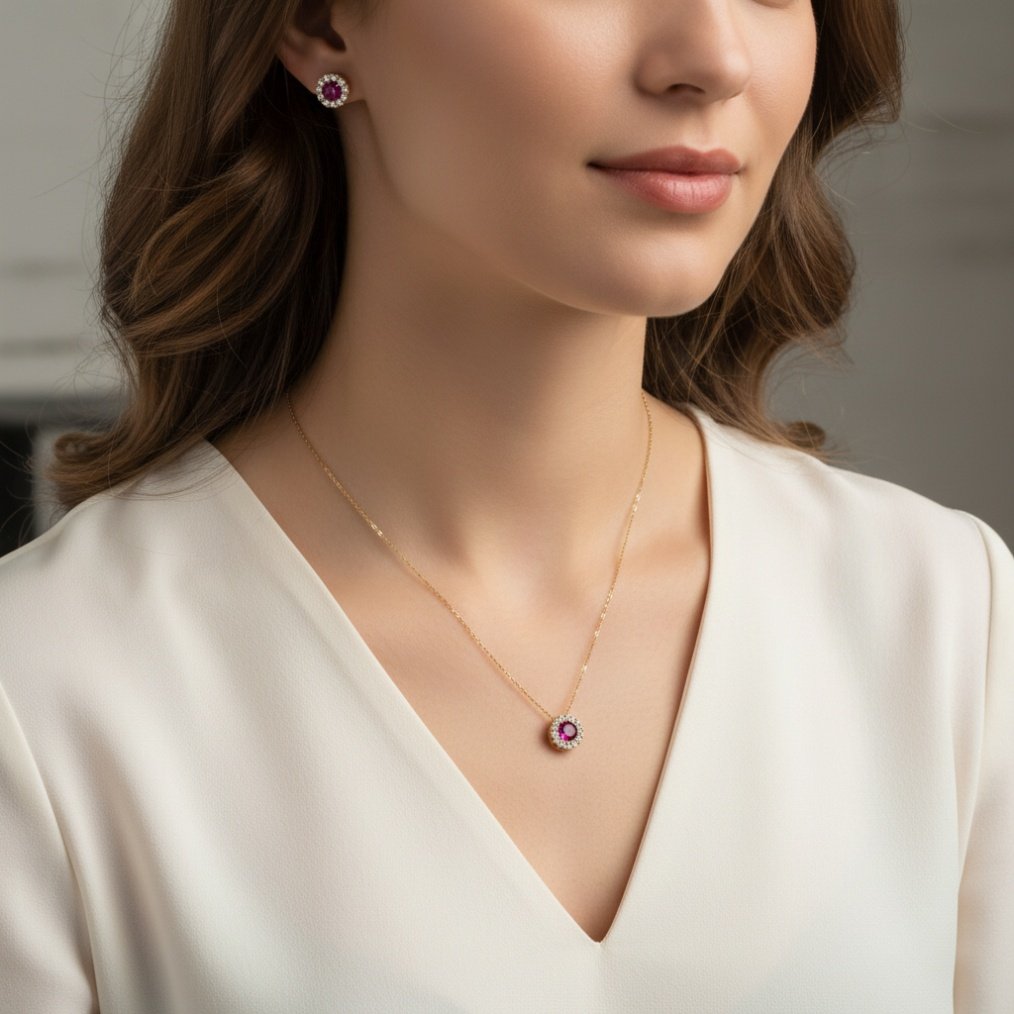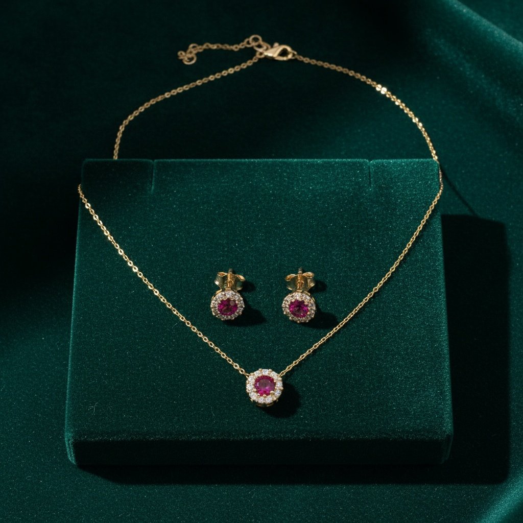 This elegant ensemble features a radiant ruby-red stone beautifully surrounded by sparkling white zircons, creating a captivating halo effect that evokes a timeless, royal look. The 42 cm fine gold chain perfectly showcases the brilliant round pendant, harmoniously paired with matching stud earrings for a complete and sophisticated style.