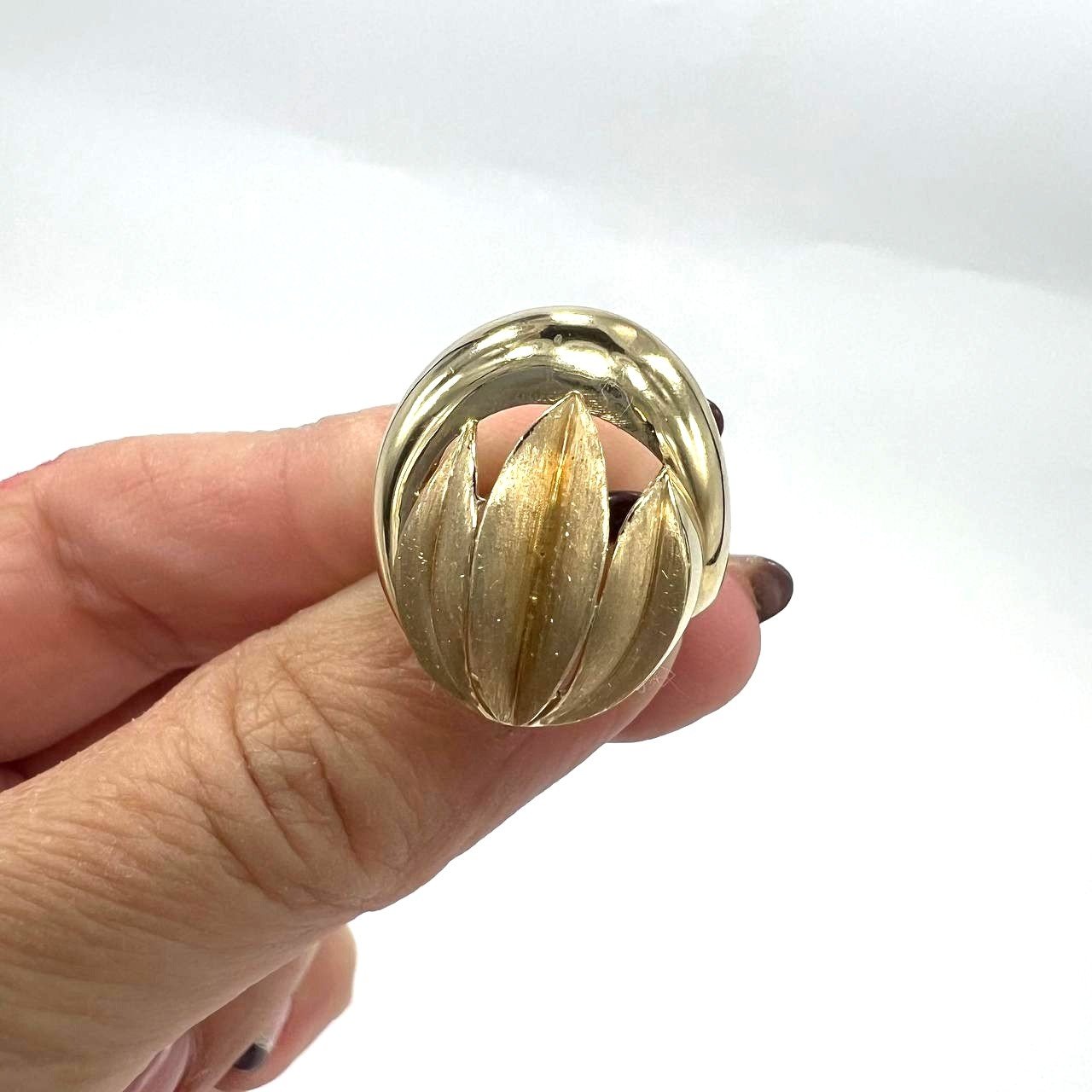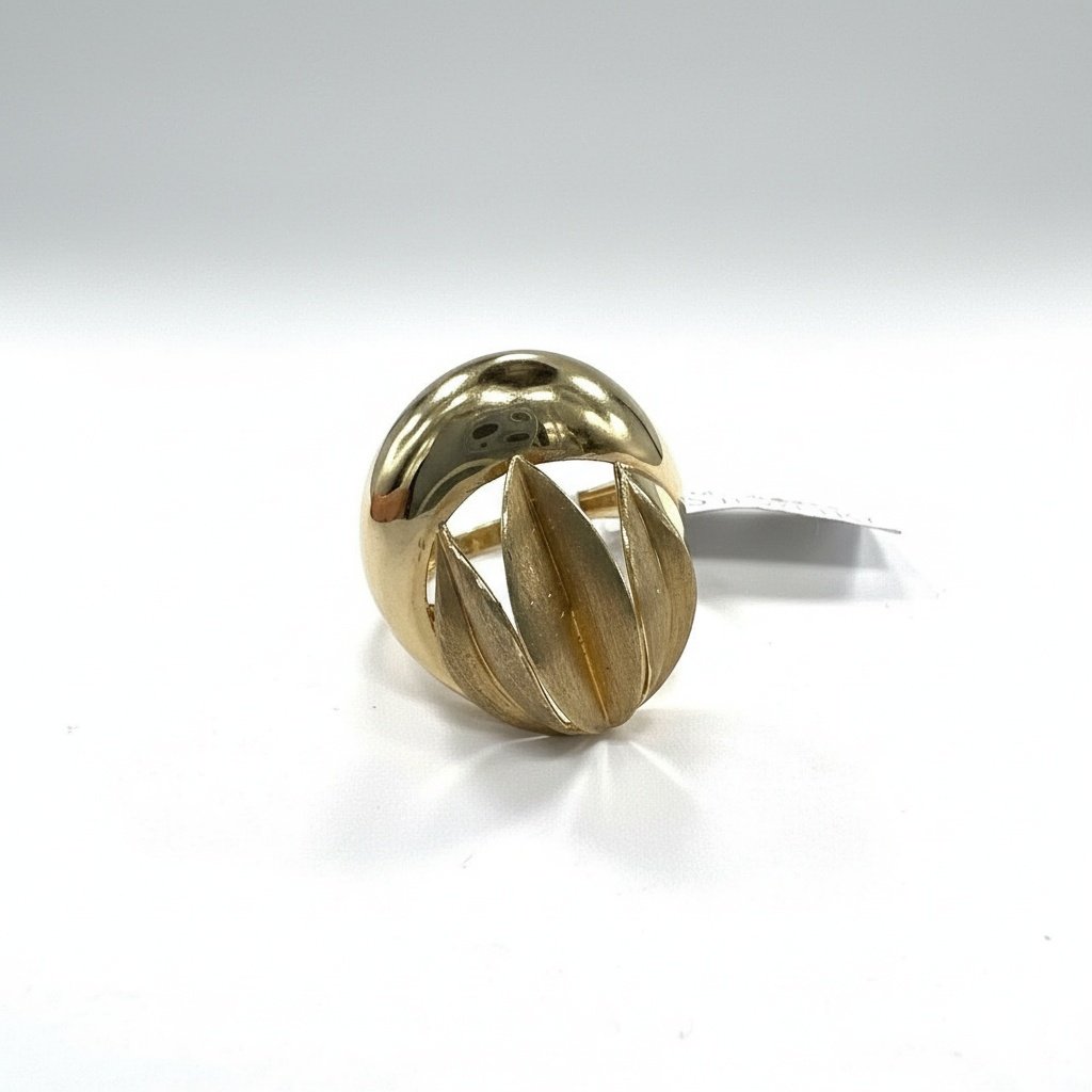 Discover the beauty of this 14K Yellow Gold Sculpted Dome Ring, crafted from 14K solid yellow gold with exceptional craftsmanship and refined design. This elegant piece features a bold dome shape with a unique sculpted center, showcasing elegant brushed-texture blades that create depth, movement, and artistic dimension. The striking contrast between the polished golden dome and the matte sculptural details makes this ring a true statement of modern luxury.