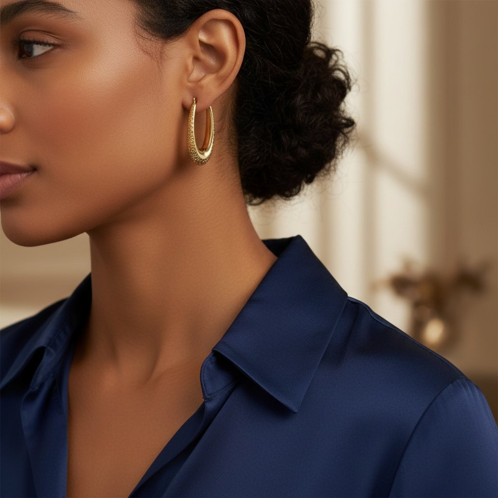 Discover the beauty of these 14K Yellow Gold Textured Oval Drop Earrings, crafted from 14K Yellow Gold with exceptional craftsmanship and refined design. This elegant pair features a brilliant diamond-cut texture on the front surface, creating a captivating sparkle with every movement, while the smooth backside ensures comfort. Combining timeless charm with modern elegance, these bold and radiant earrings add a sophisticated touch to any look, perfect for everyday wear, special occasions, or as a meaningful gift.