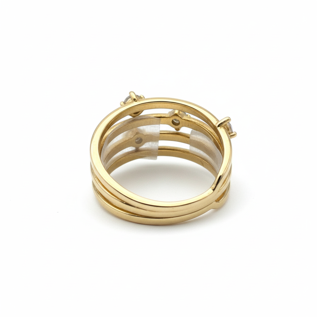 Discover timeless elegance with this exquisite 14K yellow gold women’s ring, designed to captivate and charm. This modern triple-band ring seamlessly blends classic luxury with contemporary style, making it a perfect addition to any jewelry collection. Adorned with three sparkling zircon stones, each delicately set on its own band, this piece offers a refined balance between striking brilliance and understated sophistication.