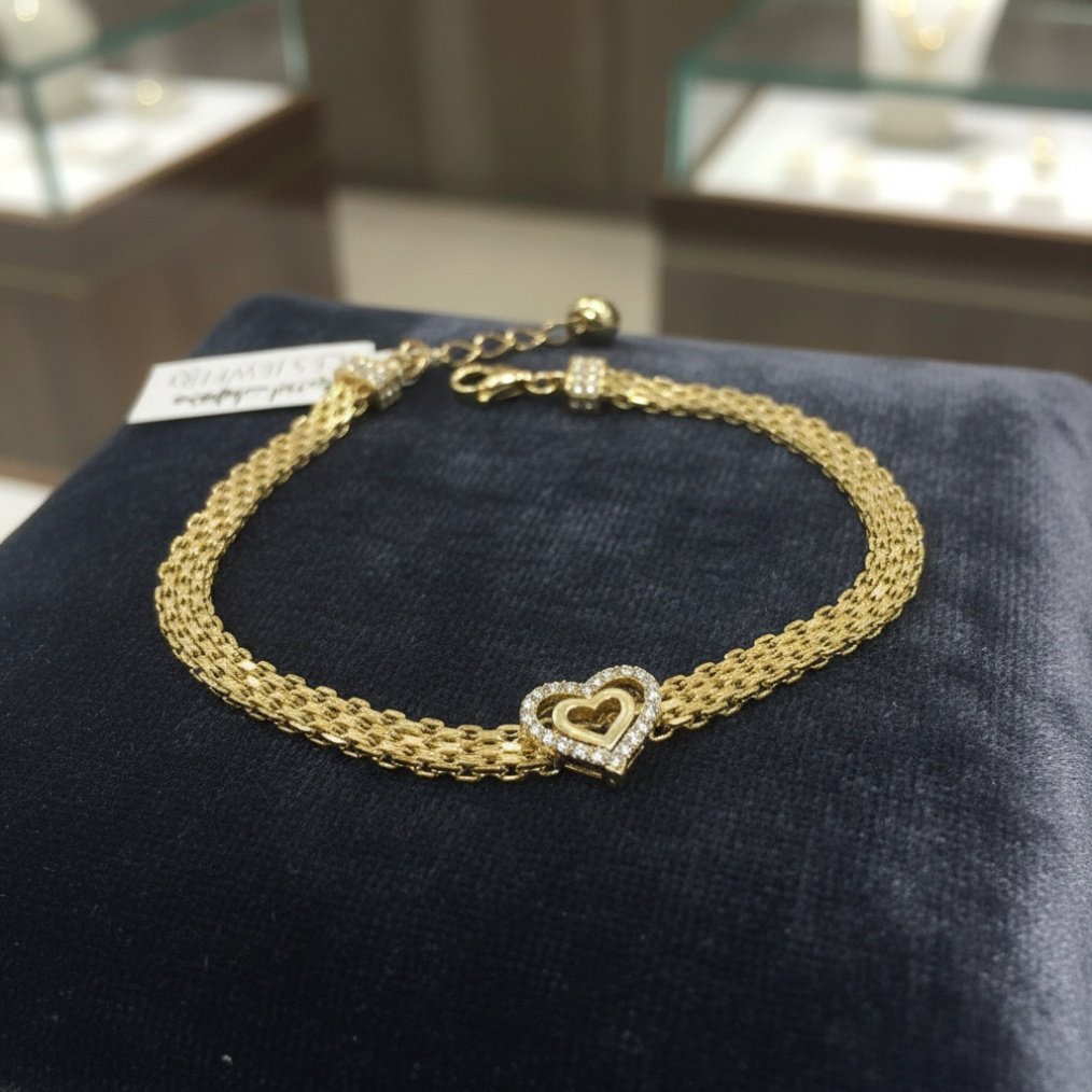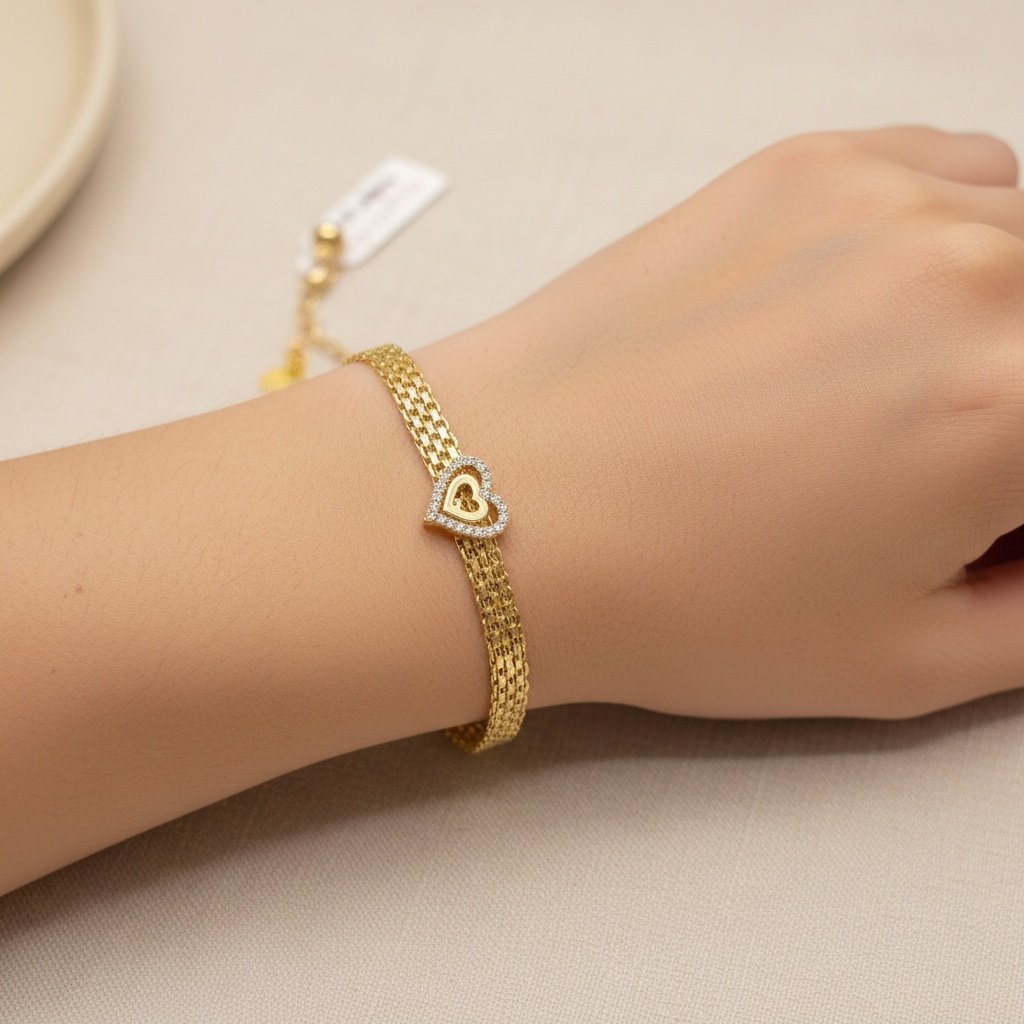 Discover the beauty of this Triple Chain Double Heart Bracelet, crafted from 14K Yellow Gold with exceptional craftsmanship and refined design. This elegant piece features a sparkling double-heart centerpiece, where the outer heart is lined with shimmering zircon stones, while the inner polished heart adds a soft, refined glow — symbolizing love, connection, and timeless beauty. Combining timeless charm with modern elegance, it adds a sophisticated touch to any look, making it perfect for everyday wear, special occasions, or as a meaningful gift.
