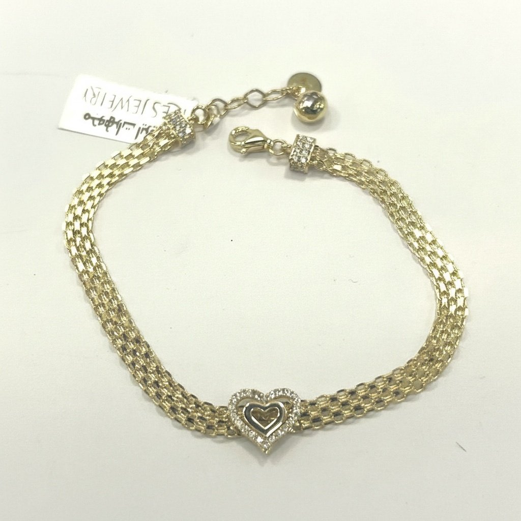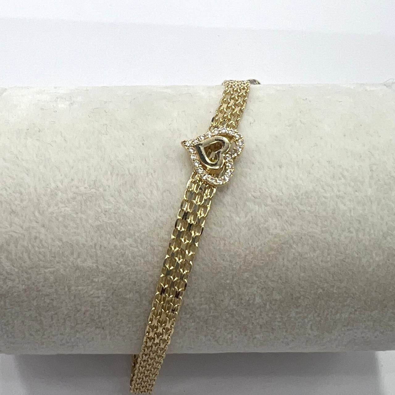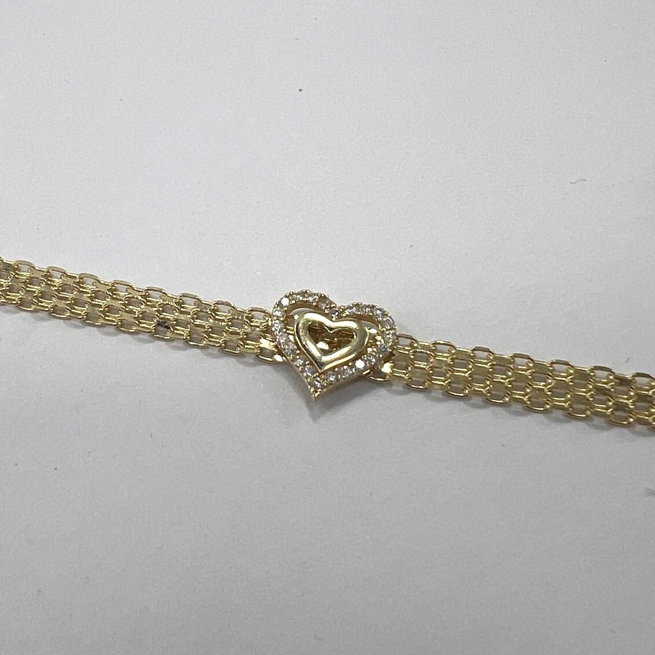 14K Yellow Gold Bracelet — Triple Chain Double Heart Zircon | New