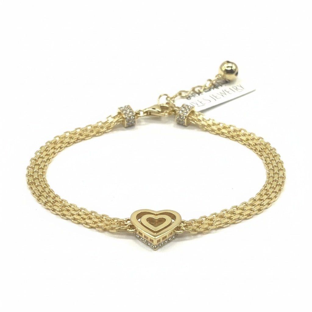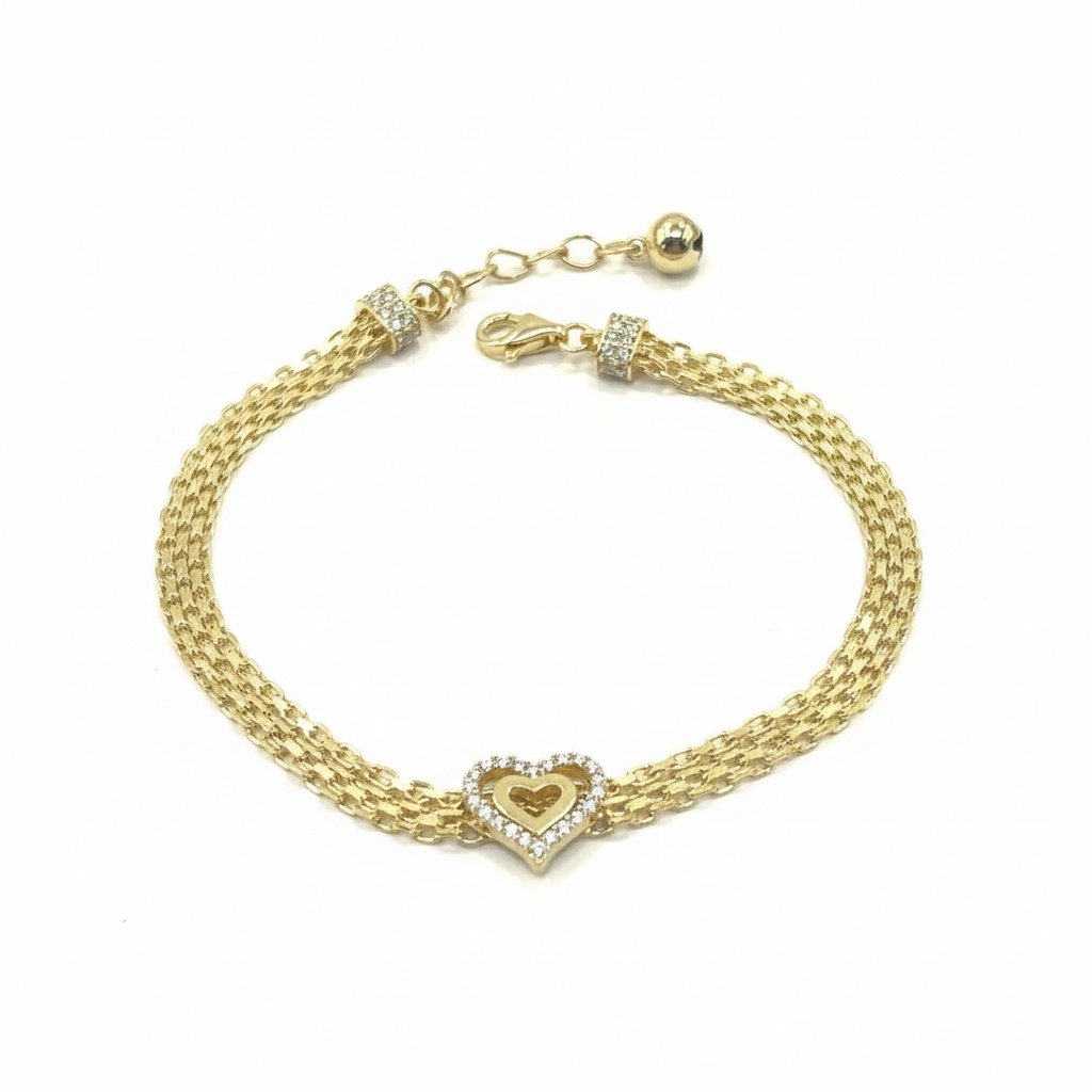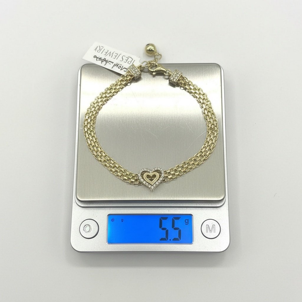 14K Yellow Gold Bracelet — Triple Chain Double Heart Zircon | New