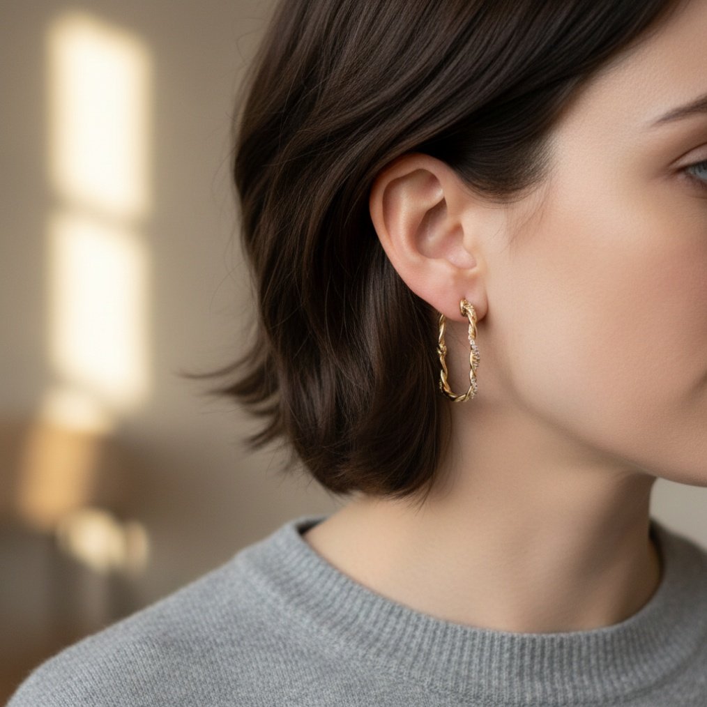 Hoop Earrings in 14K Yellow Gold — Twisted Braided Design with Zircon Stones | New