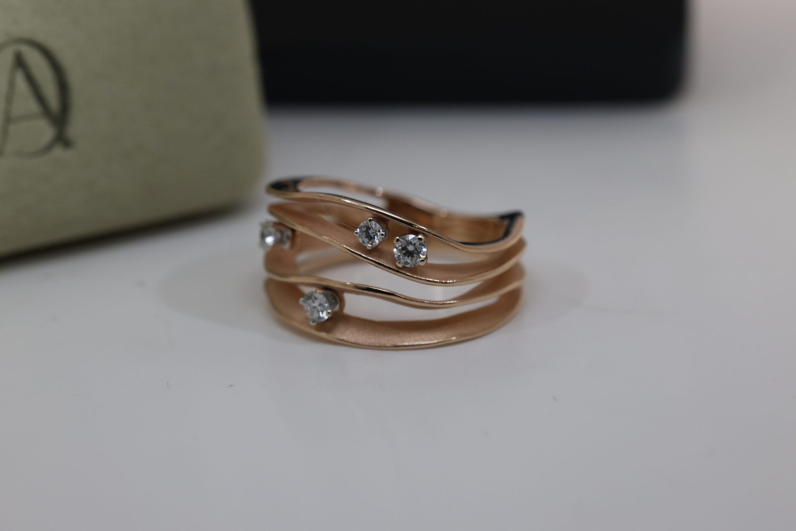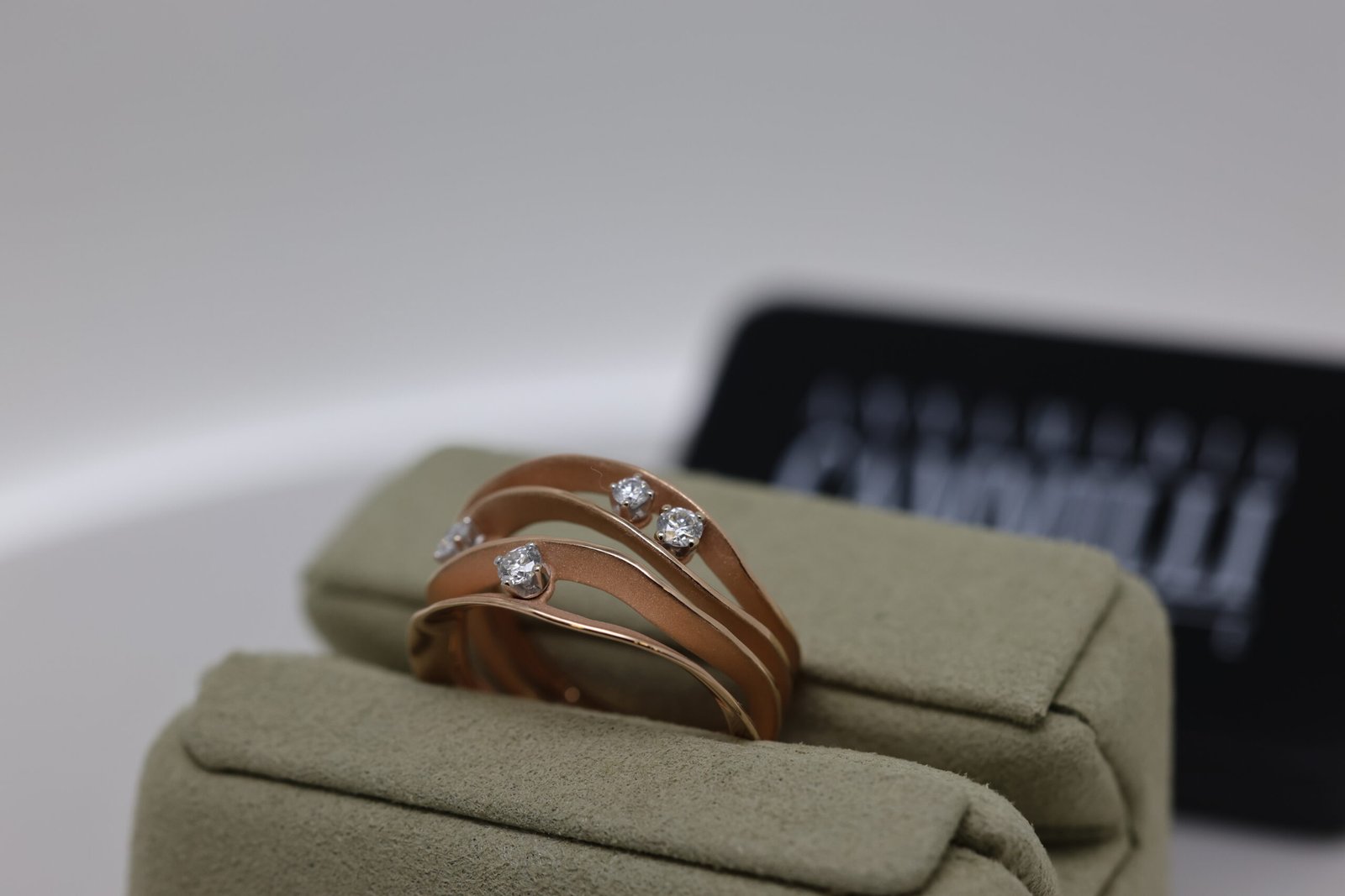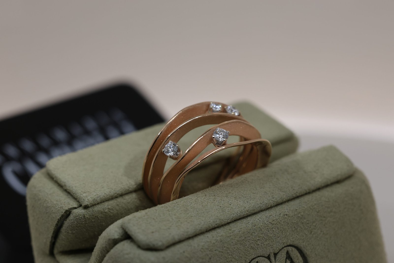 Introducing the ANNAMARIA CAMMILLI DIAMOND RING in 18K GOLD, a stunning piece that draws inspiration from the enchanting beauty of desert sand dunes. This exquisite ring embodies the graceful movement of wind over the soft, undulating sands, capturing the essence of nature’s artistry. Its unique design features interwoven golden layers that merge into a breathtaking three-dimensional form, embodying both elegance and sophistication.