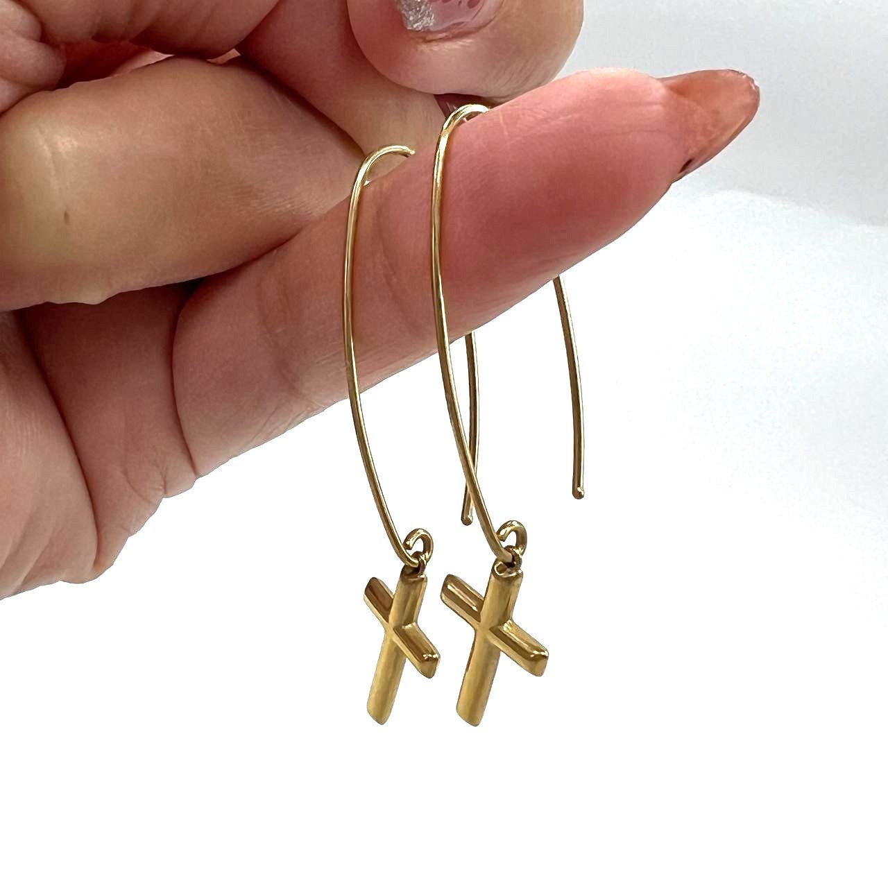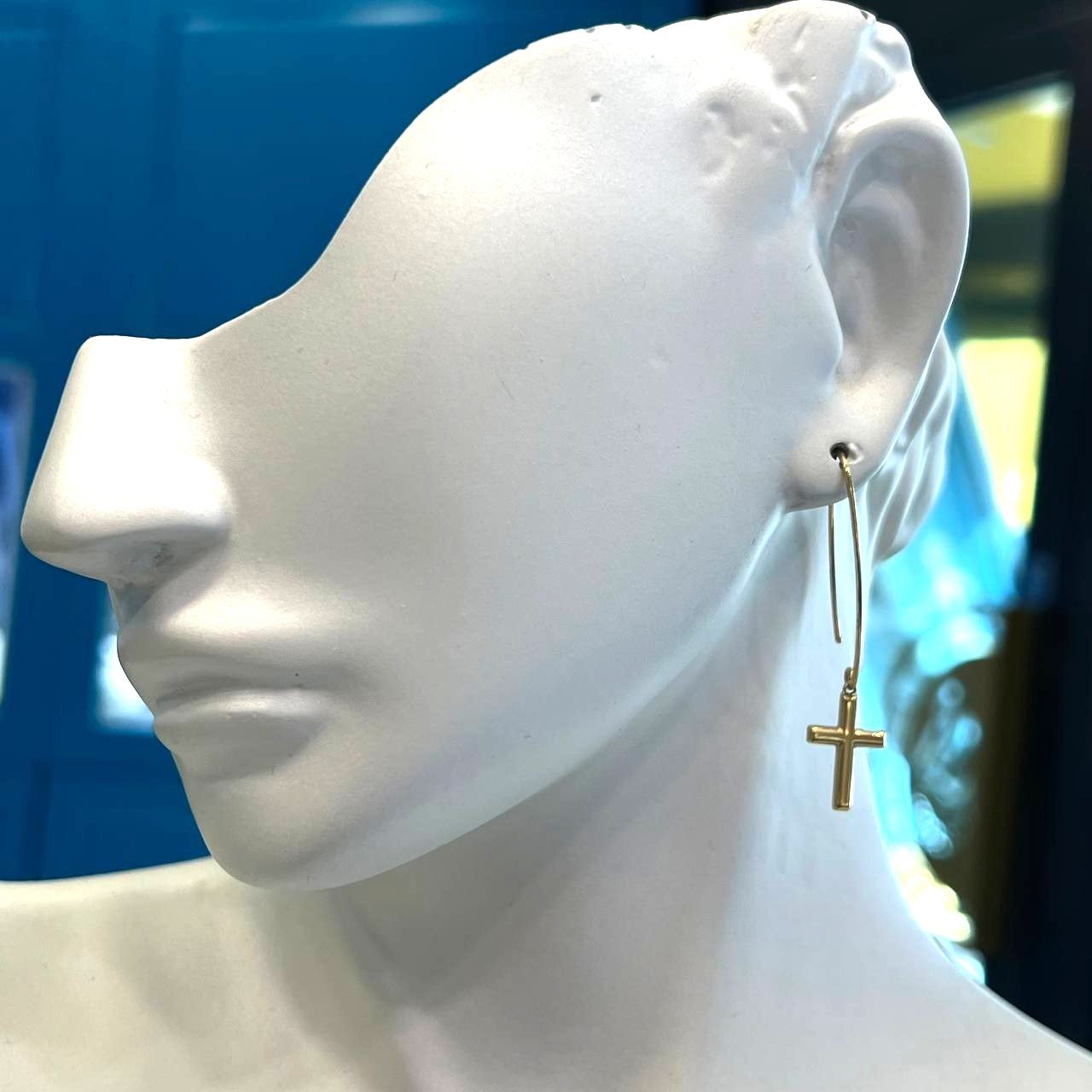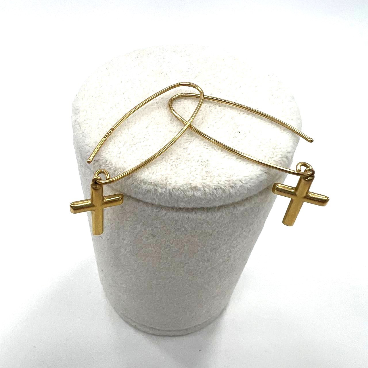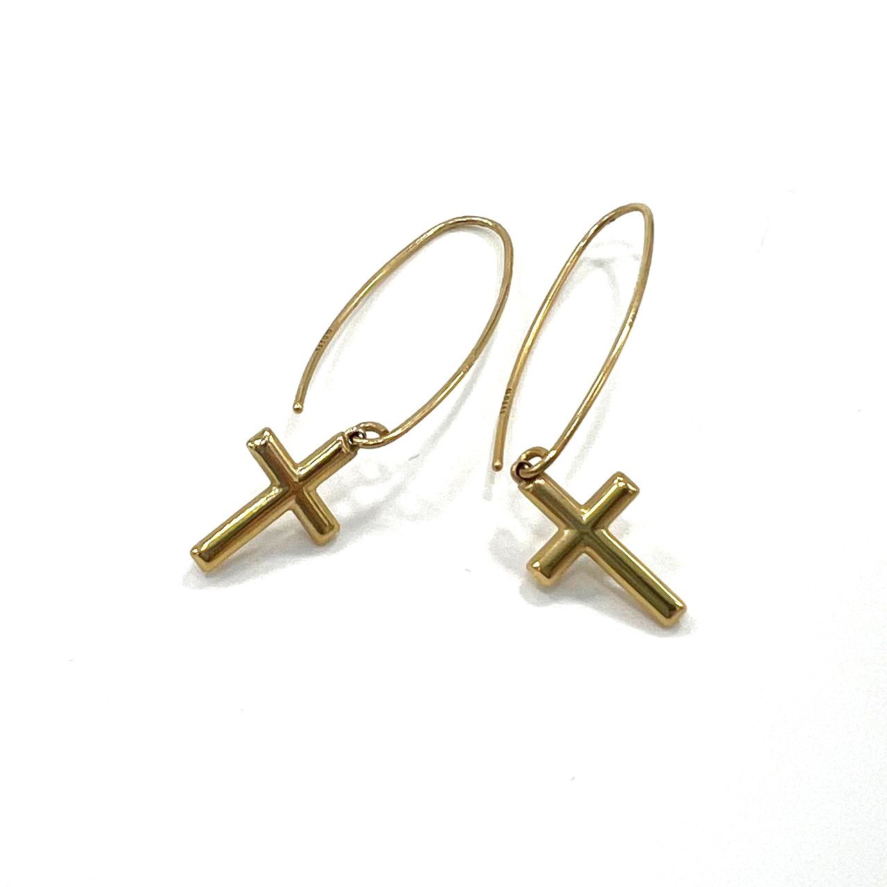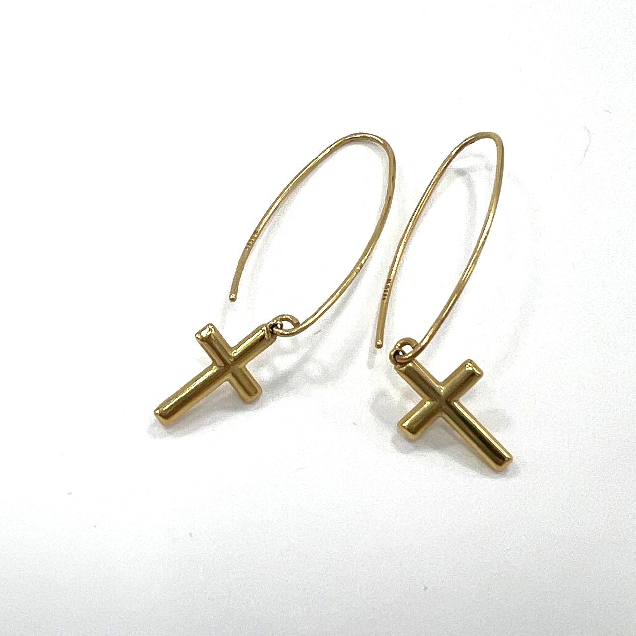 Elegant 14K yellow gold dangle cross earrings, simple and refined design.