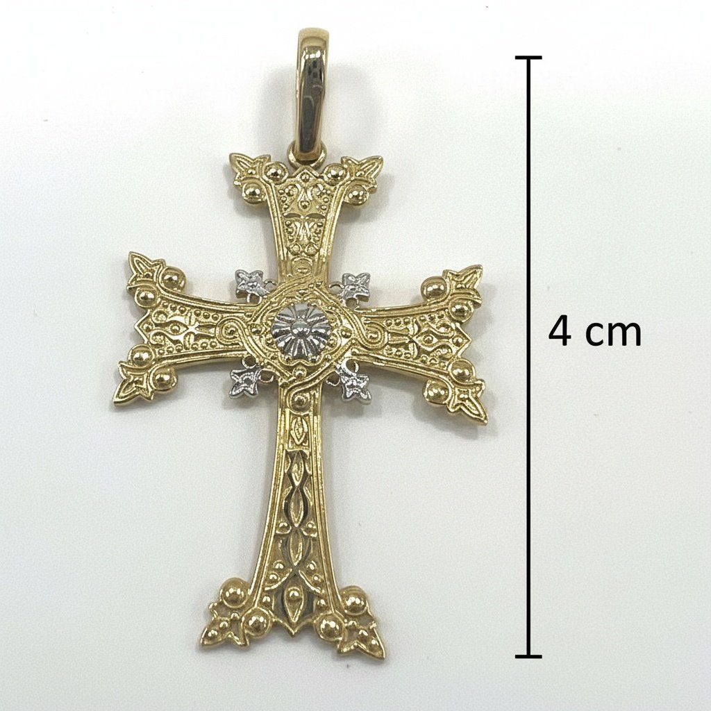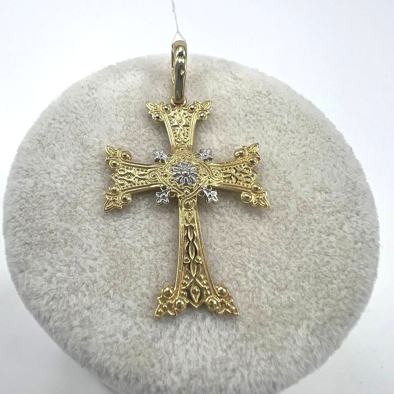 Discover the profound beauty of this elegant 14K Yellow Gold Cross Pendant, masterfully crafted from high-quality 14K Yellow Gold to reflect the artistry of traditional jewelry design. This exquisite piece features intricate ornamental detailing and beautifully sculpted patterns along its arms, creating a rich texture and a distinguished presence. The contrasting central accent, likely white gold, adds depth and visual harmony, elevating its aesthetic appeal.
