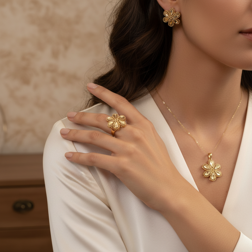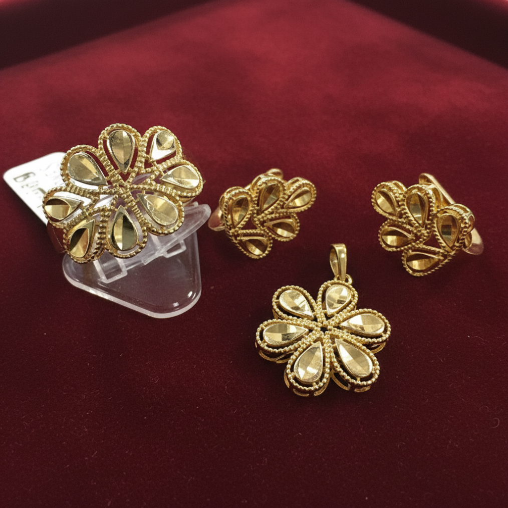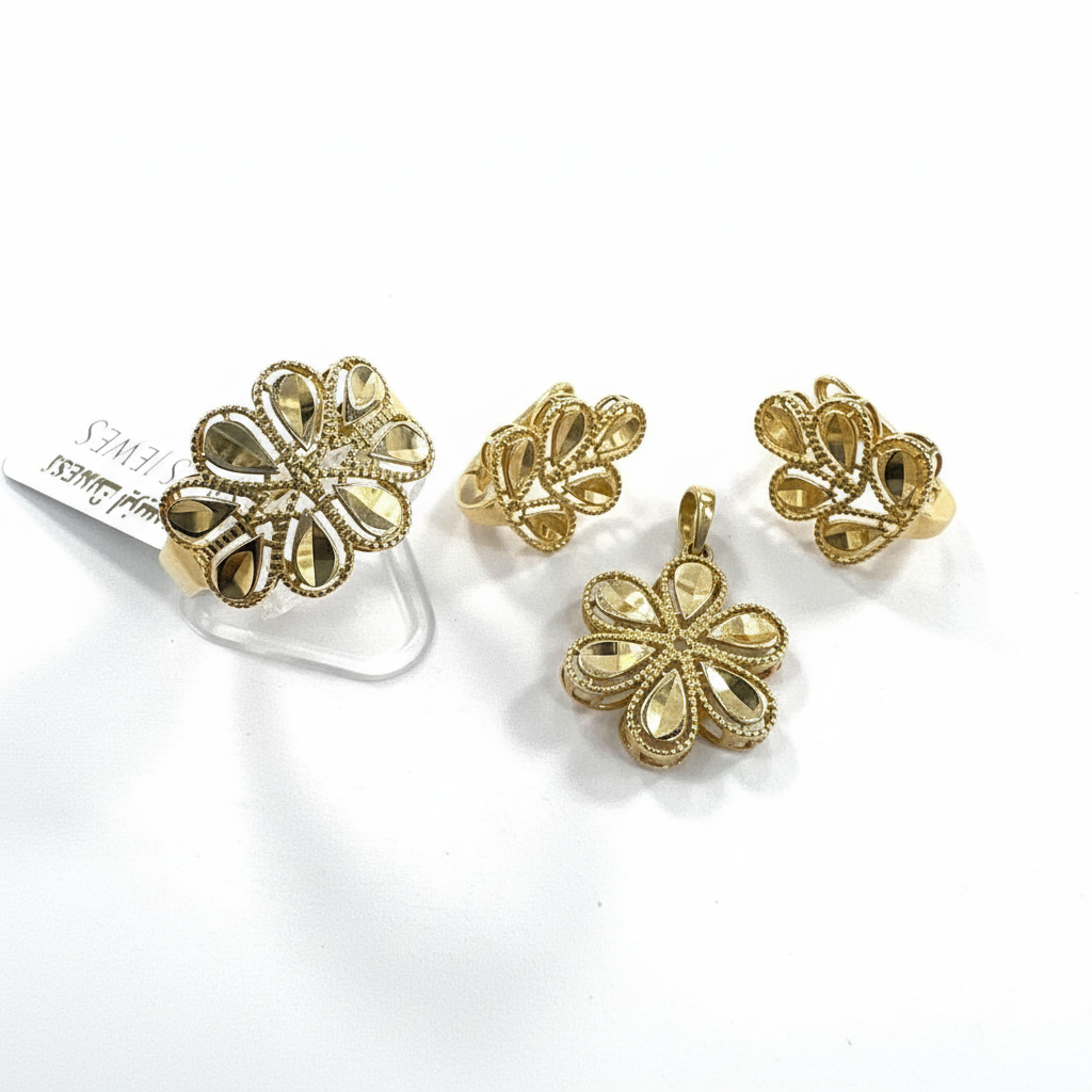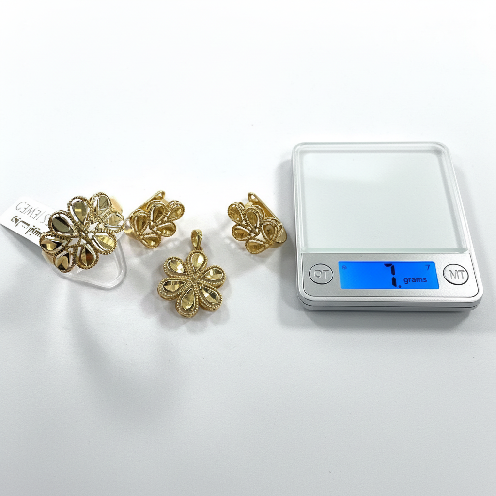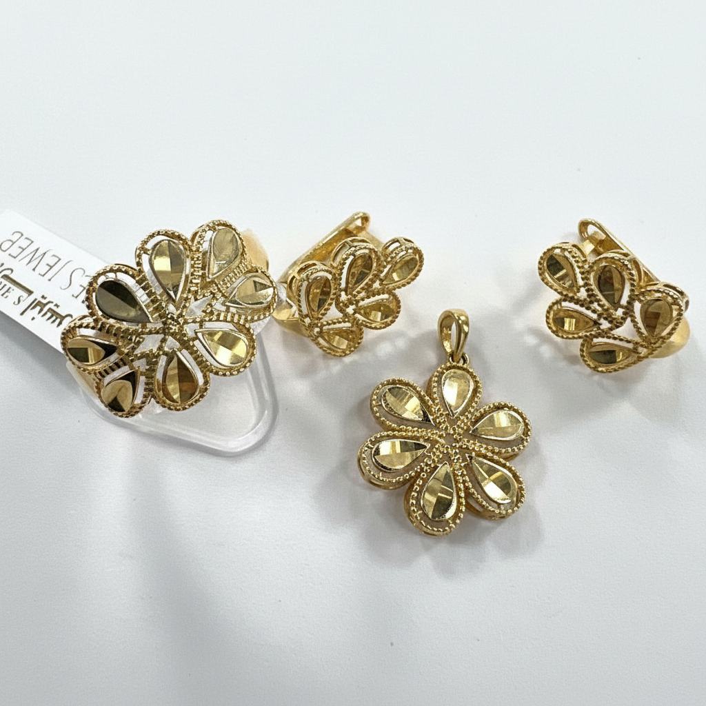 14K Yellow Gold Floral Petal Jewelry Set — Ring, Earrings & Pendant | New