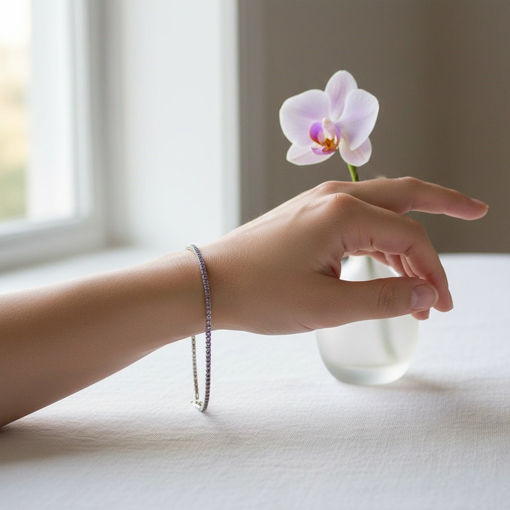 Discover the timeless beauty of this exquisite Purple Zircon Tennis Bracelet, meticulously crafted from 14K White Gold with exceptional craftsmanship and refined design. This elegant piece features a continuous line of vibrant purple zircon stones that brilliantly catch the light, creating a modern, sophisticated look. It’s perfect for both everyday wear and those special occasions where you want to add a touch of deep sparkle. Combining timeless charm with modern elegance, it adds a sophisticated touch to any look.