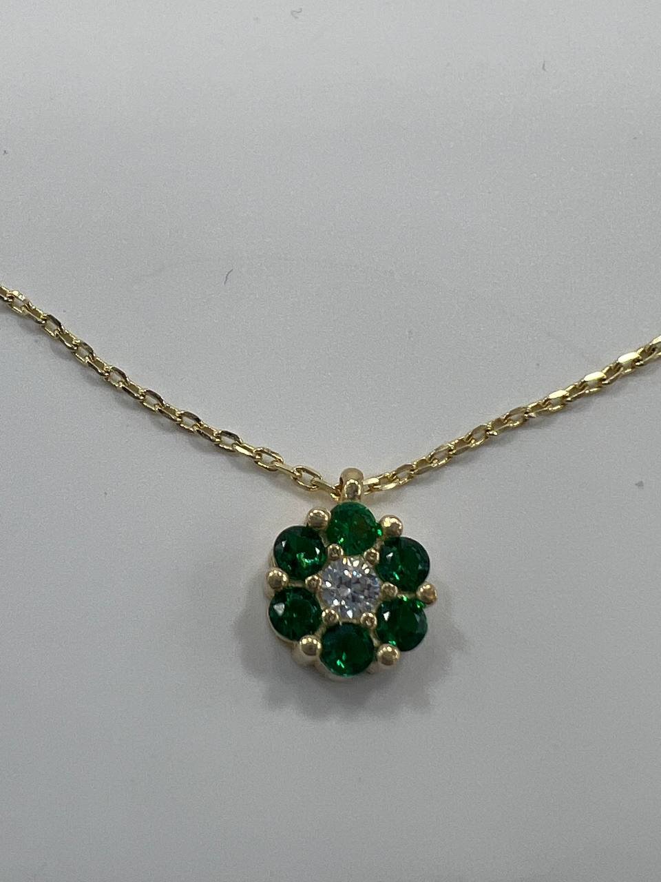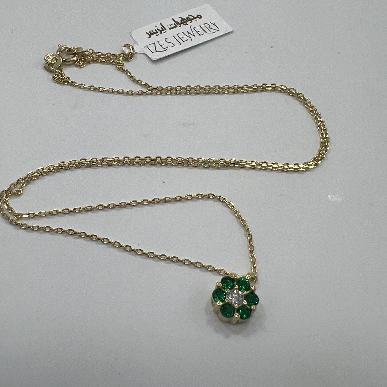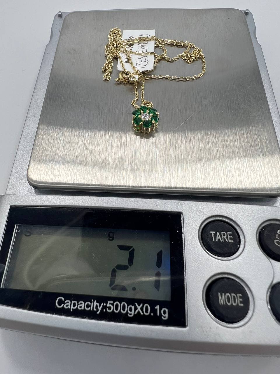 New 14K Solid Gold Necklace Italy – Green & White Zircon Flower Pendant 2.1g