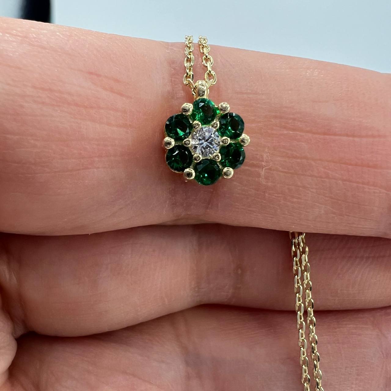 The pendant showcases a charming flower cluster design, featuring vivid green zircon stones encircling a brilliant white zircon center. This harmonious blend of colors radiates elegance and creates a lively, eye-catching look.