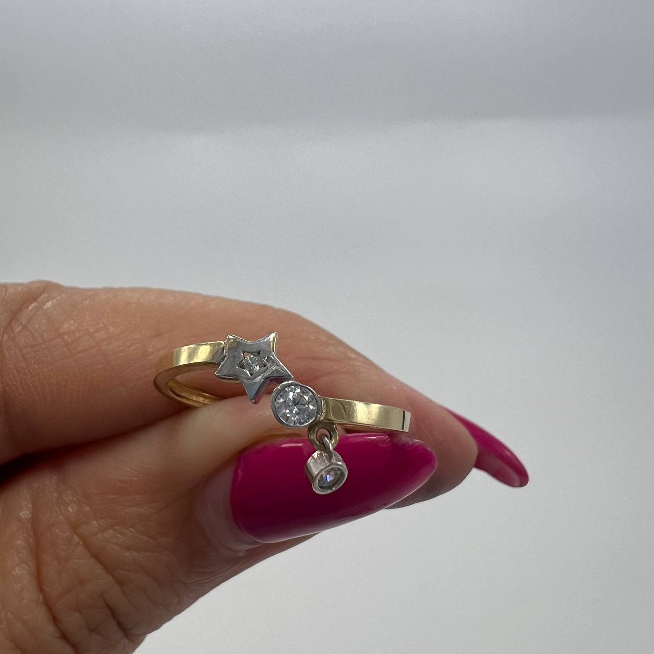 The design features a star-shaped setting with a white zircon at its center, followed by two sparkling zircons, one of which gently dangles for extra movement and shine. The combination of polished gold and shimmering stones creates a chic and youthful look.