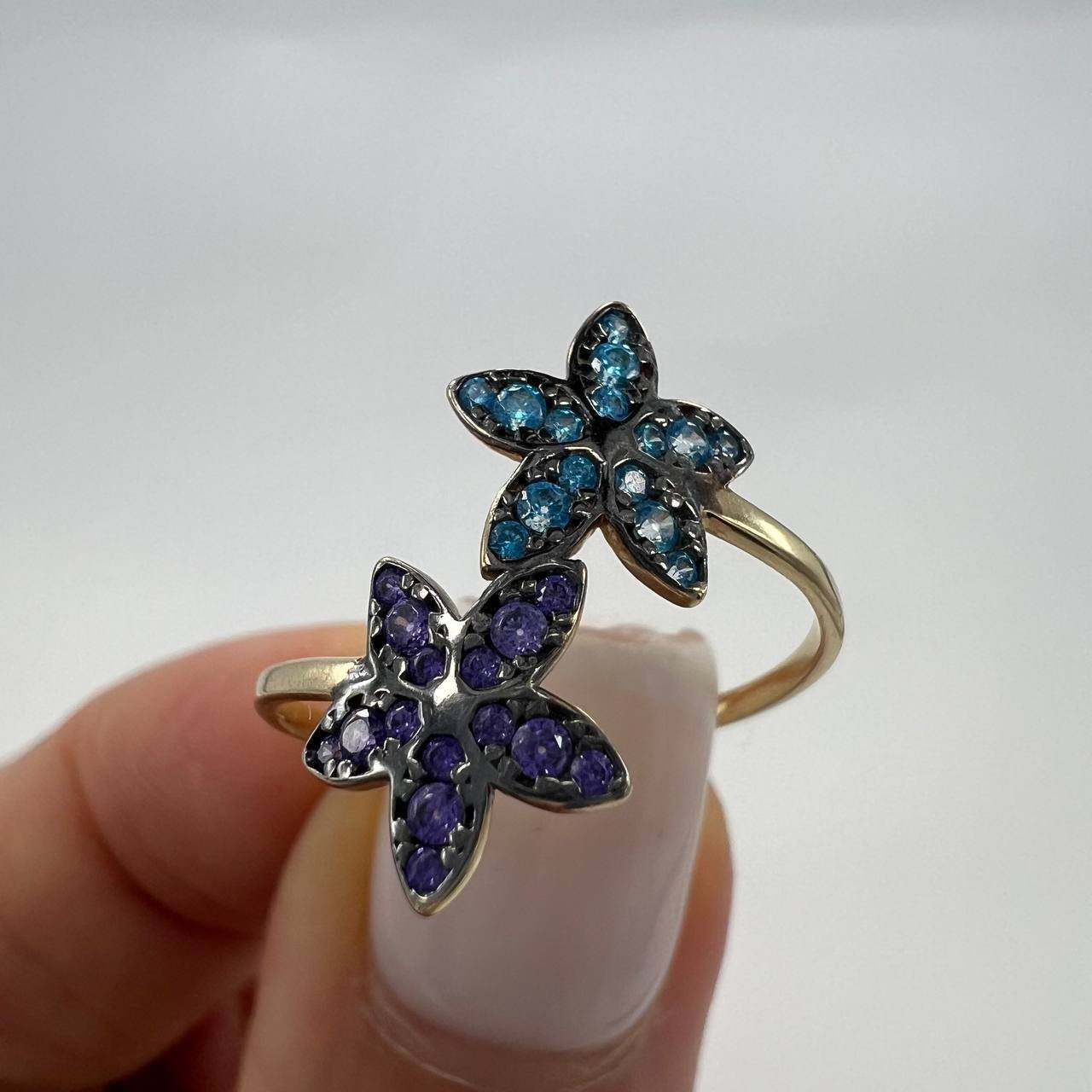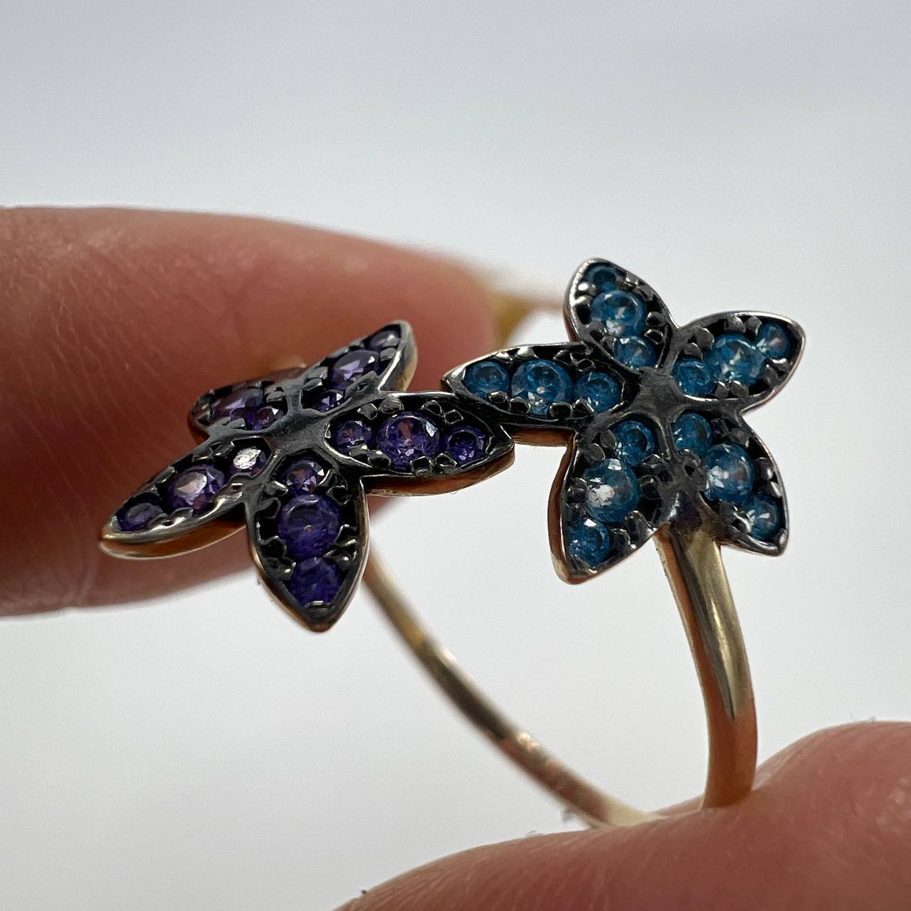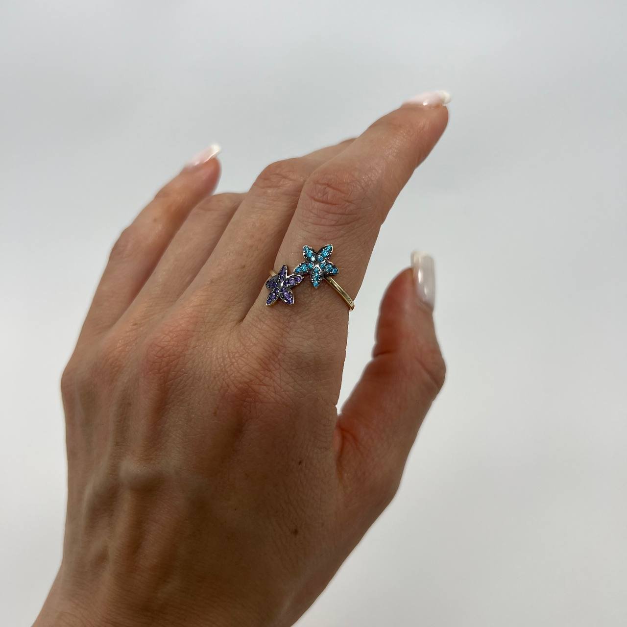 Add a touch of the ocean’s beauty to your jewelry collection with this unique 14K solid gold ring, designed in a captivating double starfish motif. Each starfish is adorned with vibrant stones – one in rich violet and the other in brilliant blue – creating a playful yet sophisticated contrast.