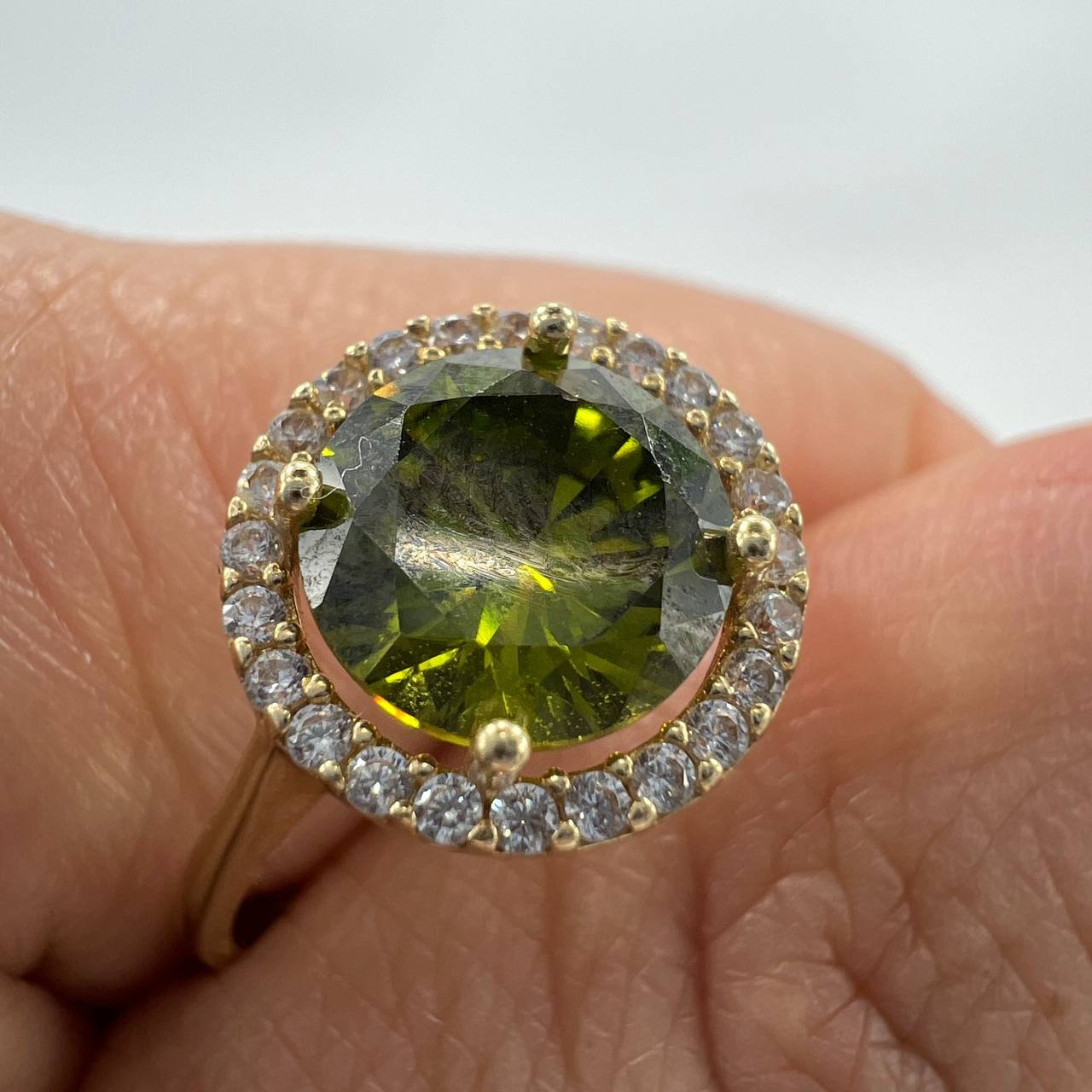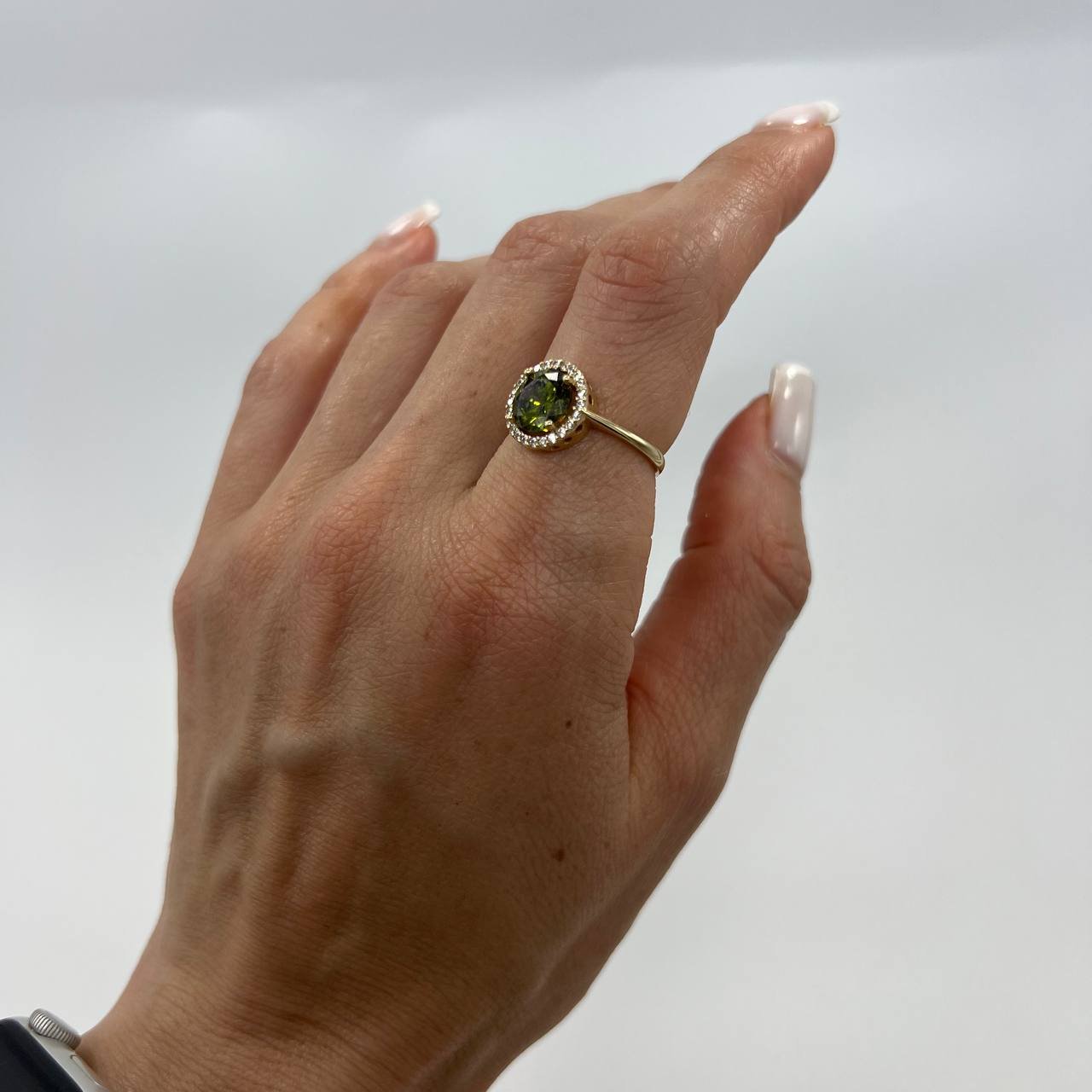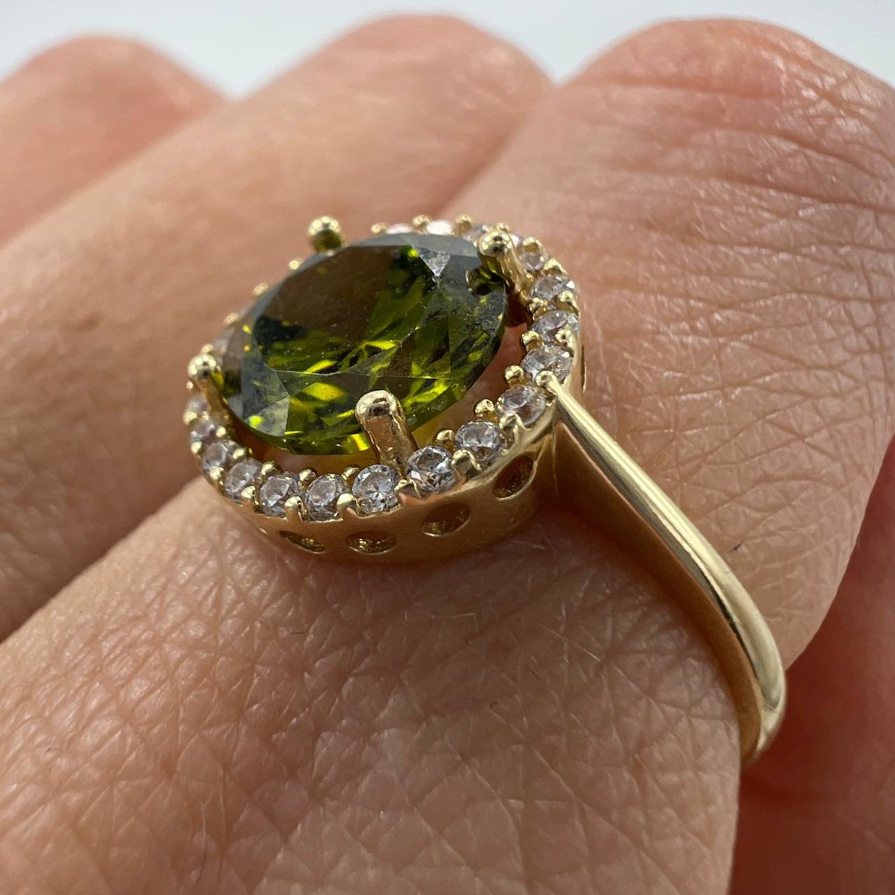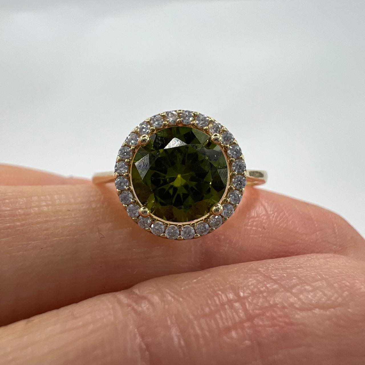 Add a touch of sophistication to your jewelry collection with this elegant 14K solid gold ring. At its center, a deep green gemstone radiates natural beauty, surrounded by a sparkling halo of fine white gemstones. The contrast between the vivid green and the shimmering crystals makes this piece both timeless and eye-catching.