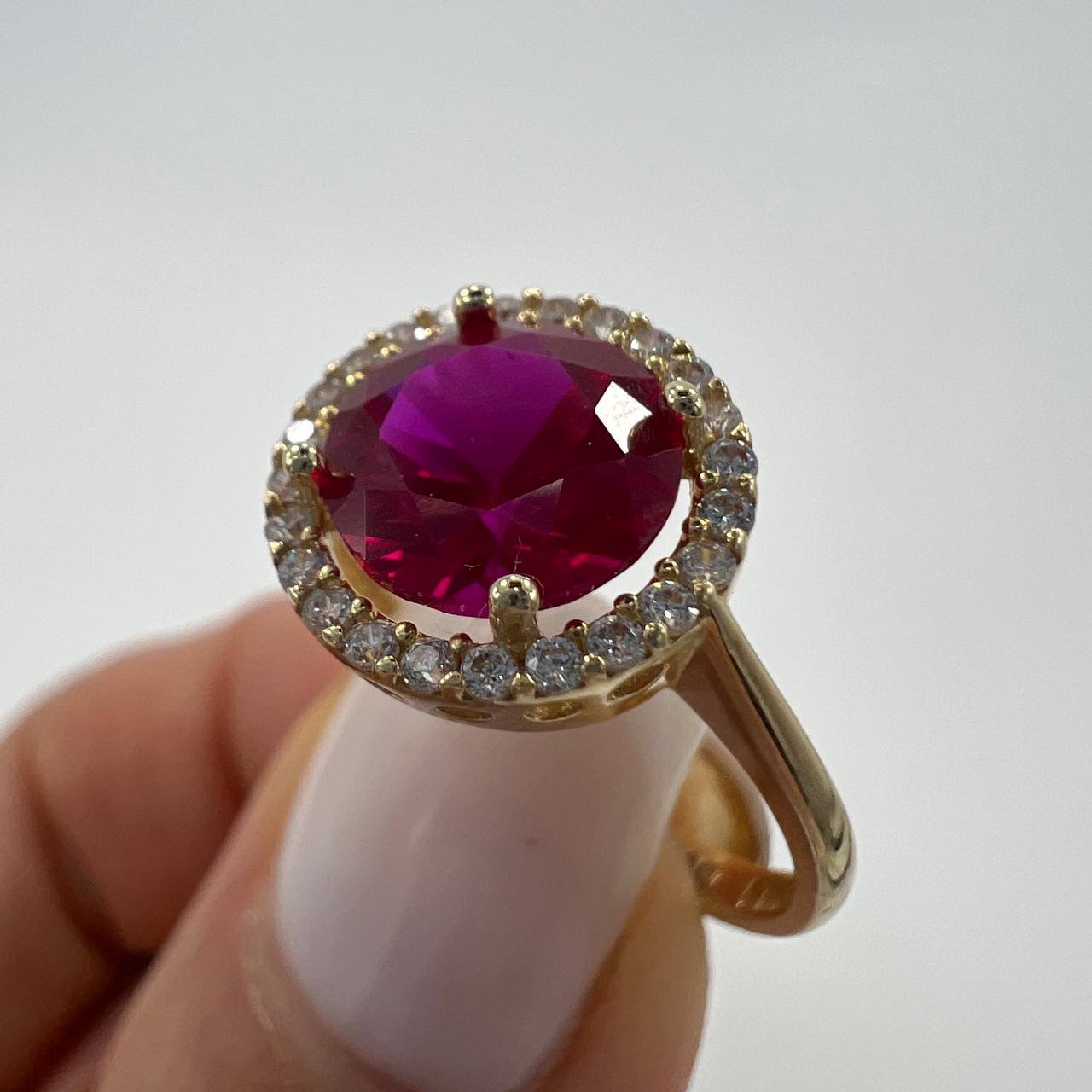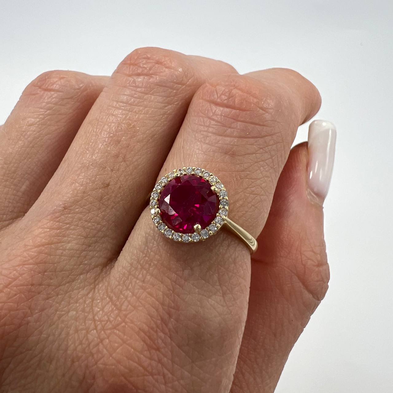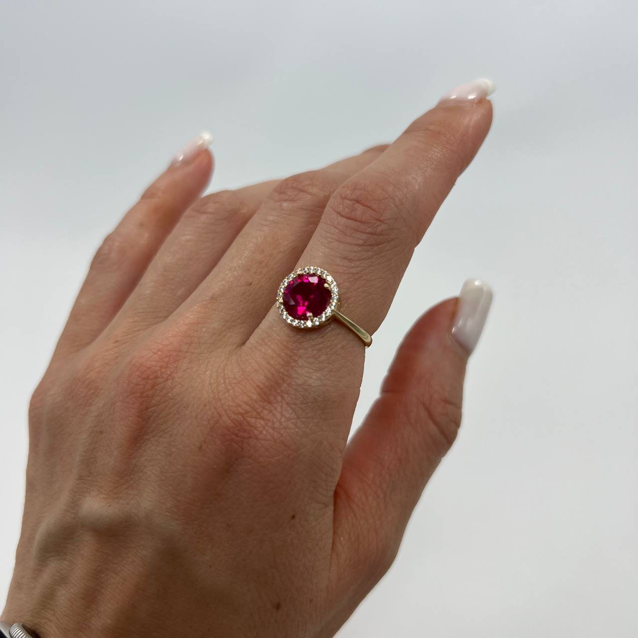 Crafted in polished 14K yellow gold, this ring features a classic round halo design that exudes sophistication. The central ruby-red gemstone is secured in a refined prong setting, allowing light to reflect through with maximum sparkle. The surrounding halo of clear stones adds depth, brilliance, and an air of luxury, making this piece equally perfect for everyday glamour or evening occasions.