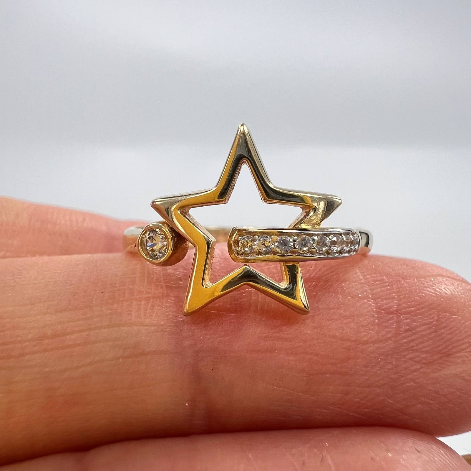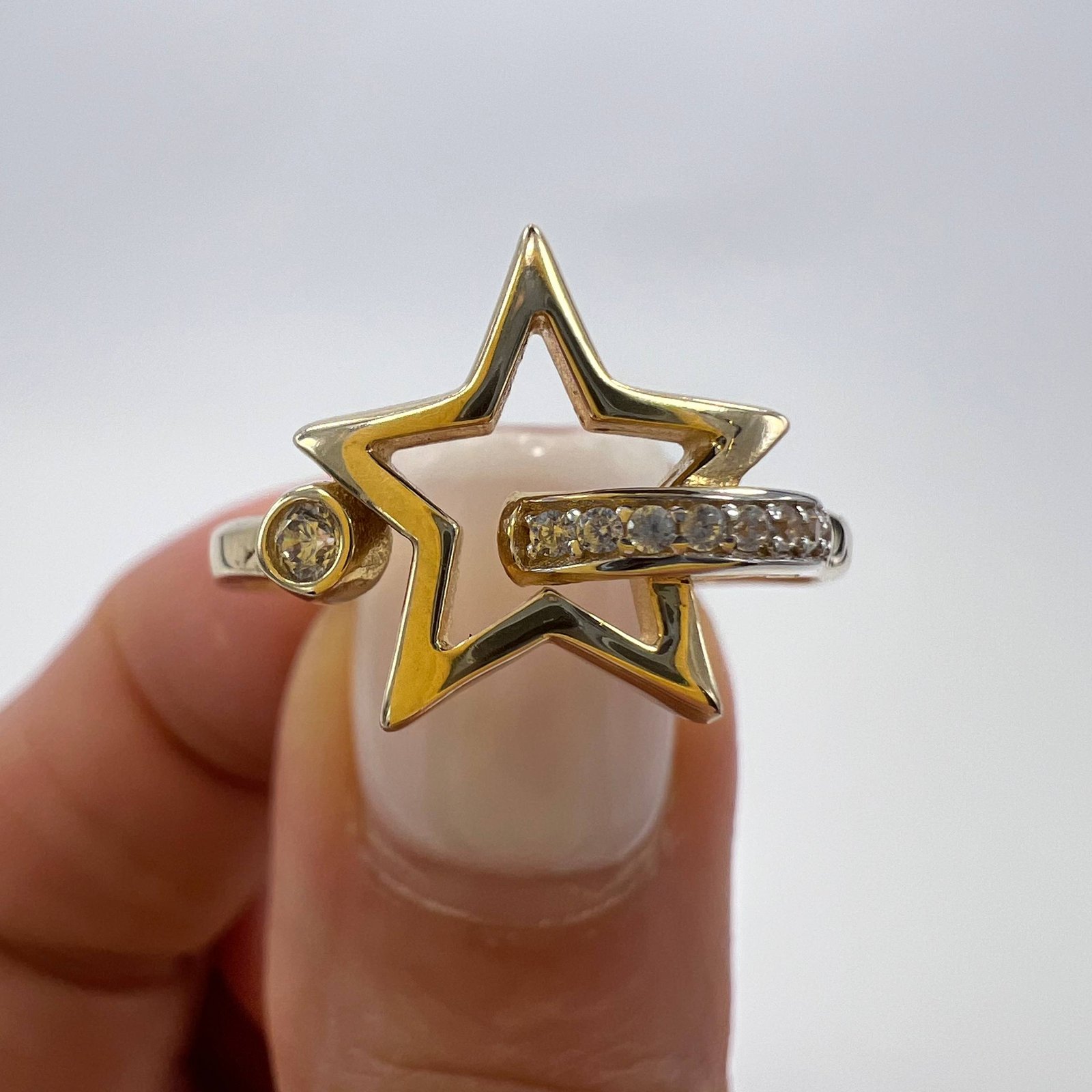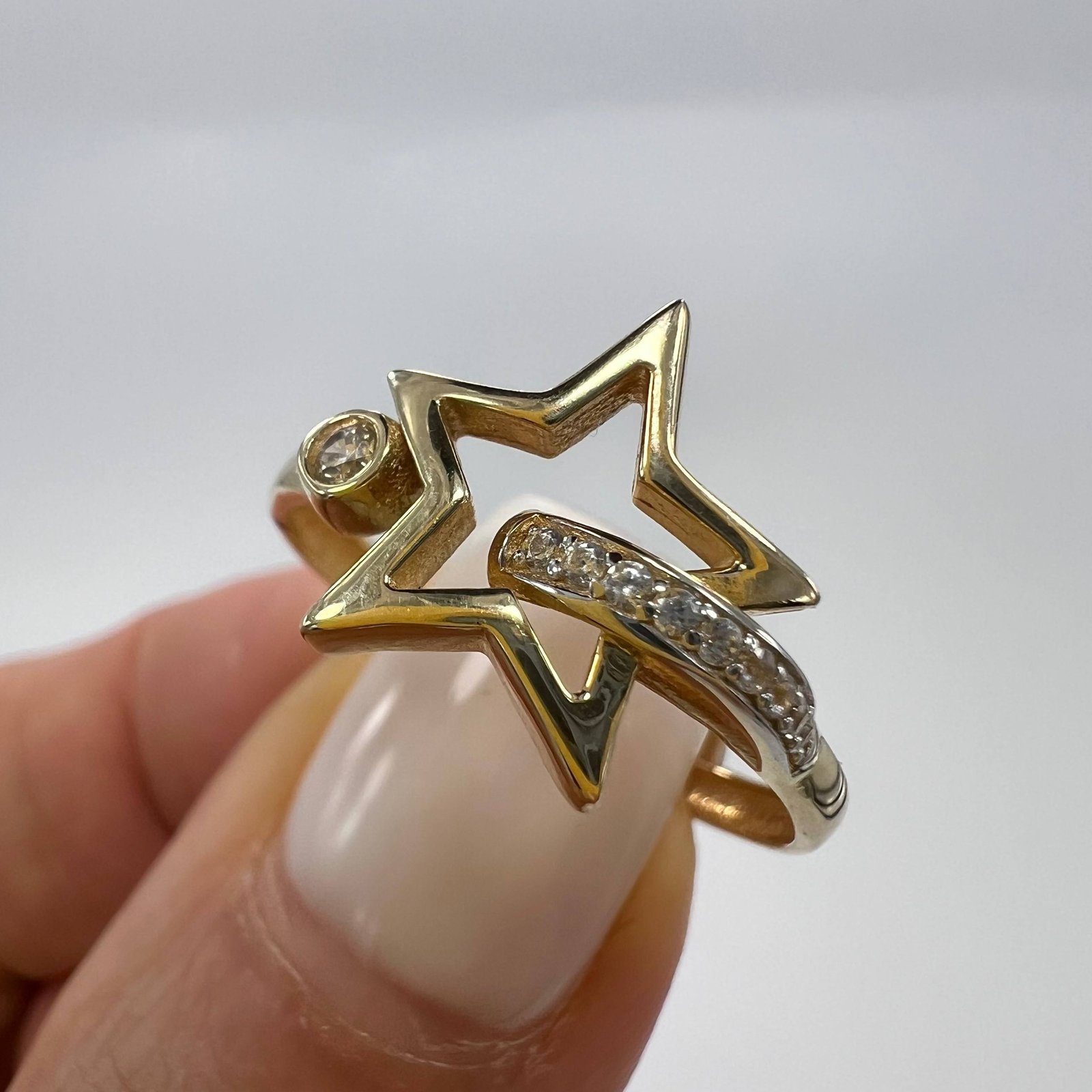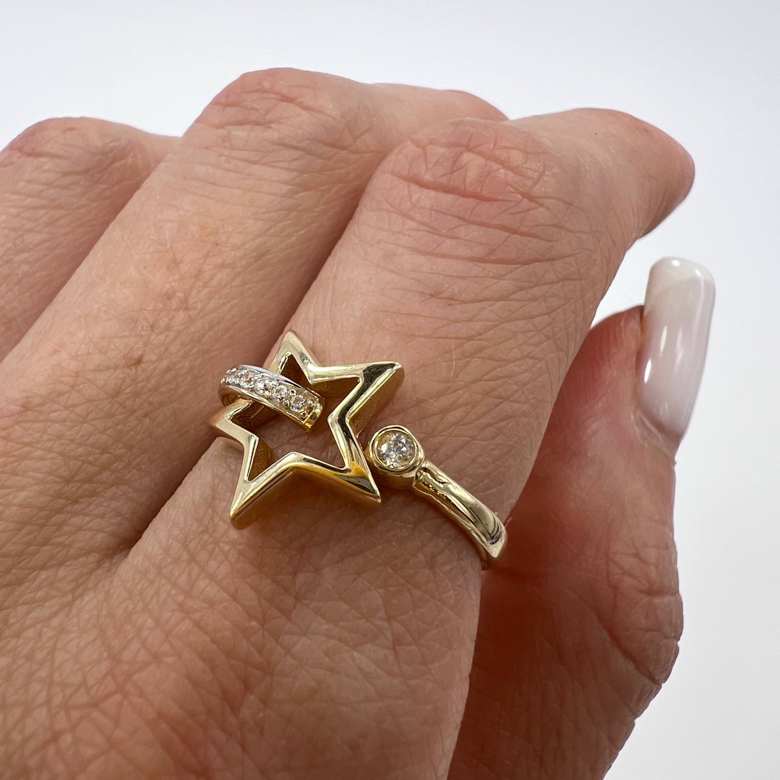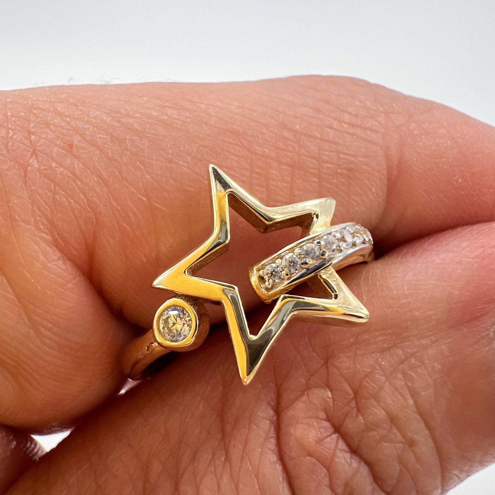 Shine bright with this stunning Italian 14K solid gold ring featuring a modern star design accented with sparkling cubic zirconia. The open star motif, combined with a delicate row of shimmering stones and a bezel-set crystal, creates a unique and playful look full of charm and elegance.