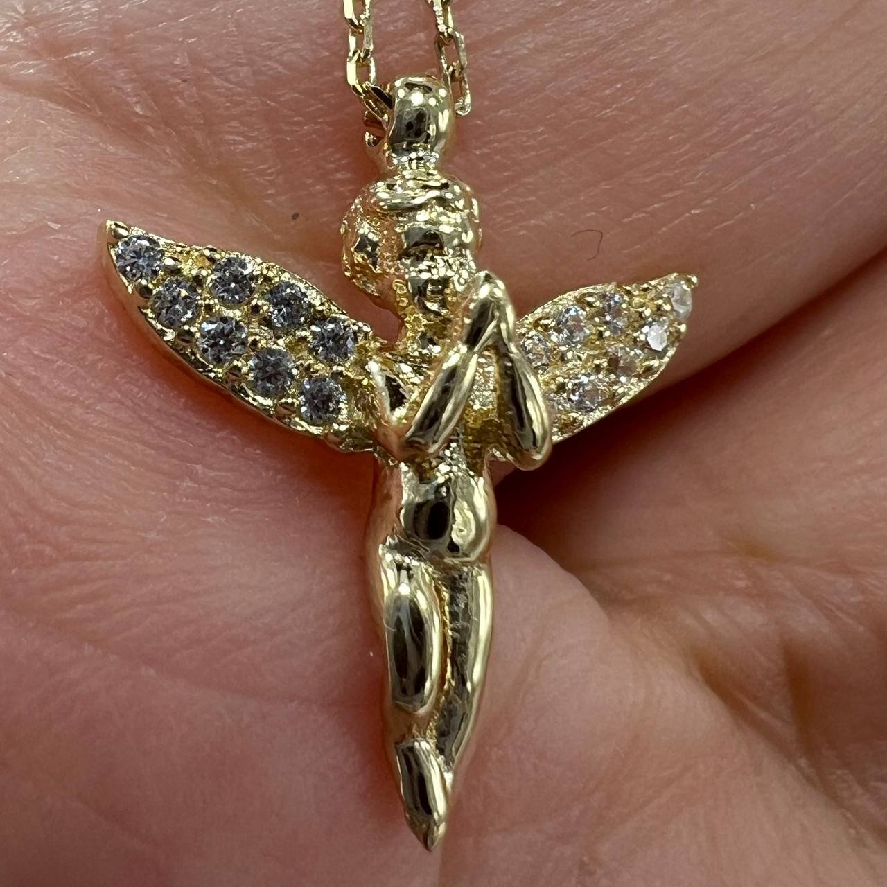 This exquisite 14K Solid Gold Necklace with an Angel Pendant is a true symbol of elegance and protection. Handcrafted with precision, the pendant features a finely detailed praying angel, its wings encrusted with sparkling white stones that capture and reflect the light beautifully. The polished gold body adds warmth and sophistication, making this piece not only a statement of style but also of spiritual meaning.