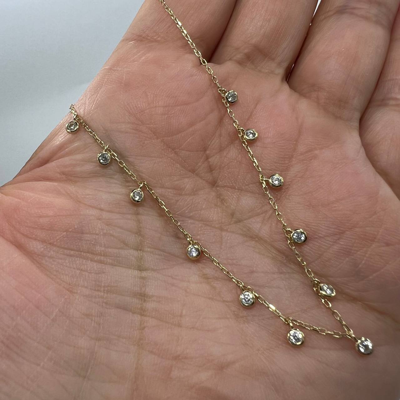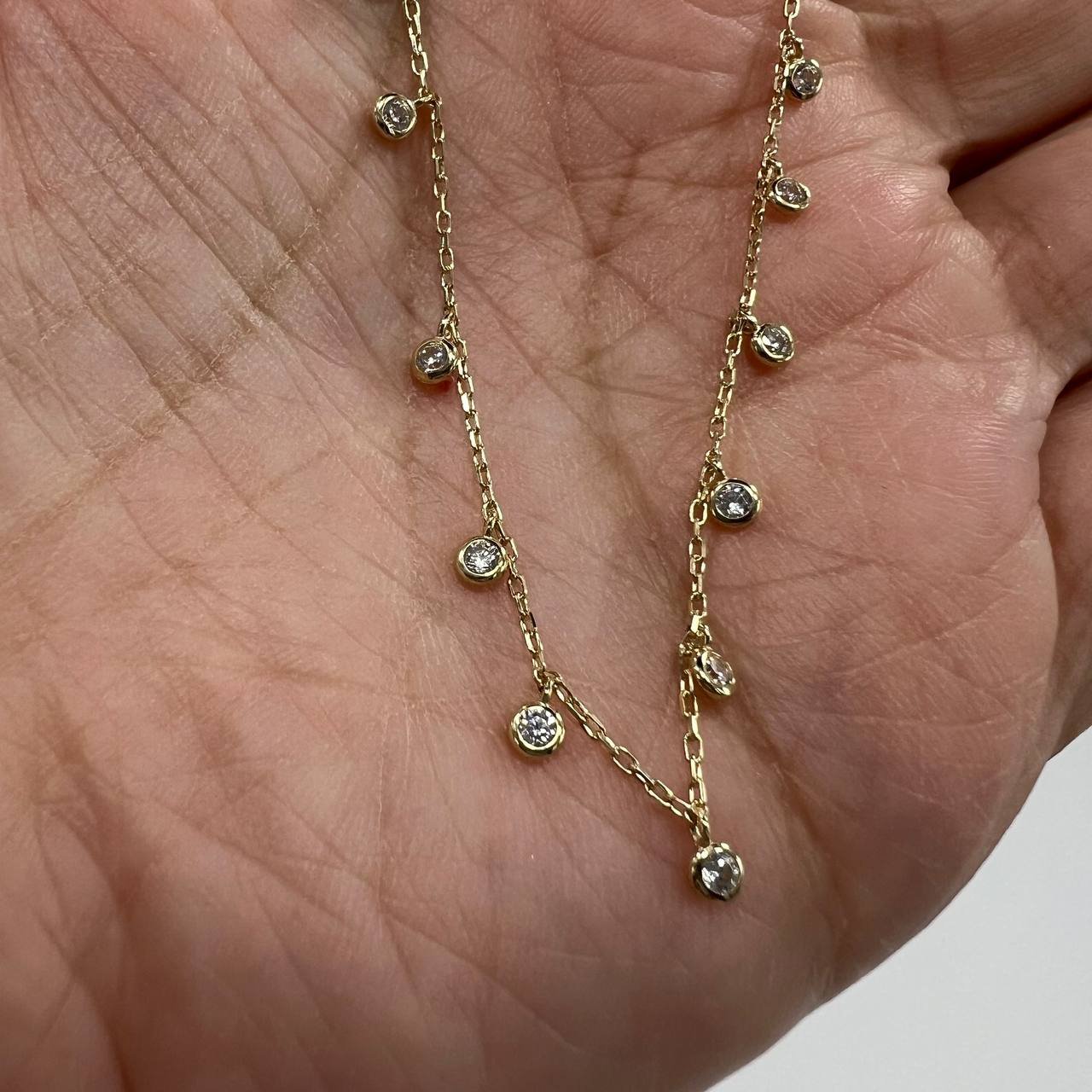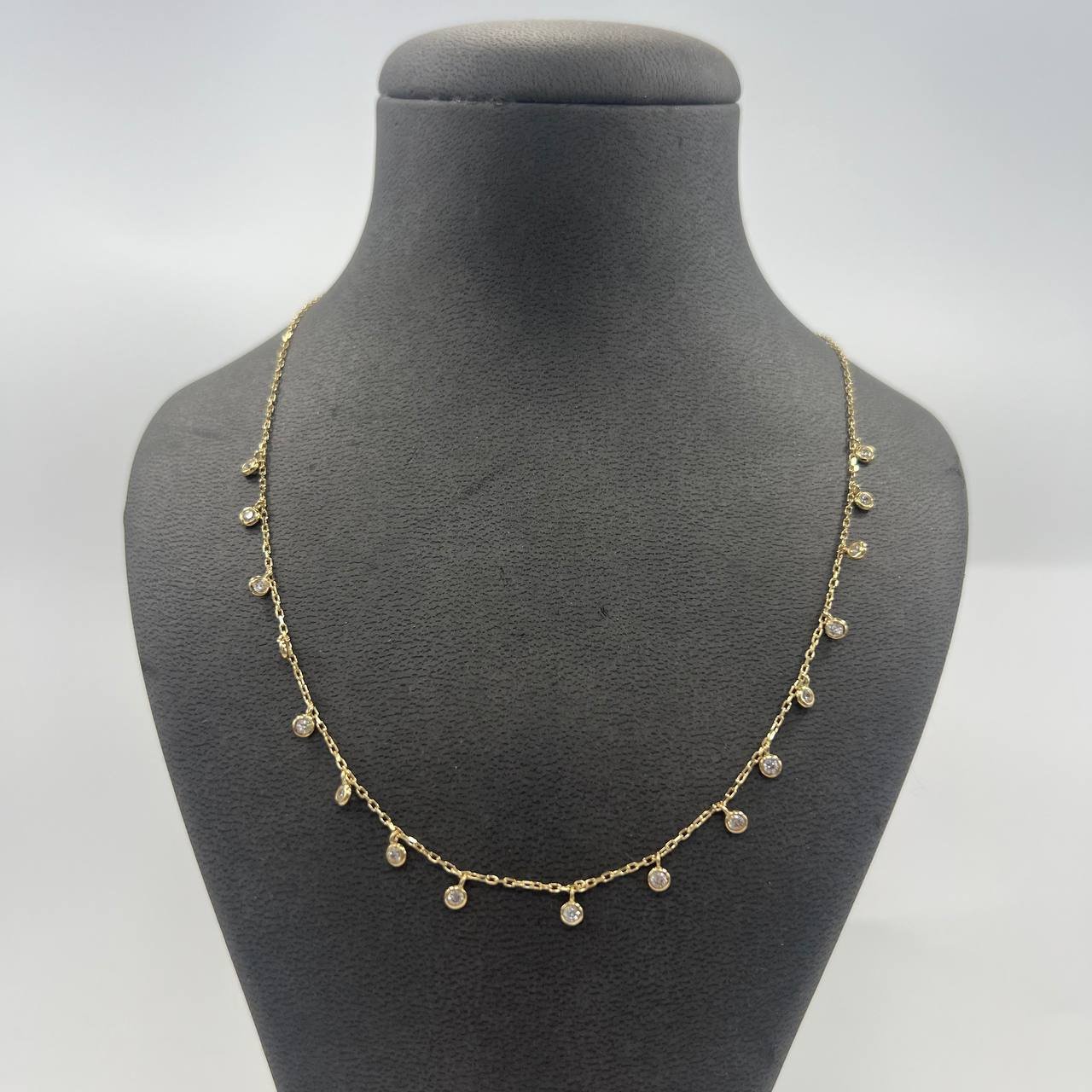 This refined 14K Solid Gold Necklace is a timeless piece of Italian craftsmanship, designed with a delicate chain featuring multiple bezel-set diamond-cut stones that shimmer with every movement. The evenly spaced gems create a luxurious station effect, adding a graceful sparkle and sophistication to your neckline.
